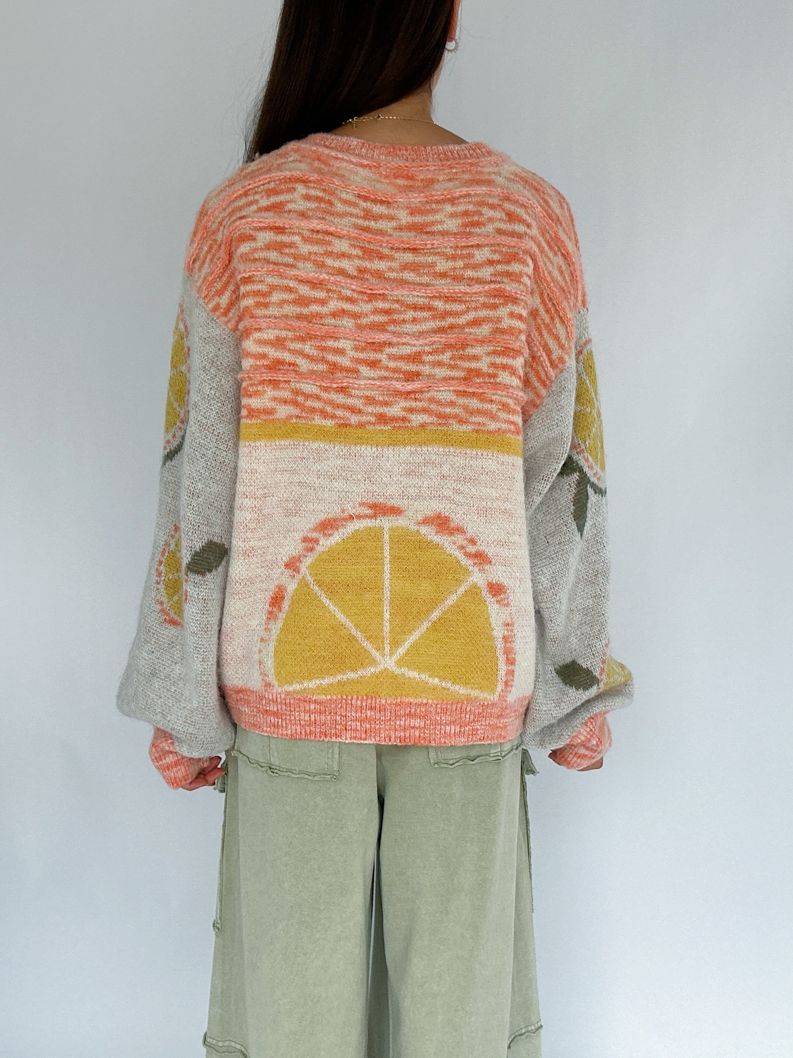 A little zesty, a little cozy—this is your sunshine-on-a-crisp-day kind of sweater. The Citrus Daydream Sweater brings a playful twist to your fall layers with its allover fruit motif and cheerful color palette. With cozy ribbed trim in orange and pink hues and a dreamy citrus slice detail on the back, this knit adds the perfect pop to denim, flowy pants, or your favorite lounge combo.