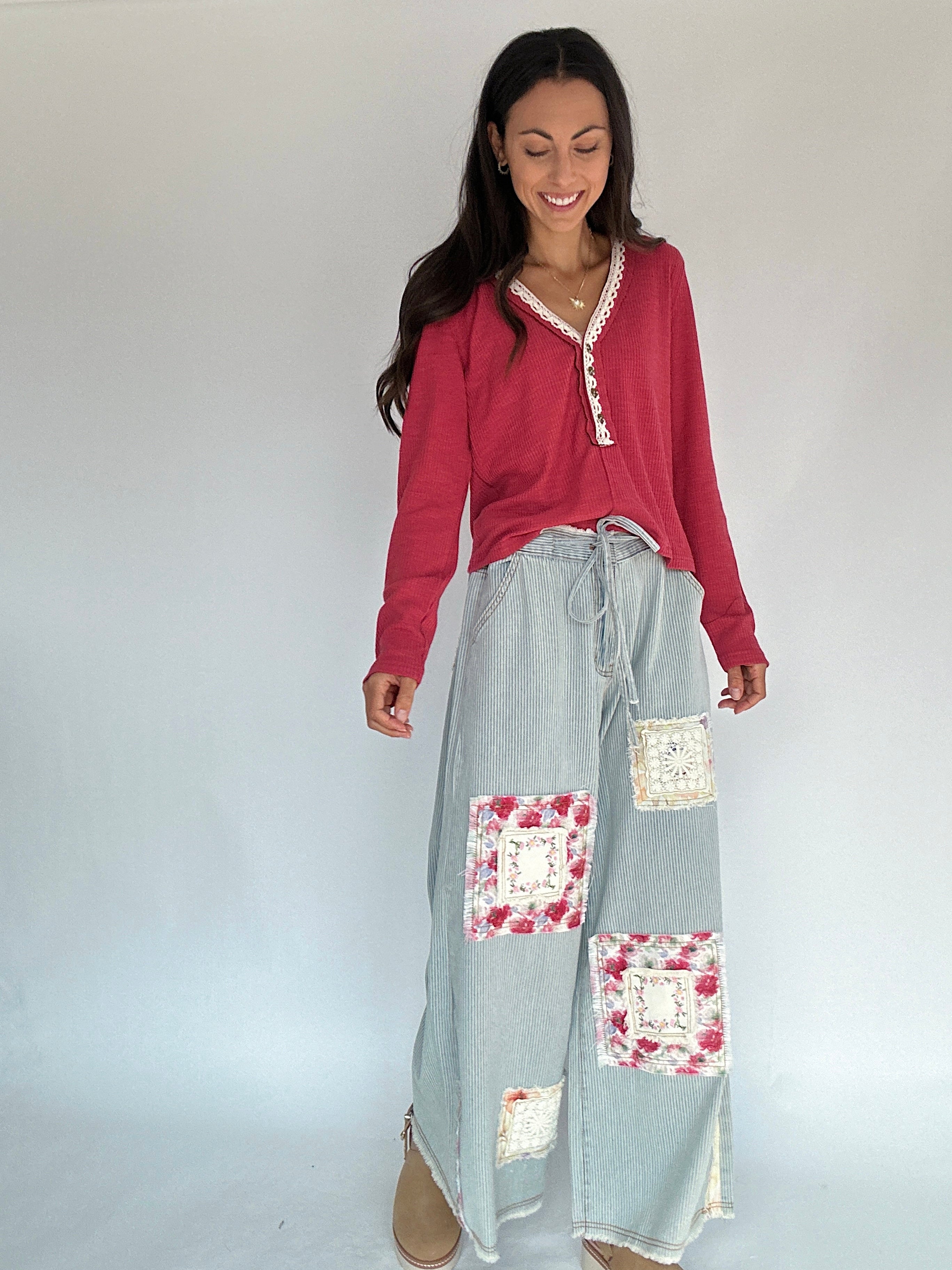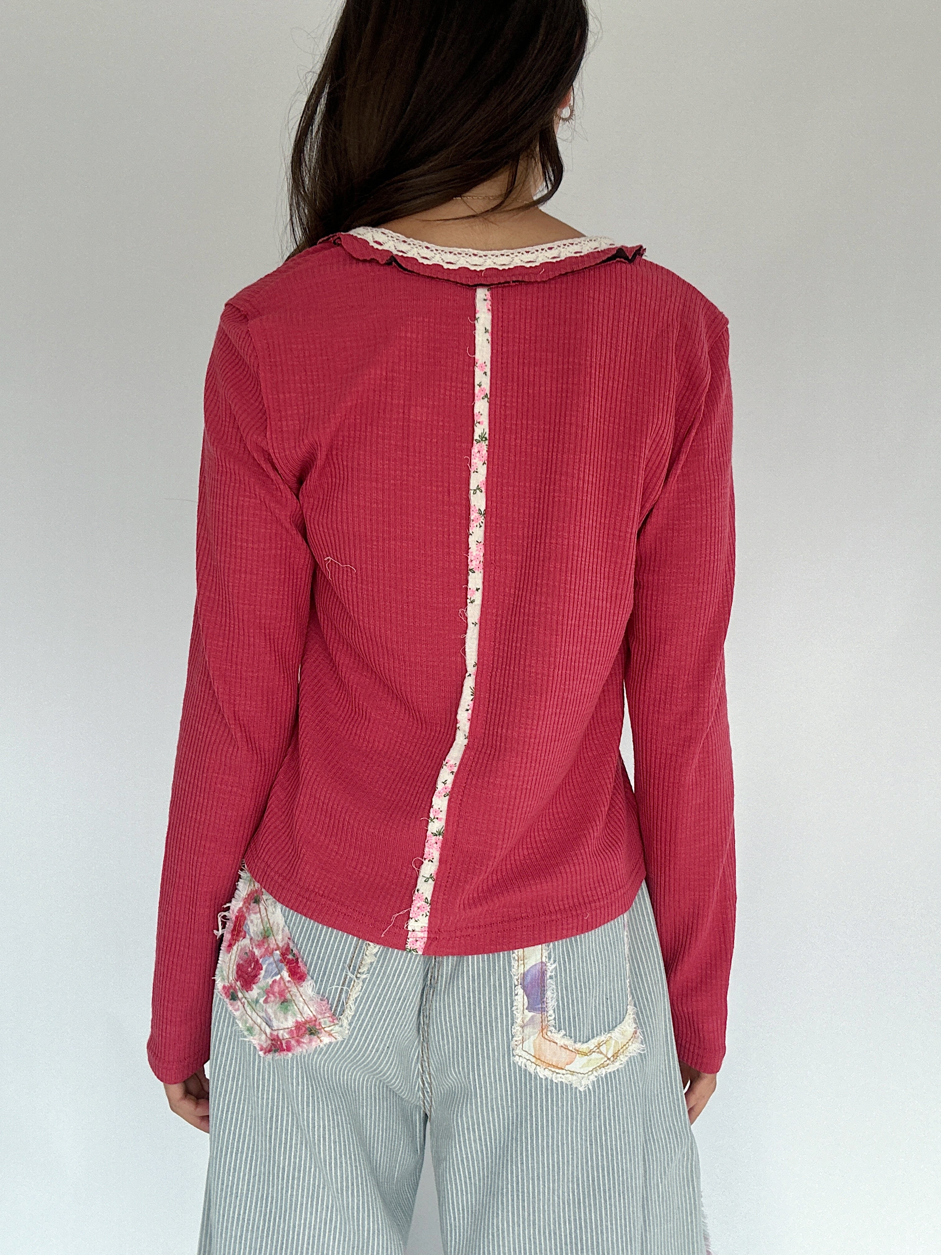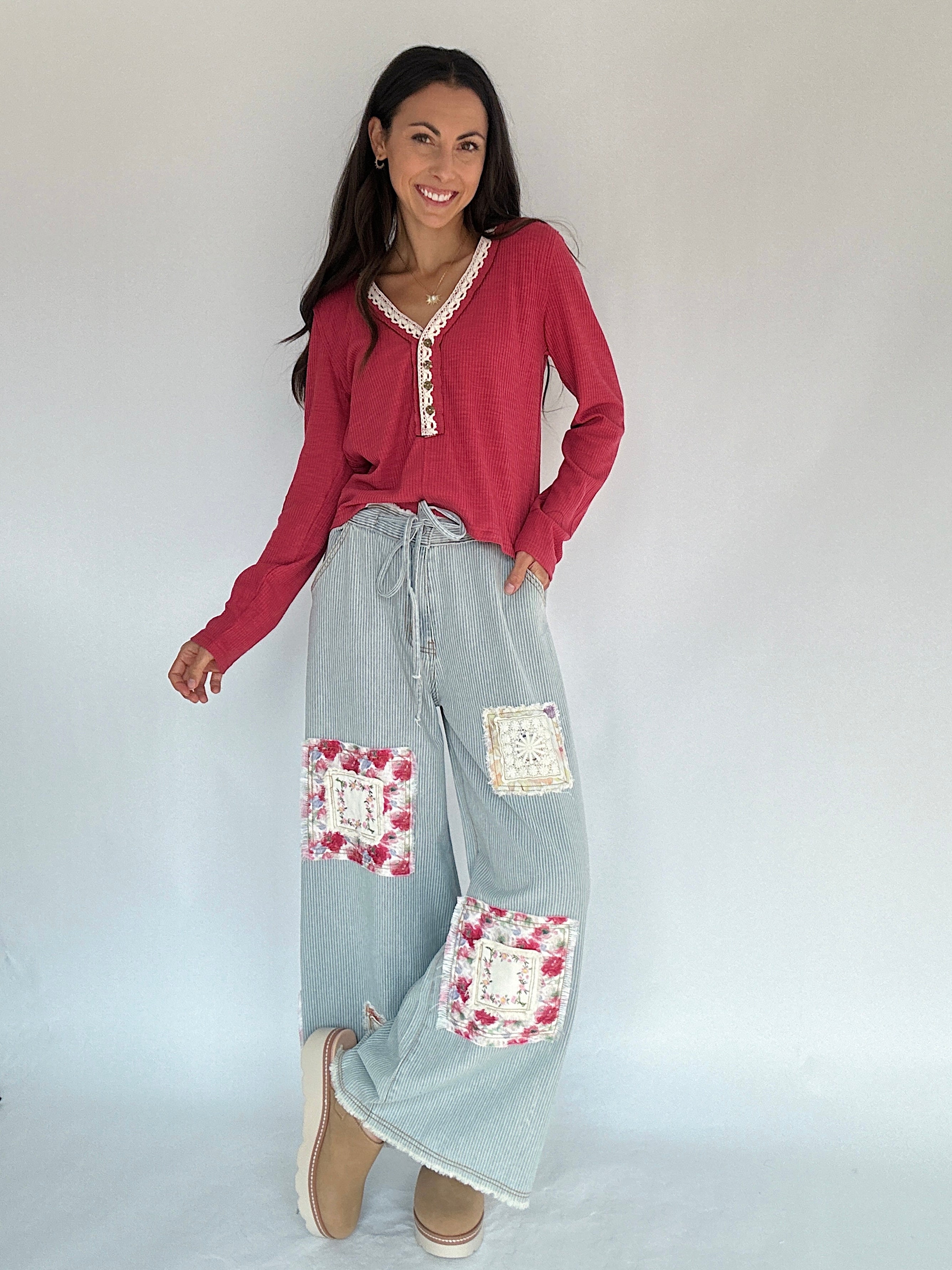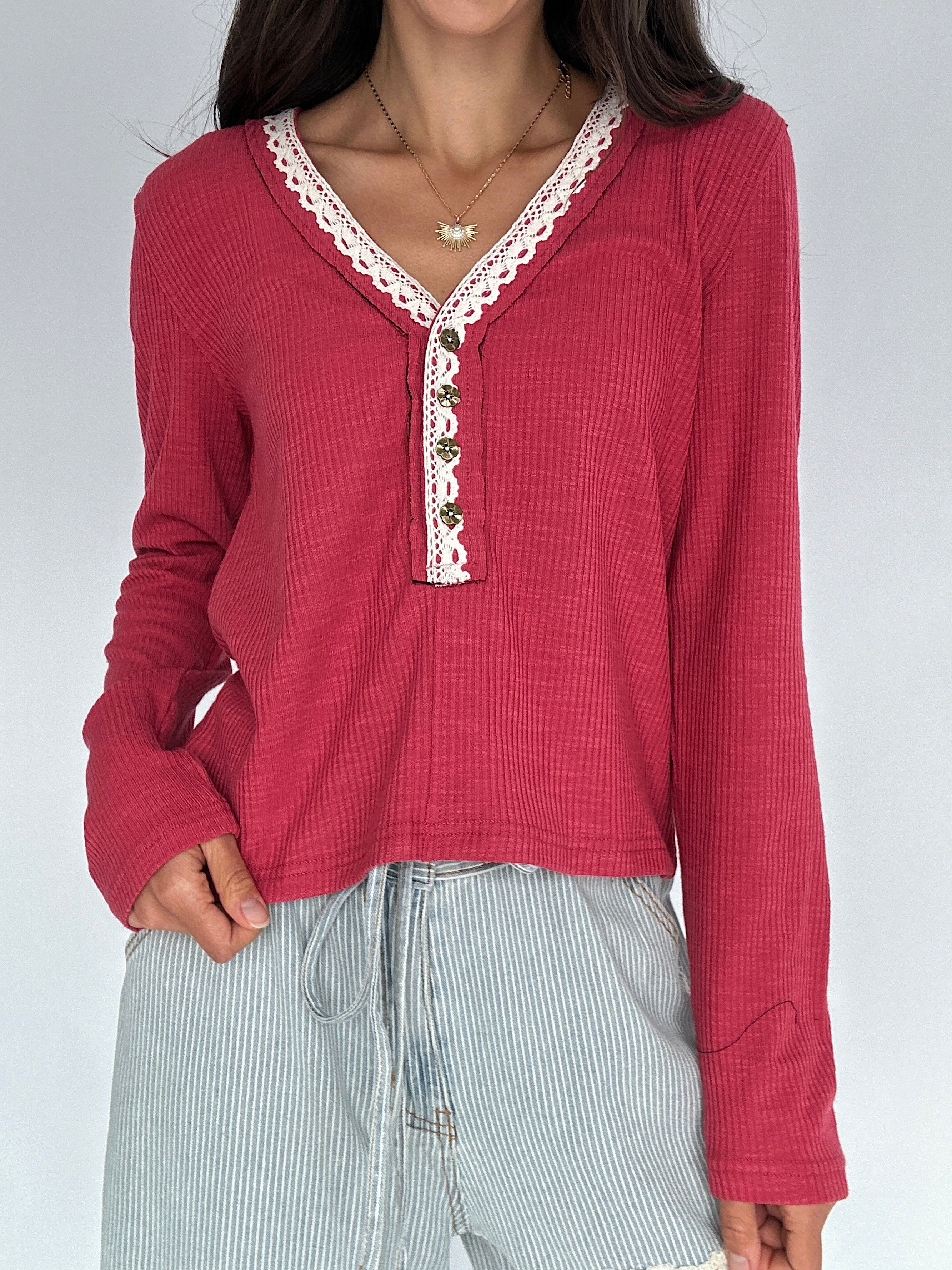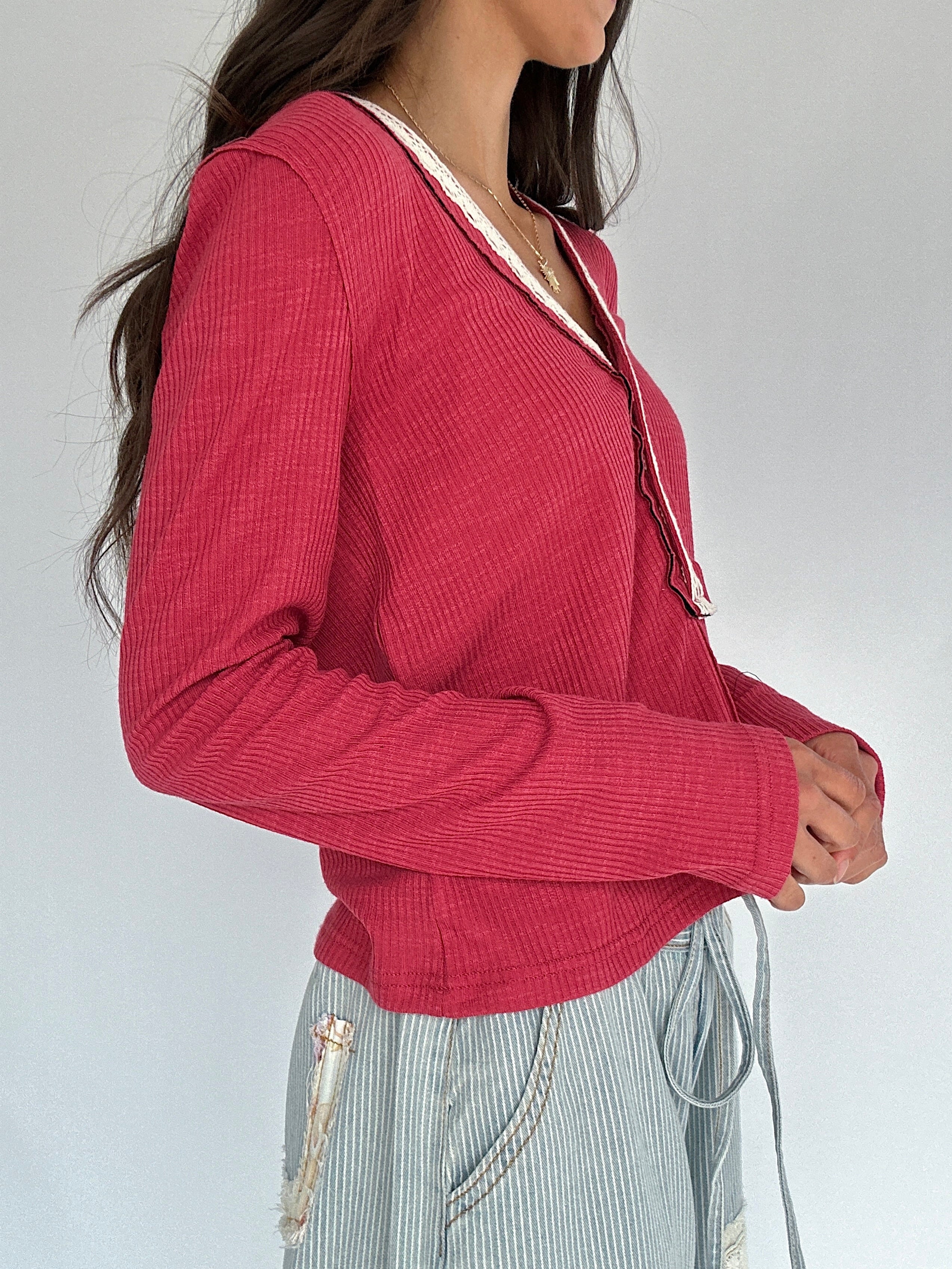 Perfect for layering on crisp mornings or pairing with your favorite jeans for a casual coffee run, the Final Chapter Long Sleeve Top brings timeless comfort with a subtle vintage touch. The raspberry rose hue is complemented by a lace trimmed henley-style neckline featuring delicate flower metal buttons, giving this ribbed top a refined, everyday charm. Its regular fit and soft rib texture make it a versatile staple you’ll reach for again and again!