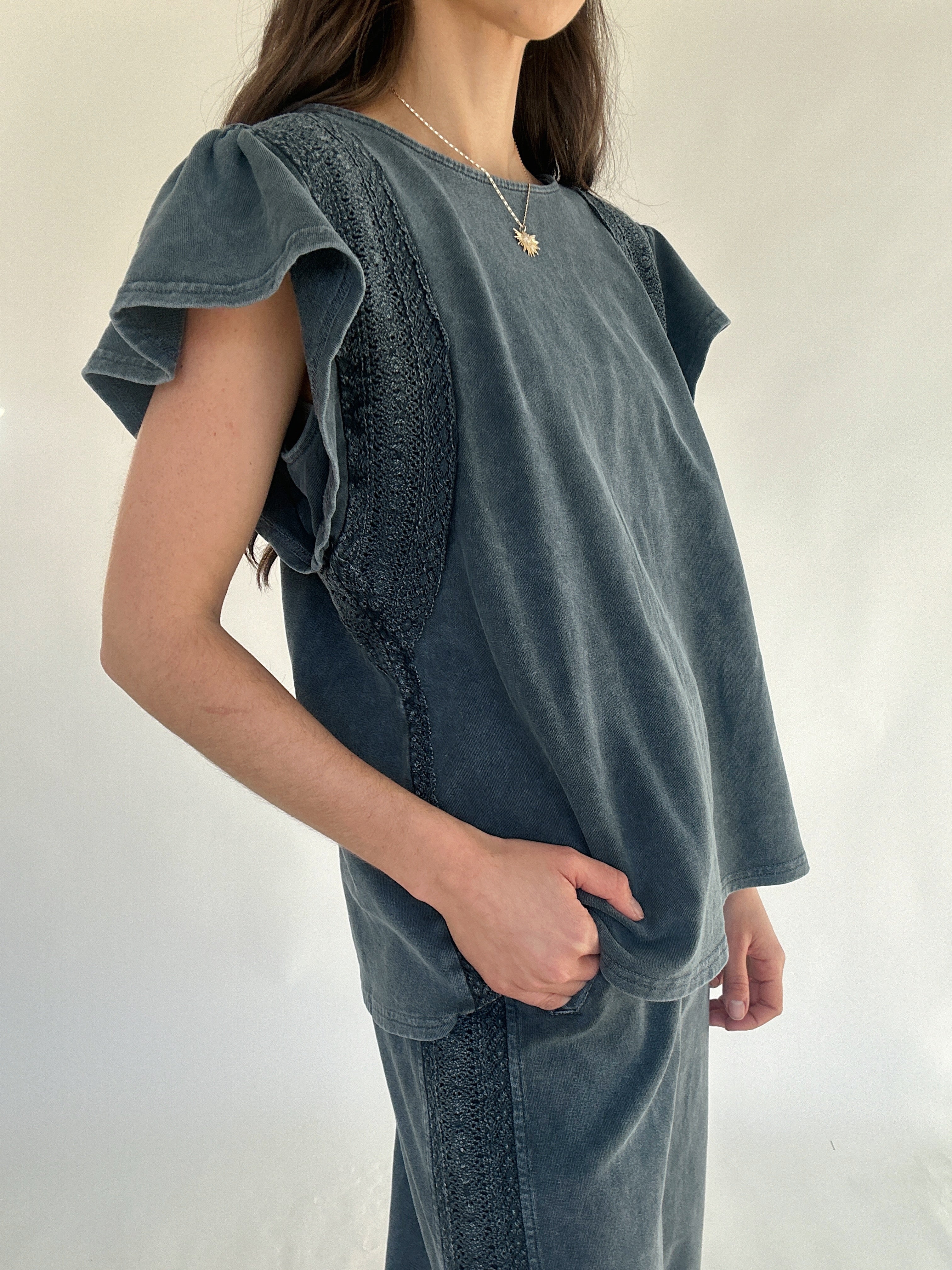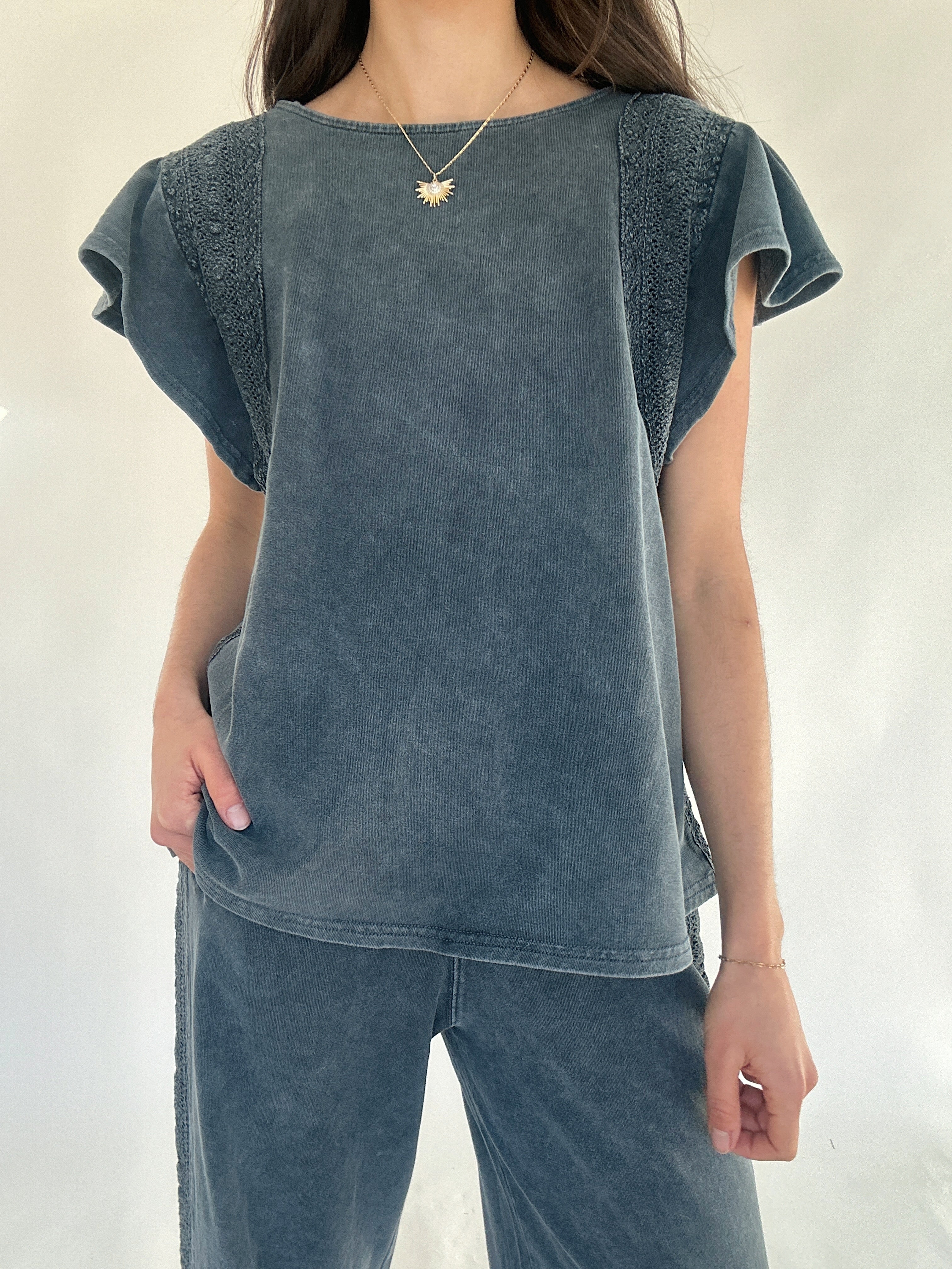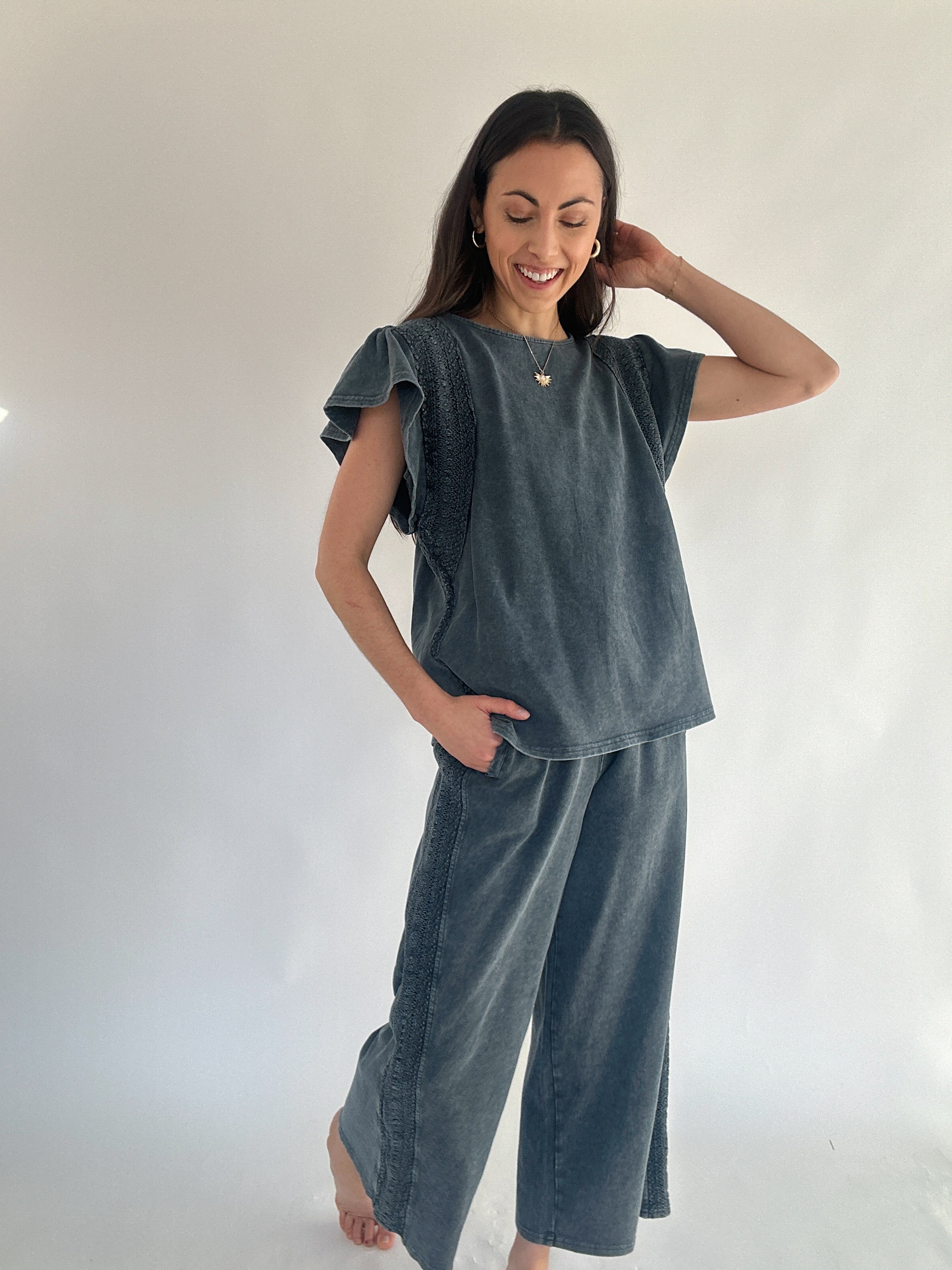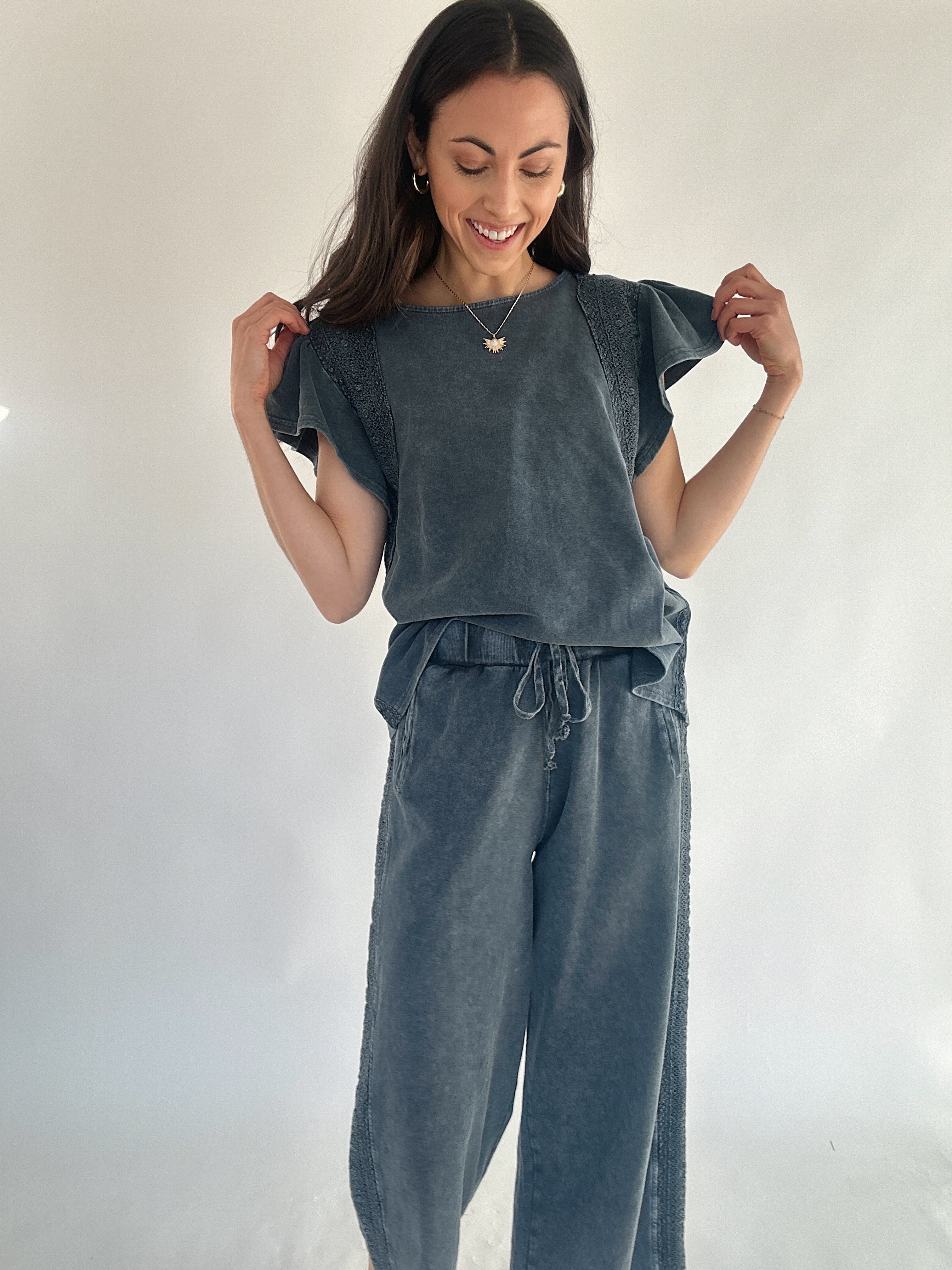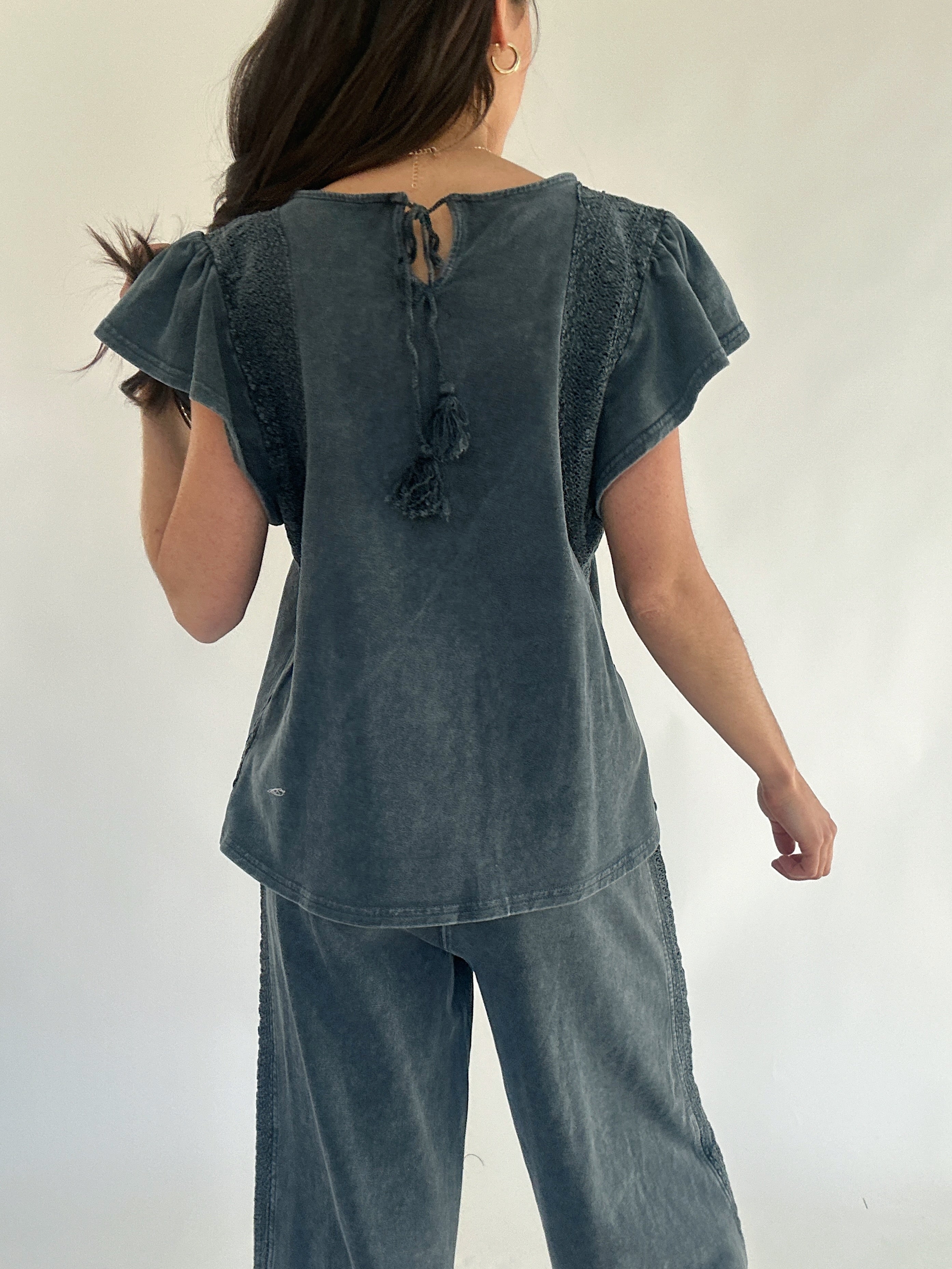 This black mineral washed top has winged ruffle sleeves with crochet lace accents and a back key hole with self tie. Match it with the Find A Way Wide Leg Pants for a cute set!