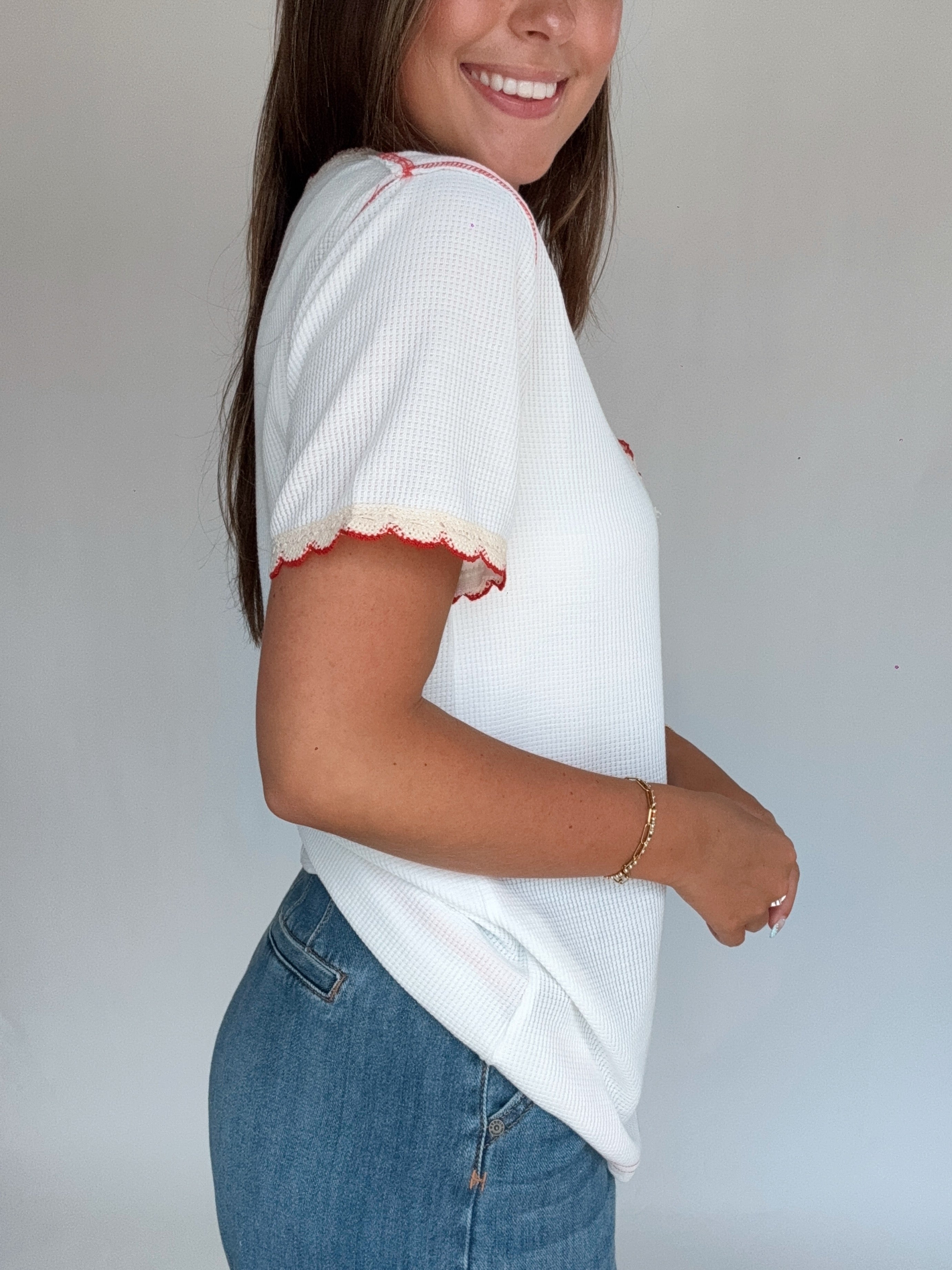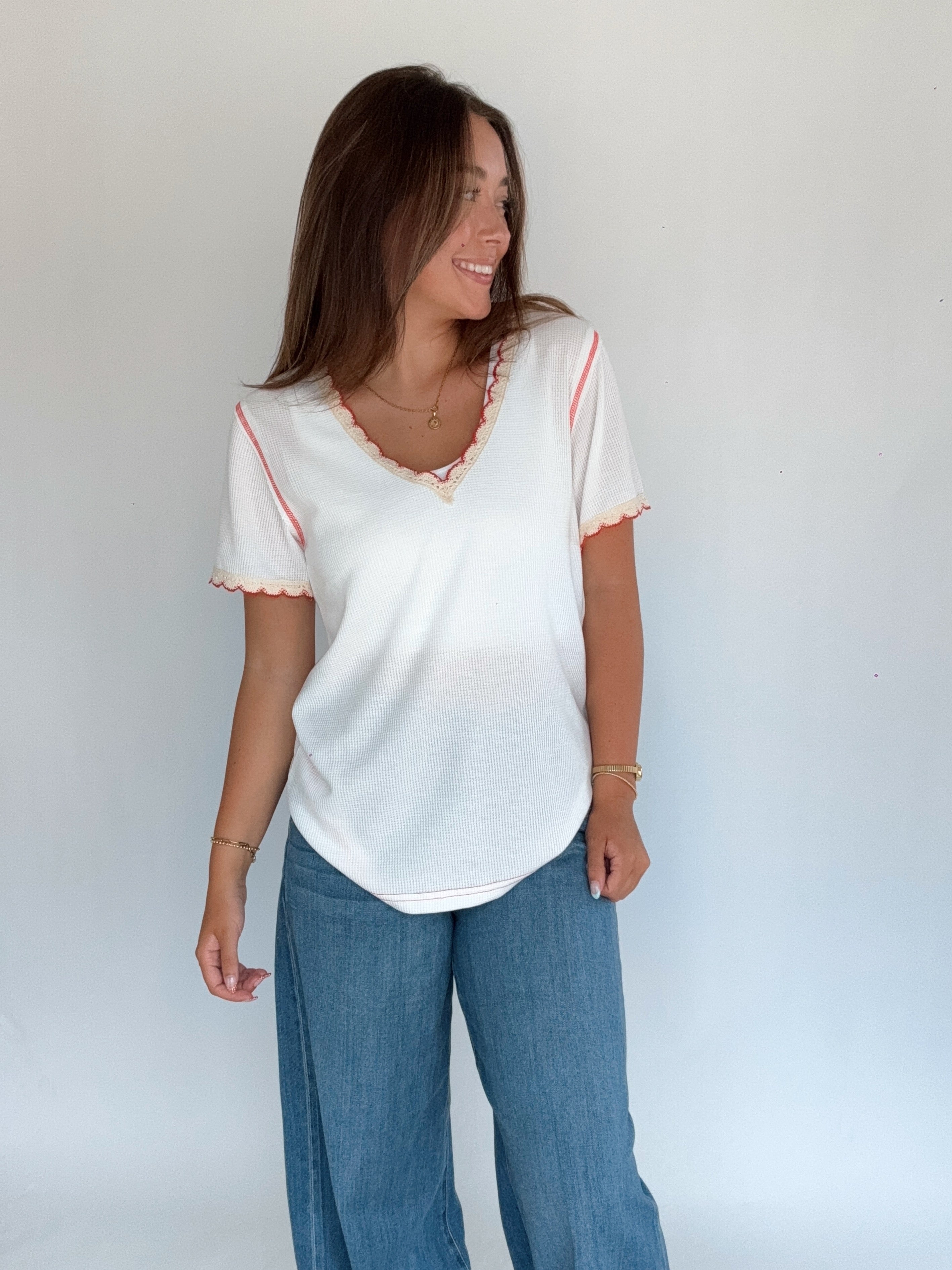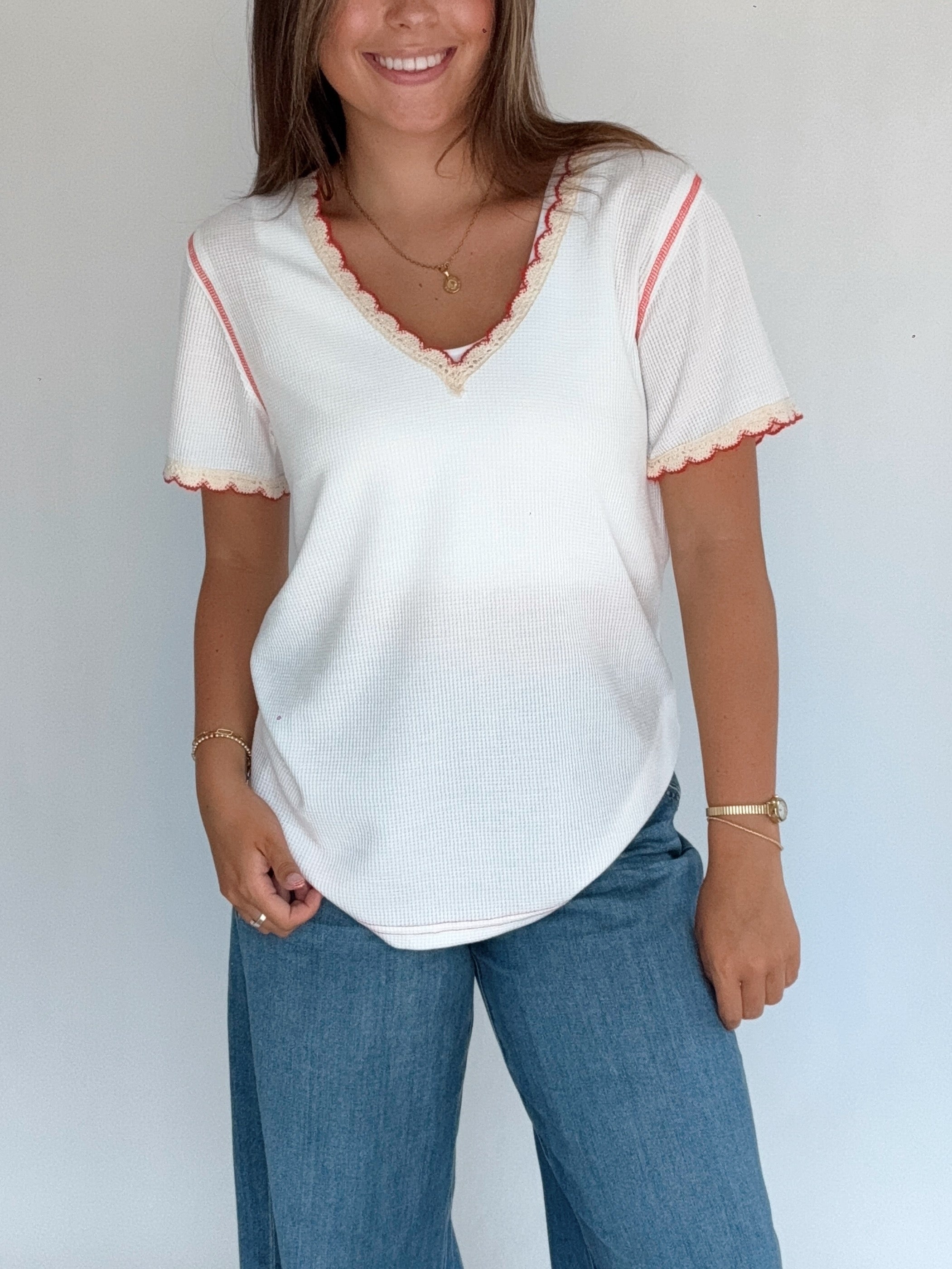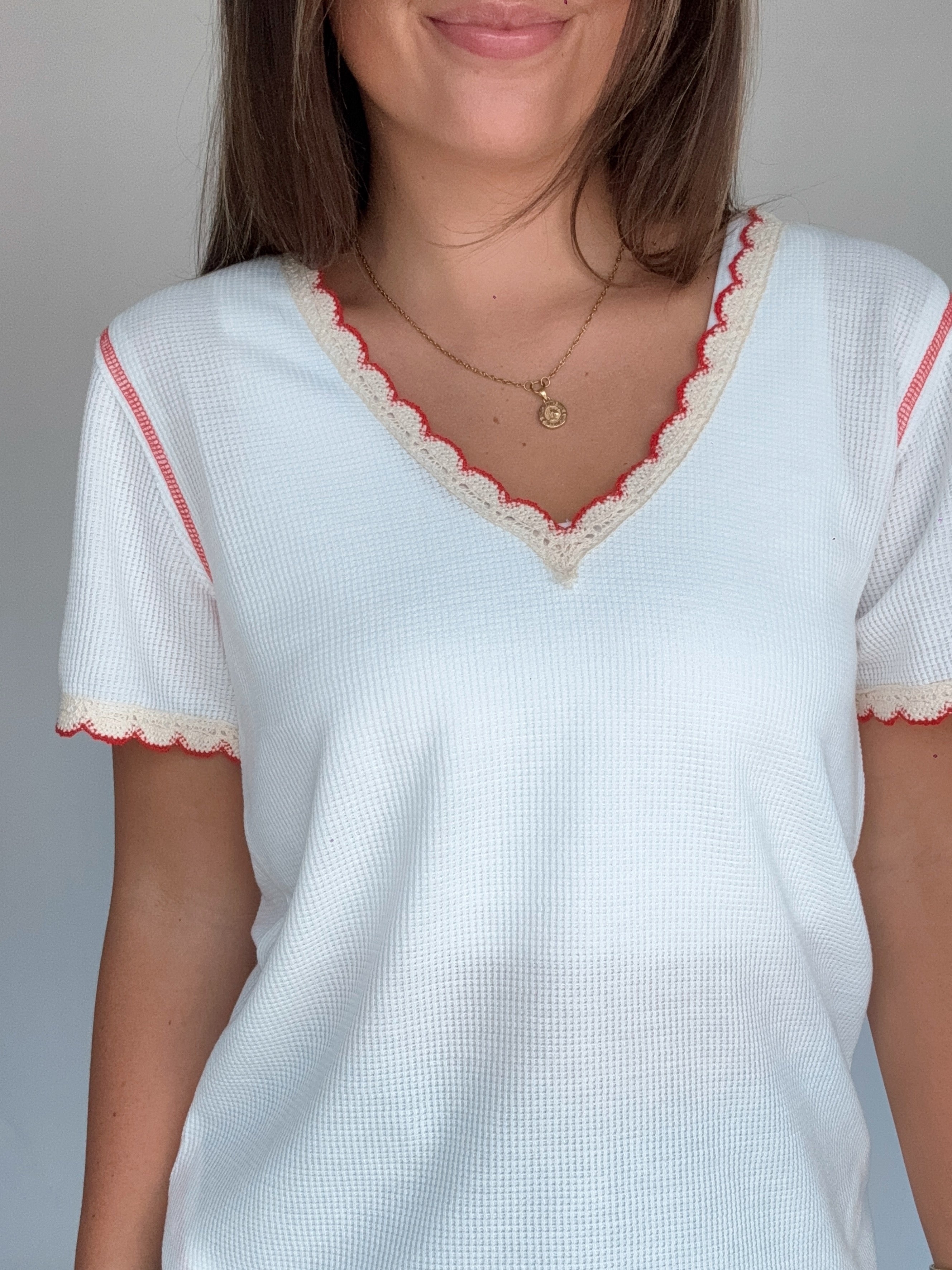 This off white waffle tee is a simple staple with the cutest details! It has contrast red stitching and scalloped lace edges along the v-neckline and short sleeve cuffs. Pair with your favorite denim for an easy backyard BBQ outfit or with a pair of boxer pants for a casual day out and about.