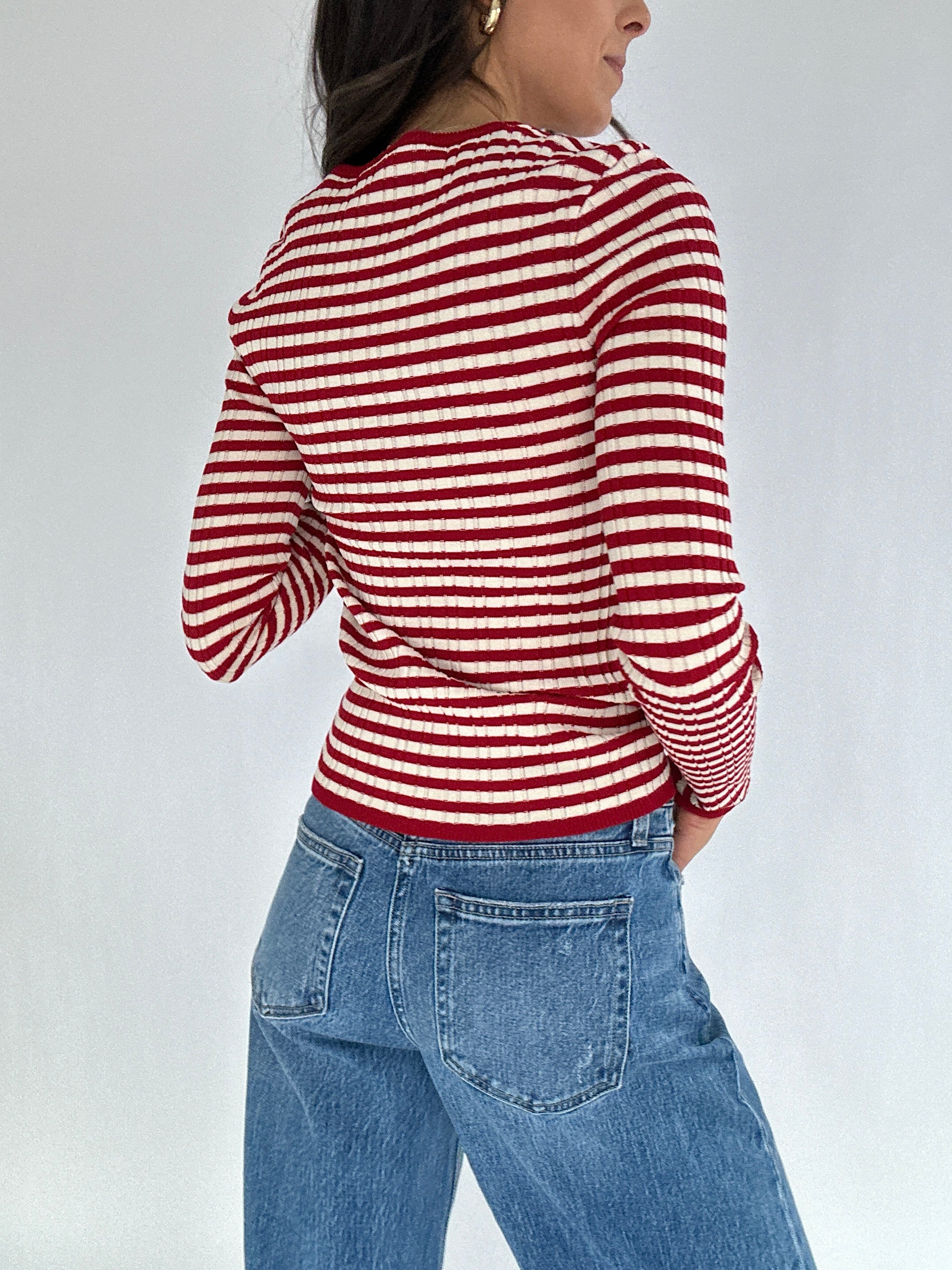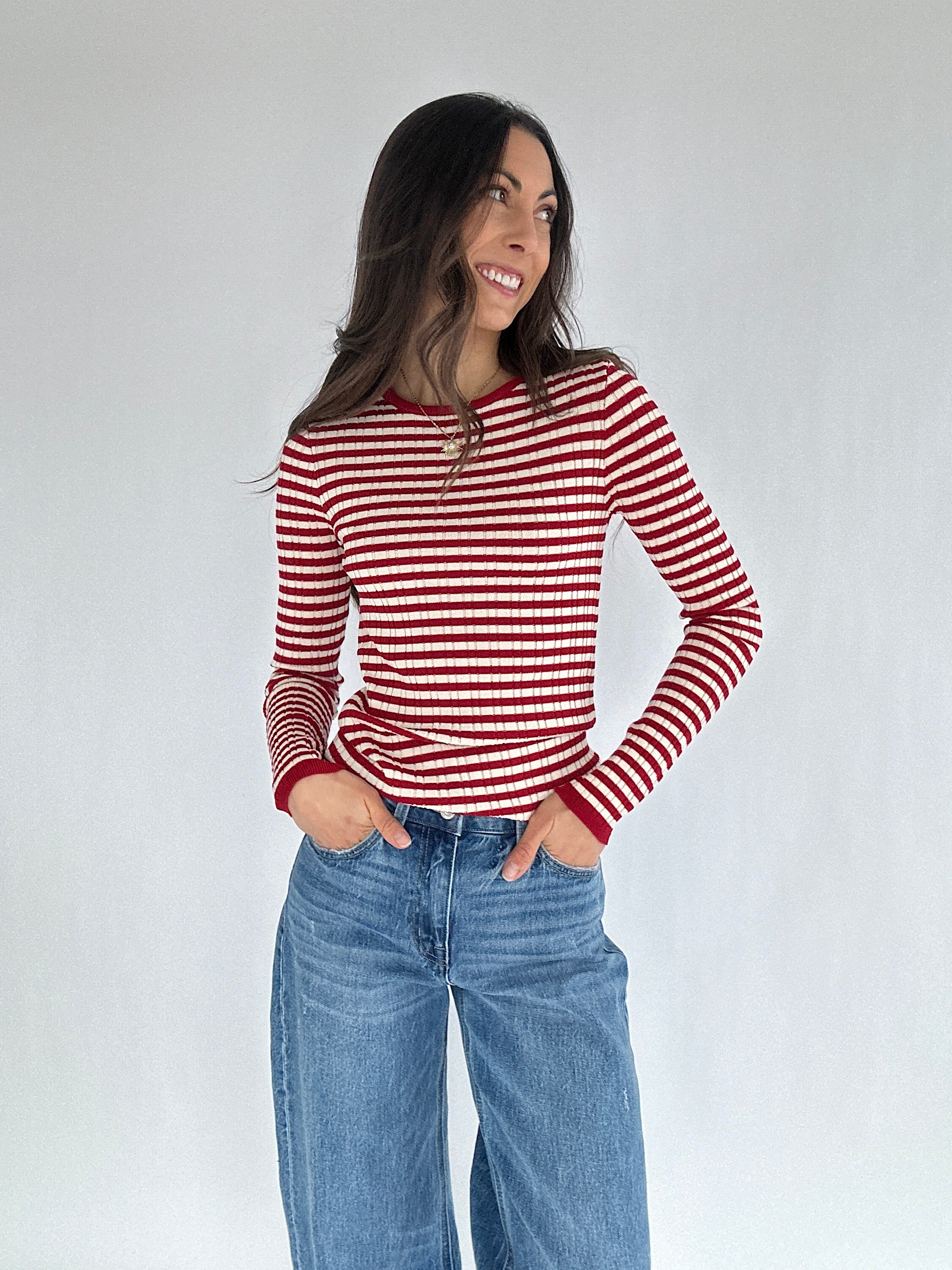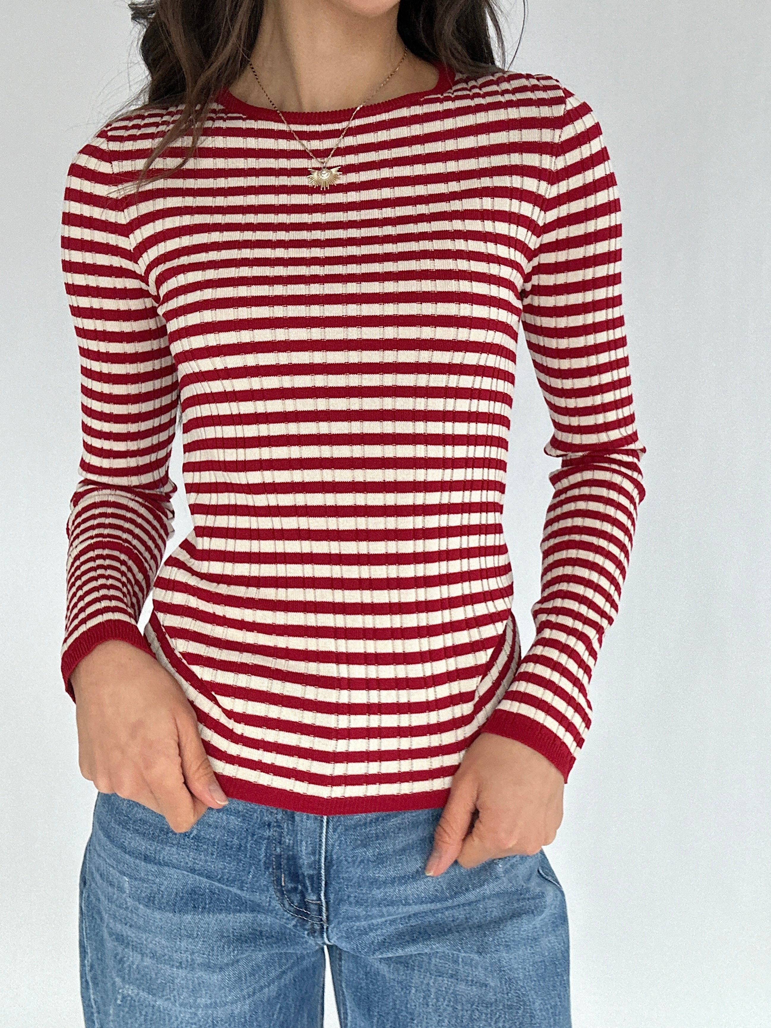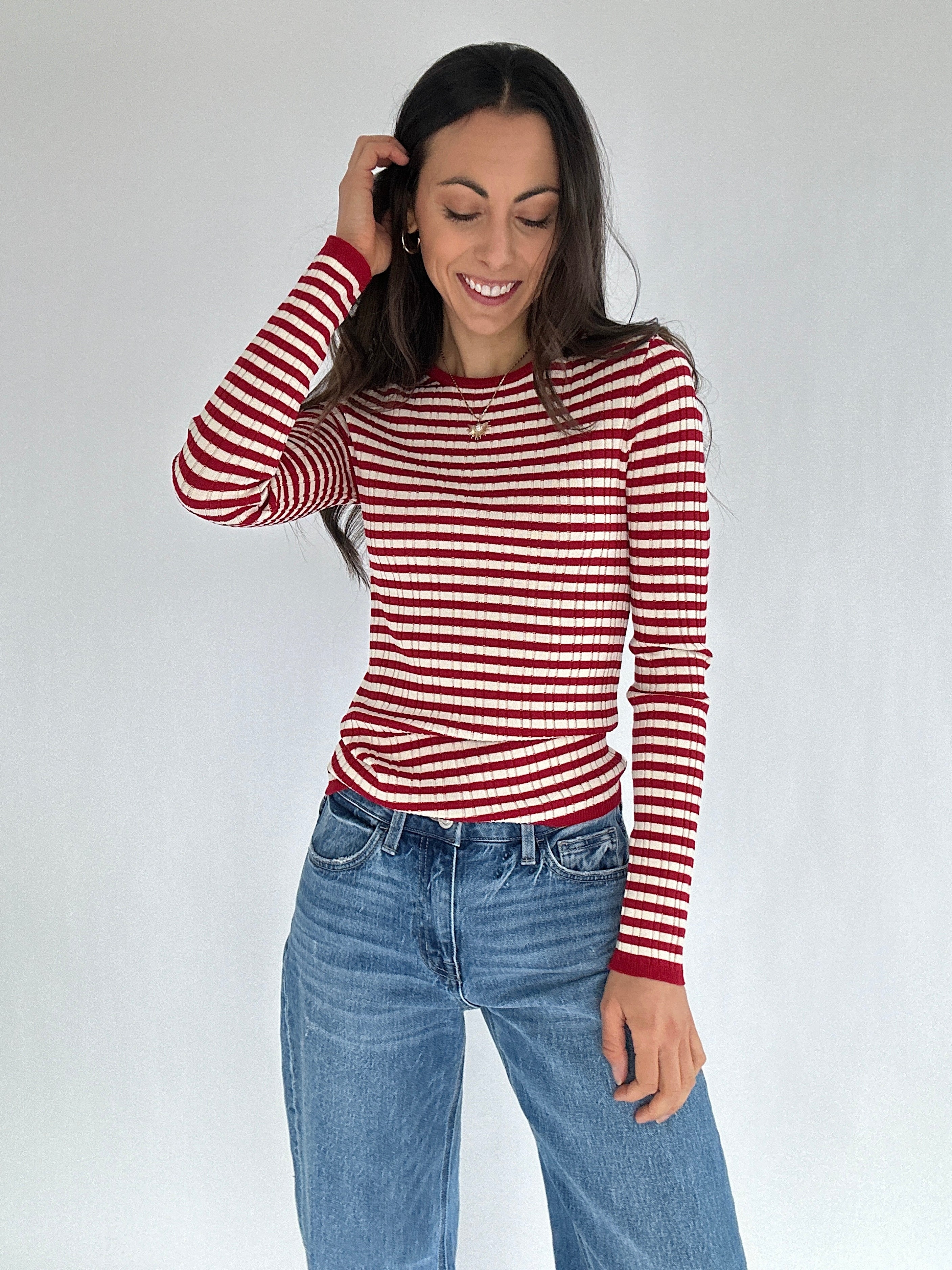 Perfect for layering under jackets, cardigans or just as an easy everyday top, the Hanna Striped Knit Top brings a clean, timeless look with its rib-knit horizontal stripes and sleek silhouette. The stretchy fabric and classic crew neckline make it an effortlessly comfy wardrobe staple you can wear from fall through spring!