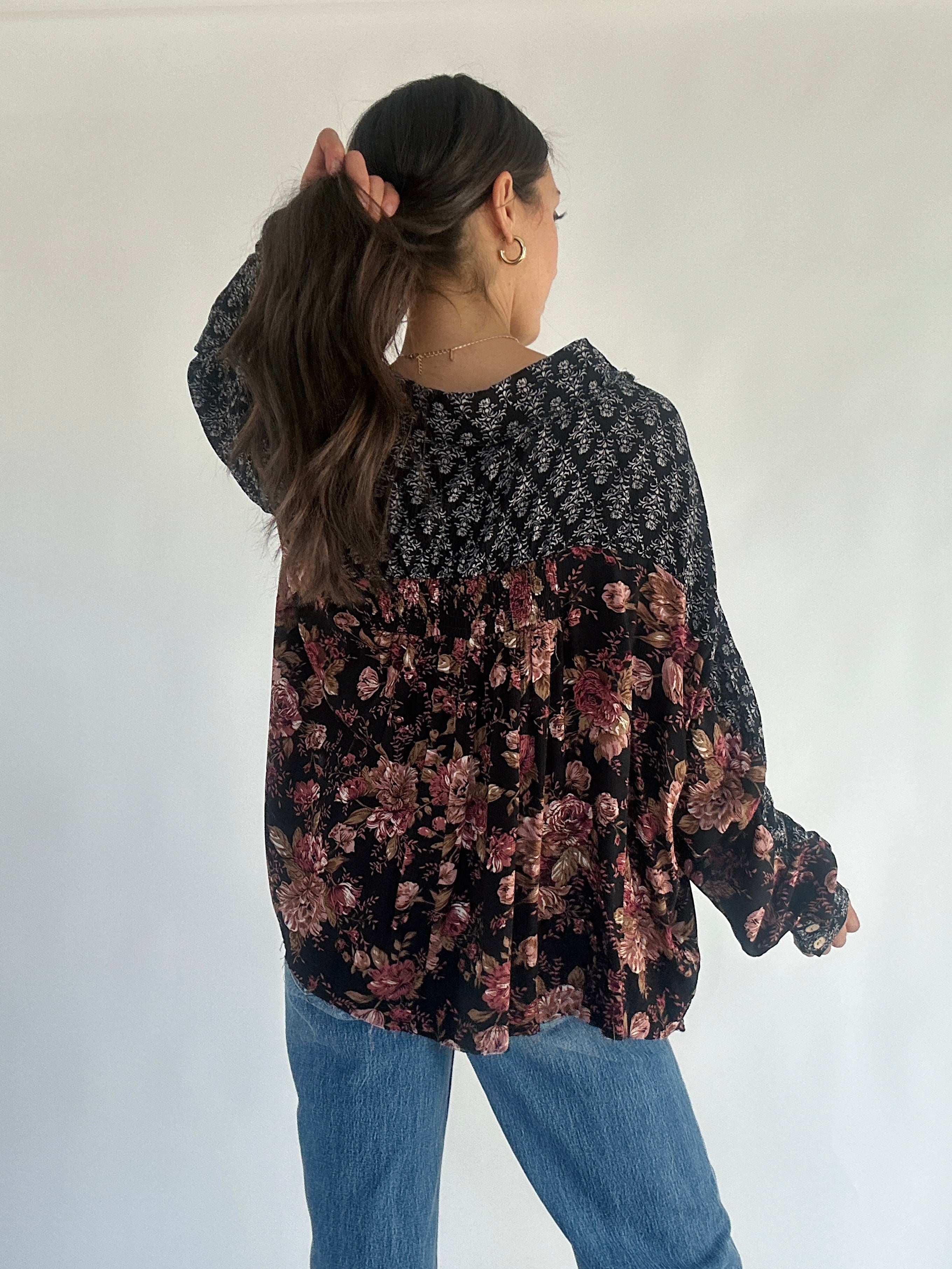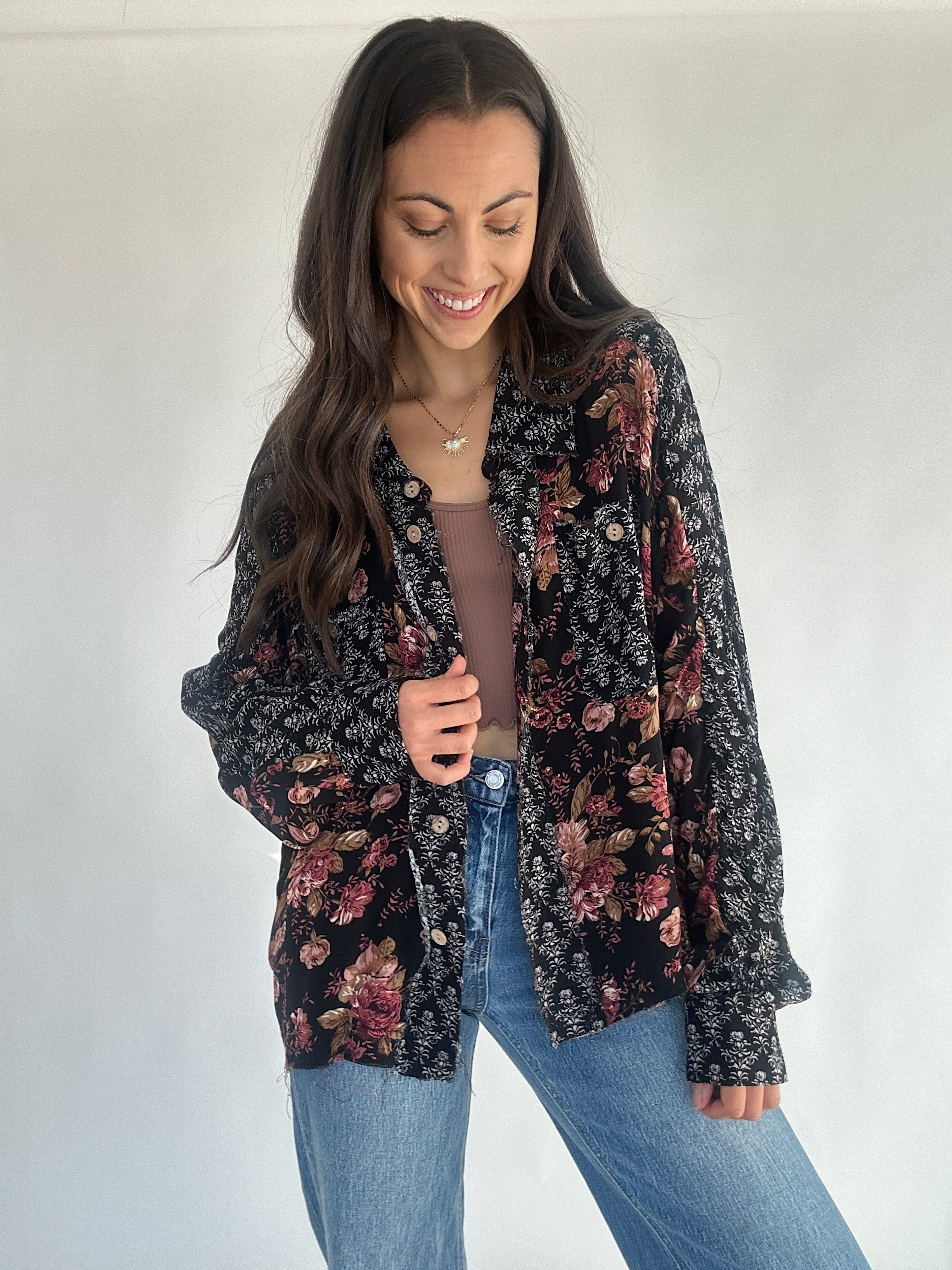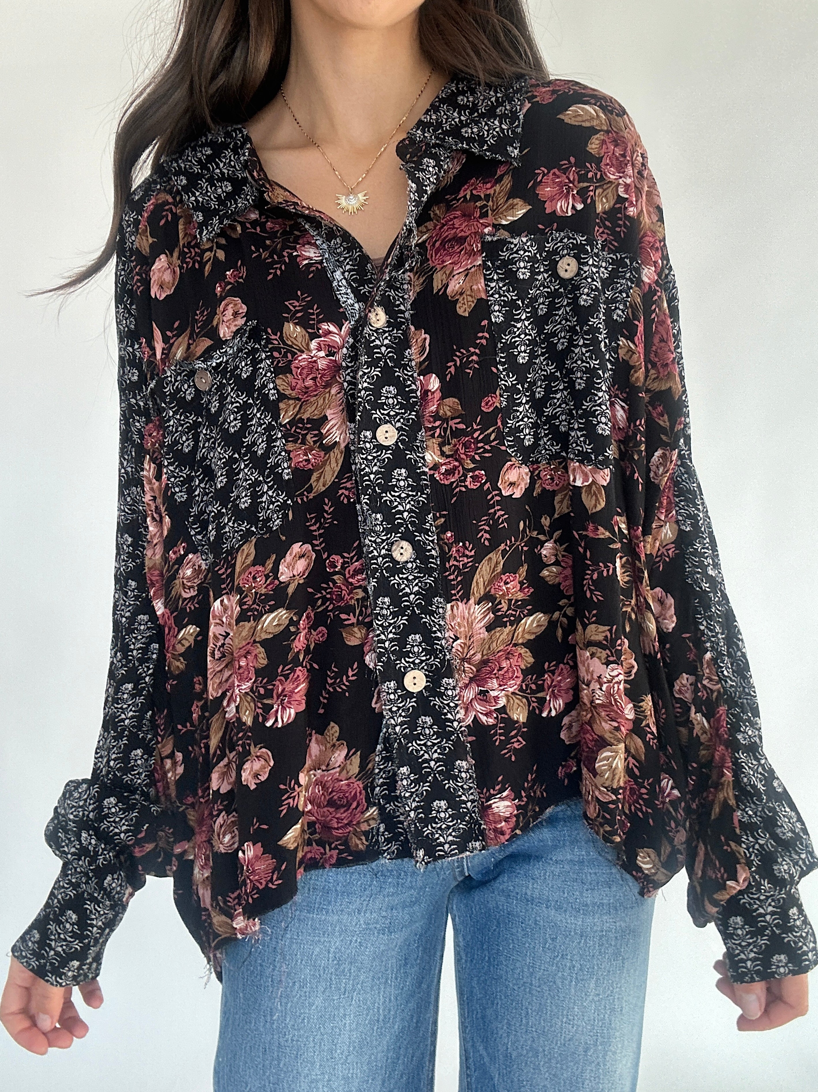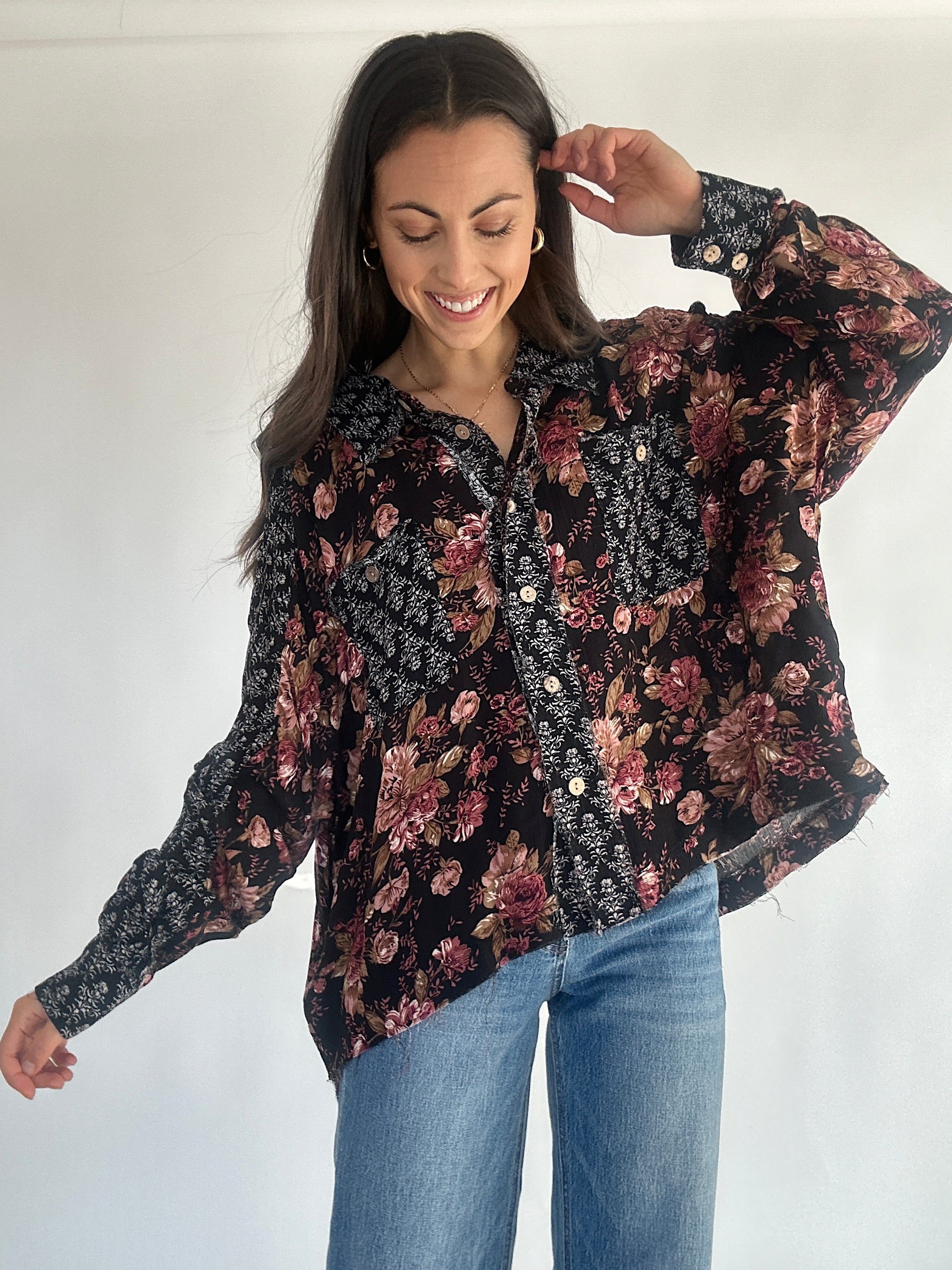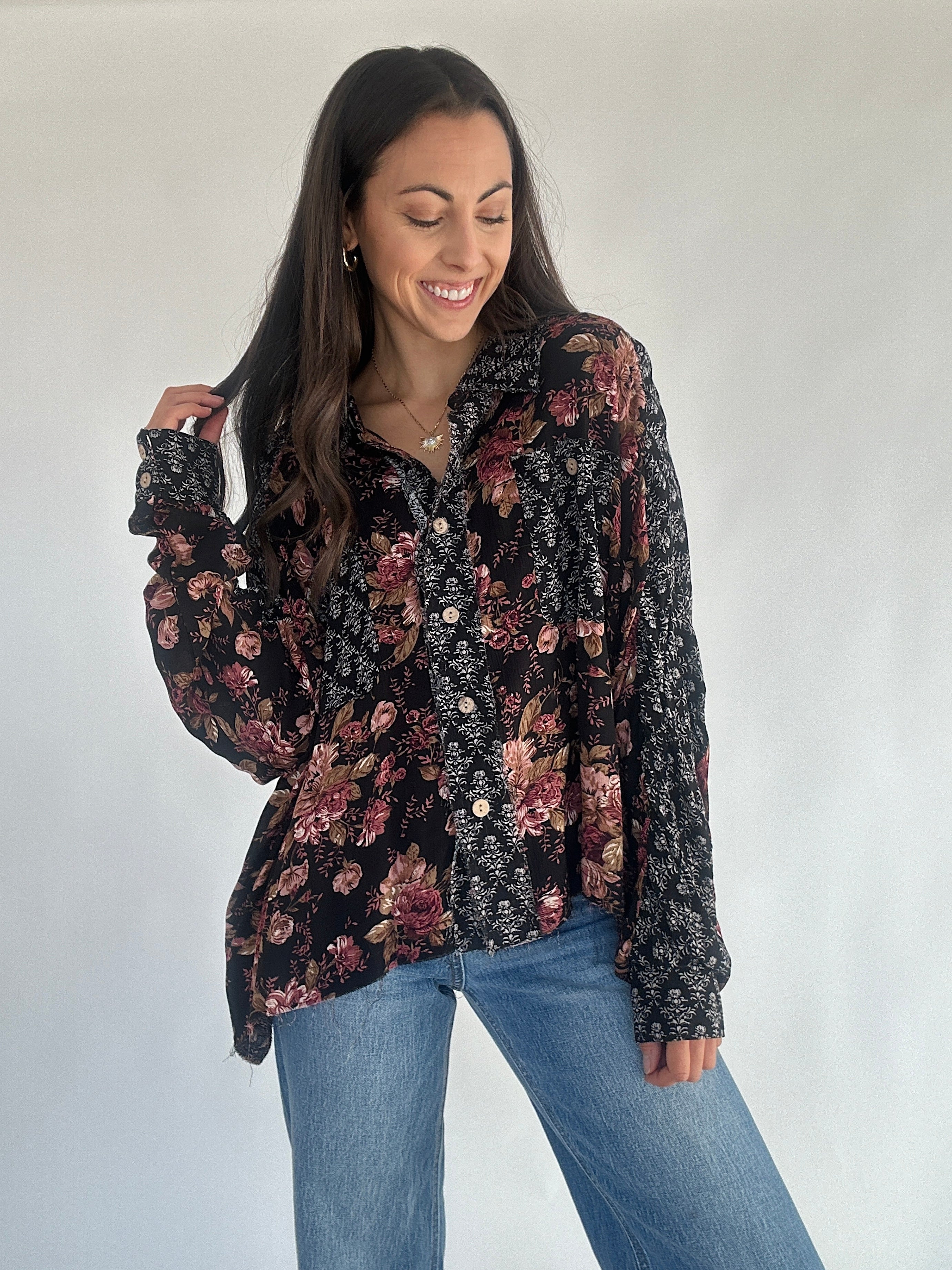 This black mixed patterned floral print top has a button front, collared neckline and relaxed fit. Pair it with trouser pants for a cute work look or wear it with some denim for a casual outfit!