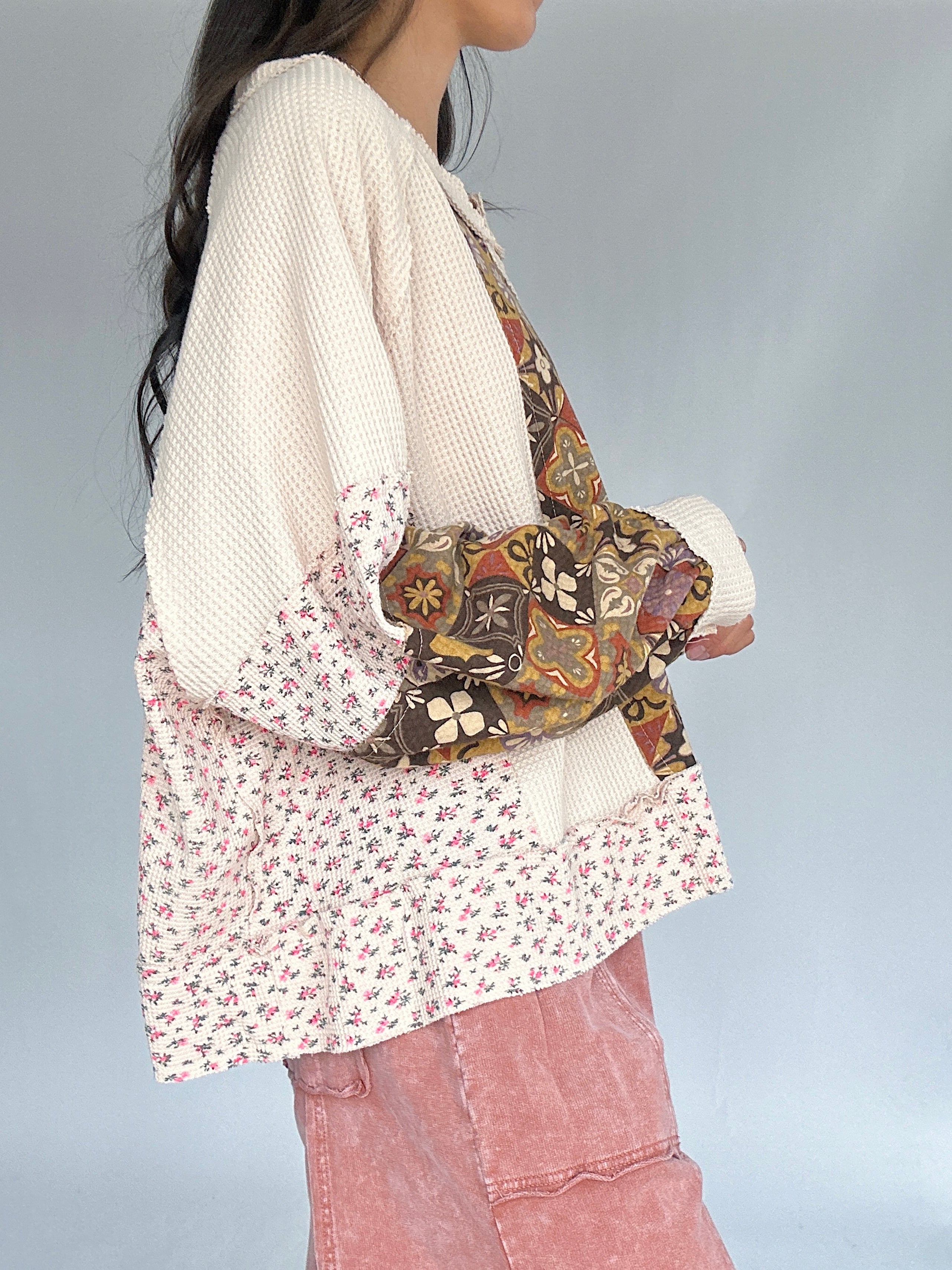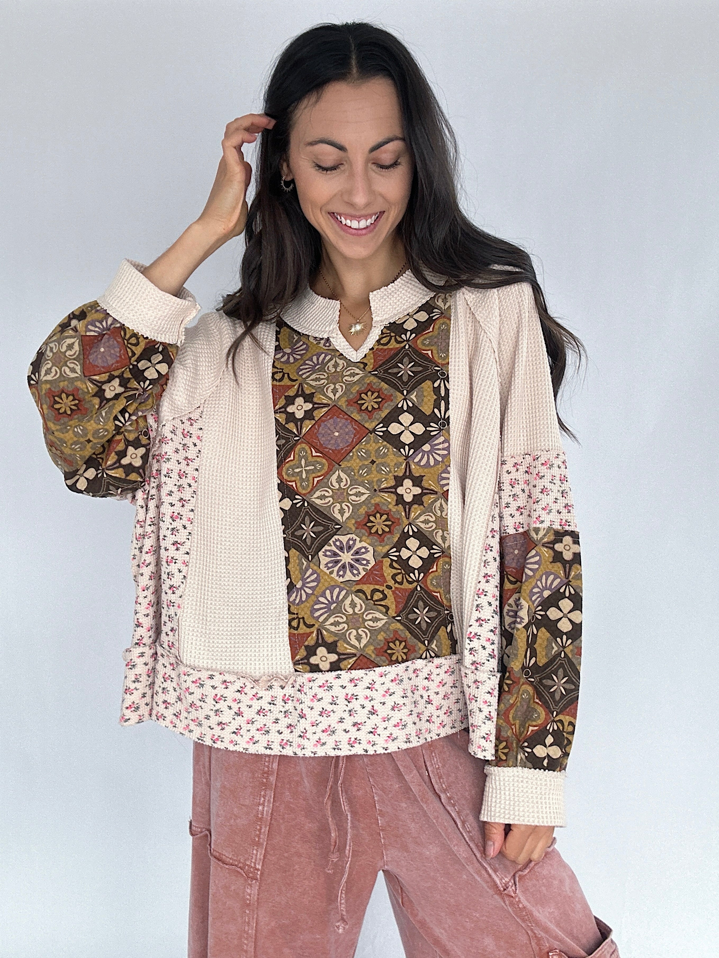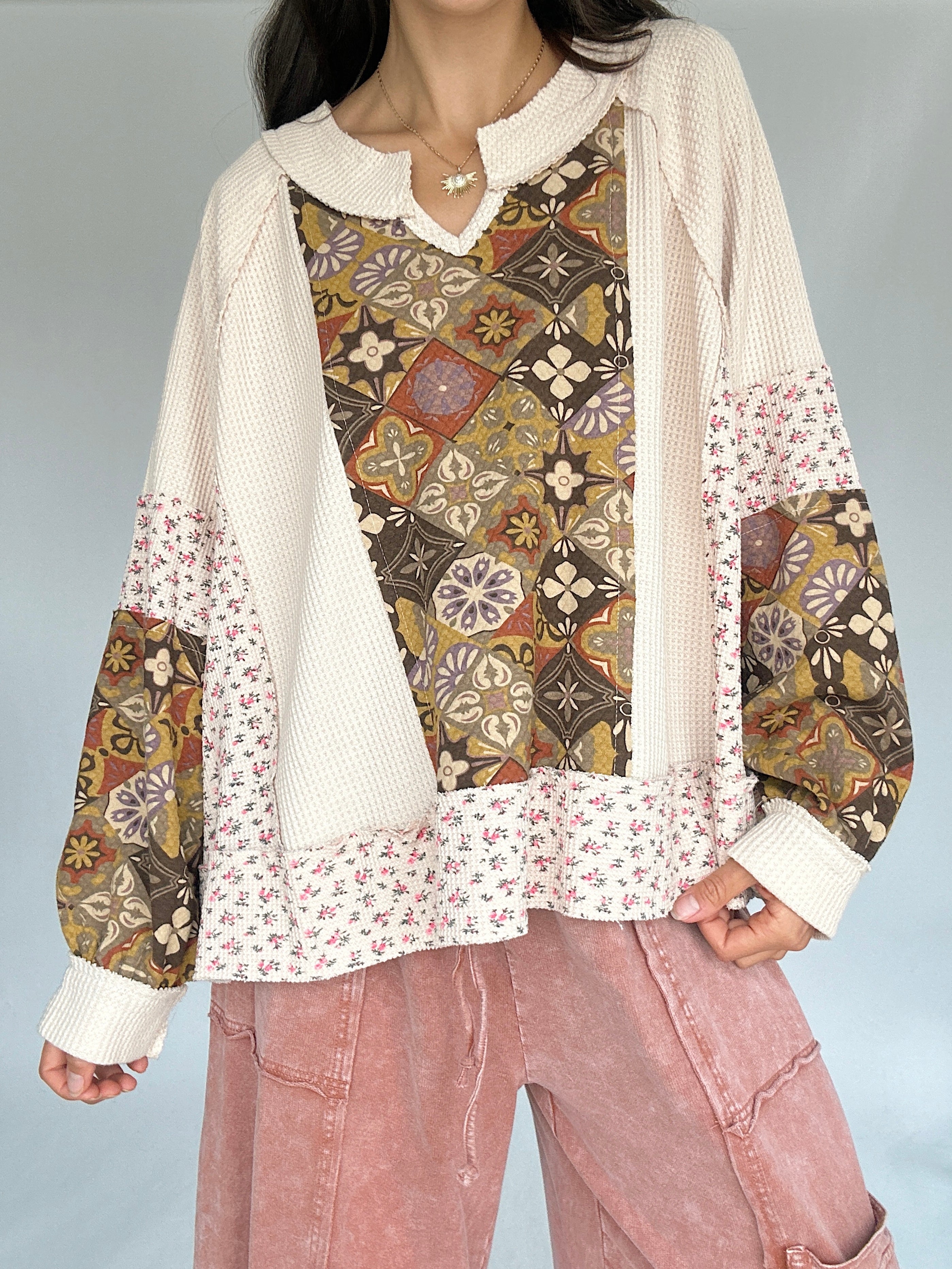 This long sleeve thermal top is adorable for a casual autumn day with a pair of your favorite jeans! It has warm toned boho inspired panels mixed with dainty floral contrasting and exposed seams. The notched neckline, raglan sleeves and slightly boxy fit makes it slouchy and so comfortable for an all day wear! Pro tip - change the jeans for a pair of wide leg sweatpants to make it a lounge outfit!