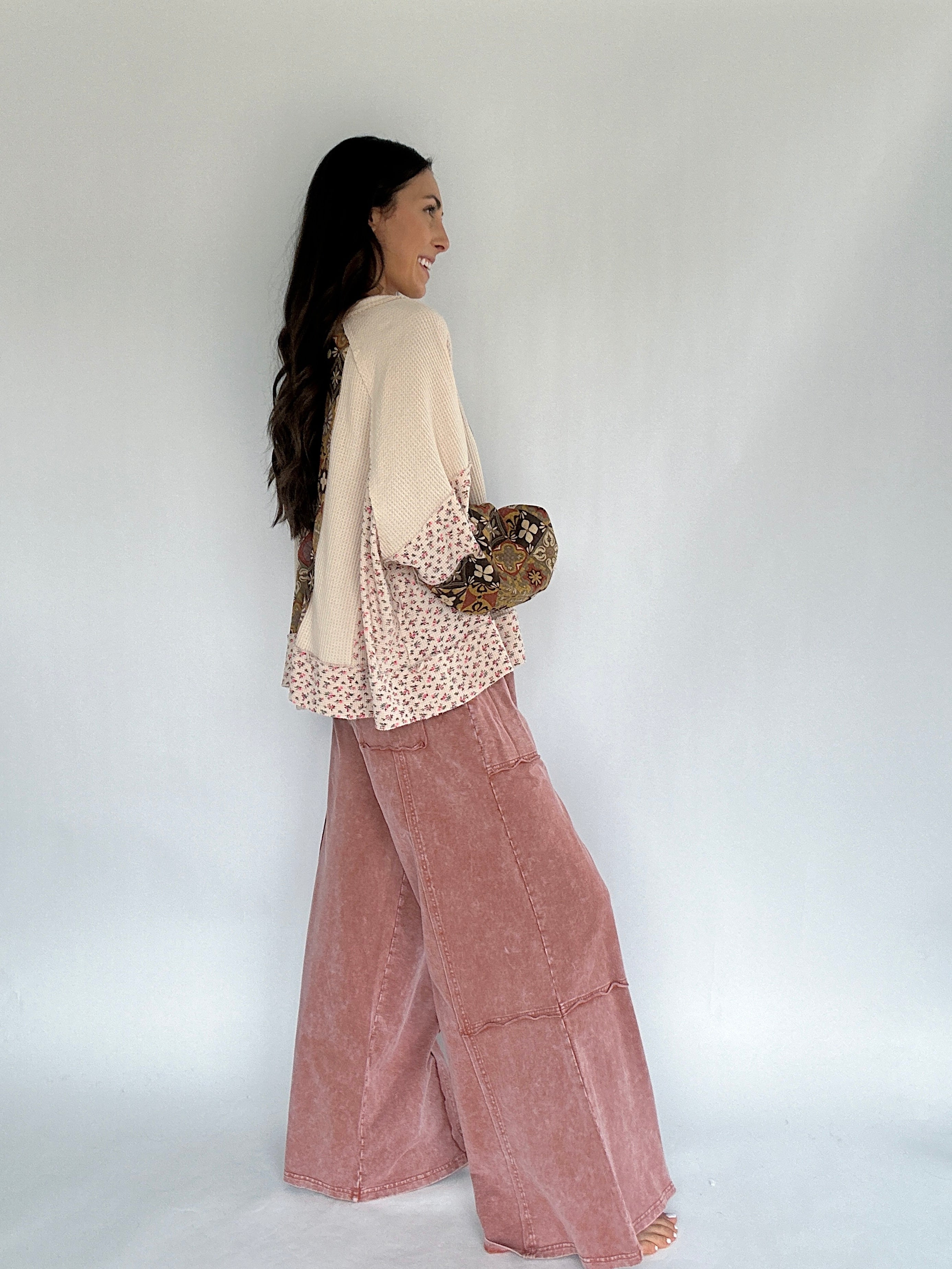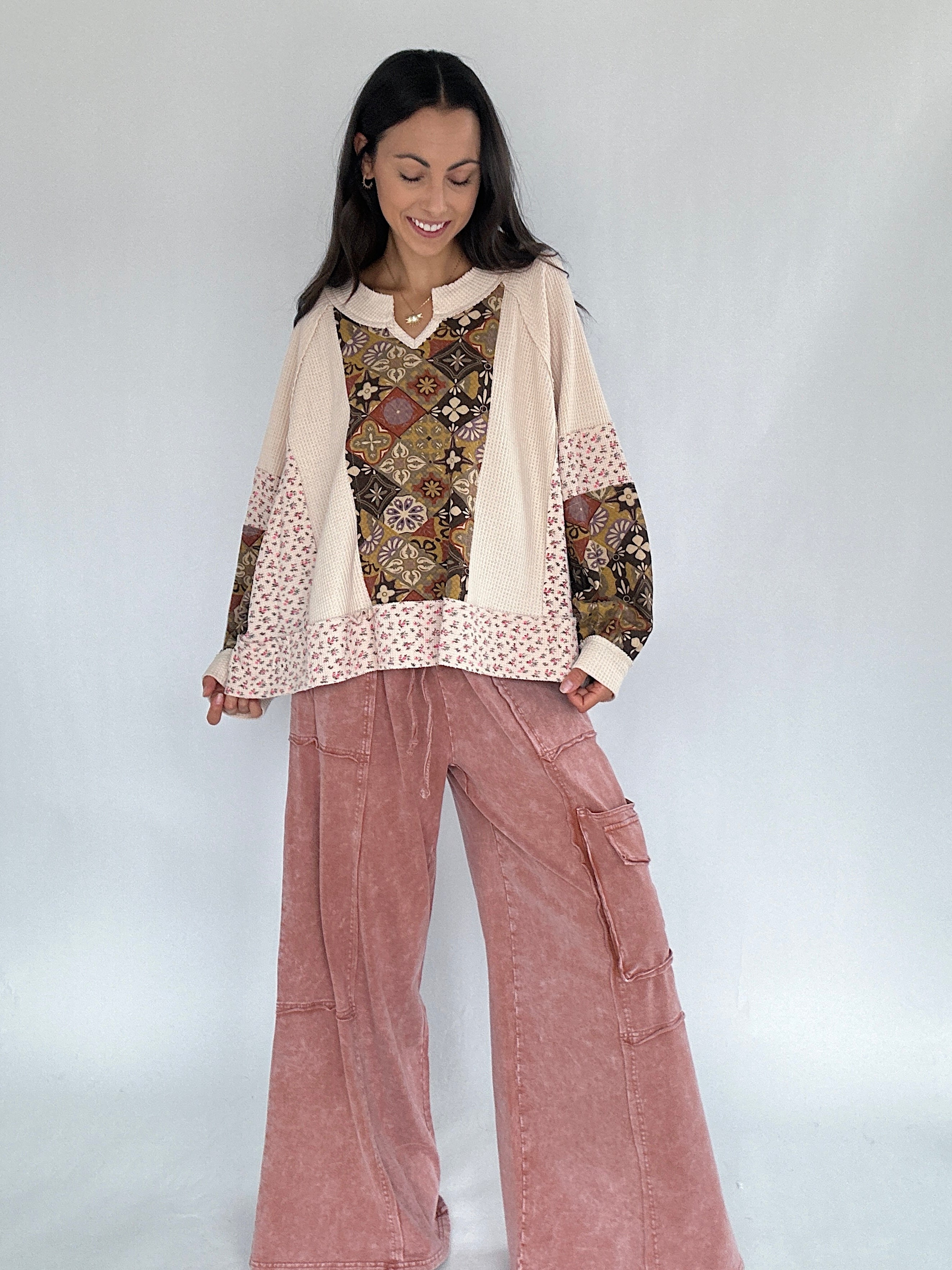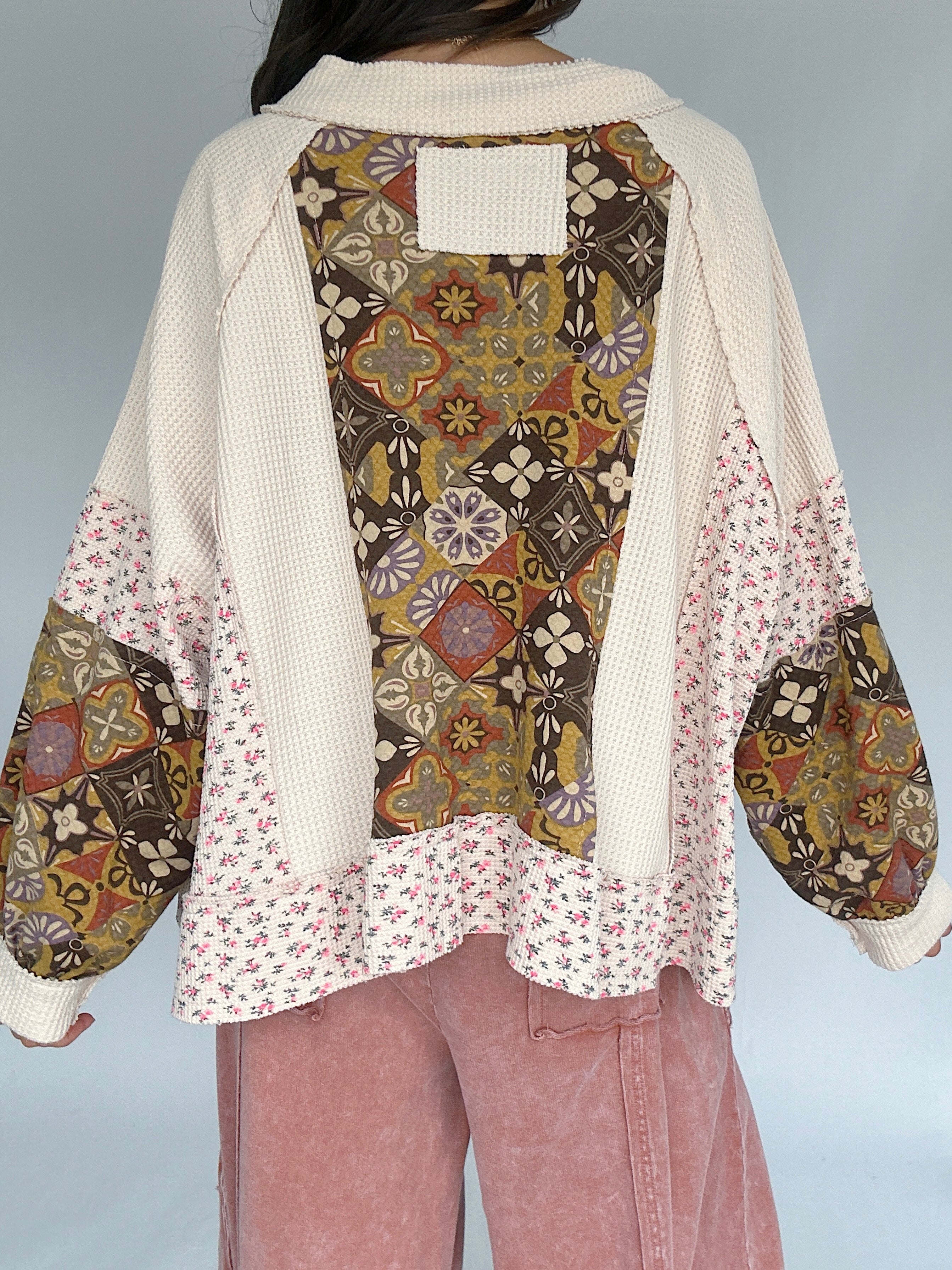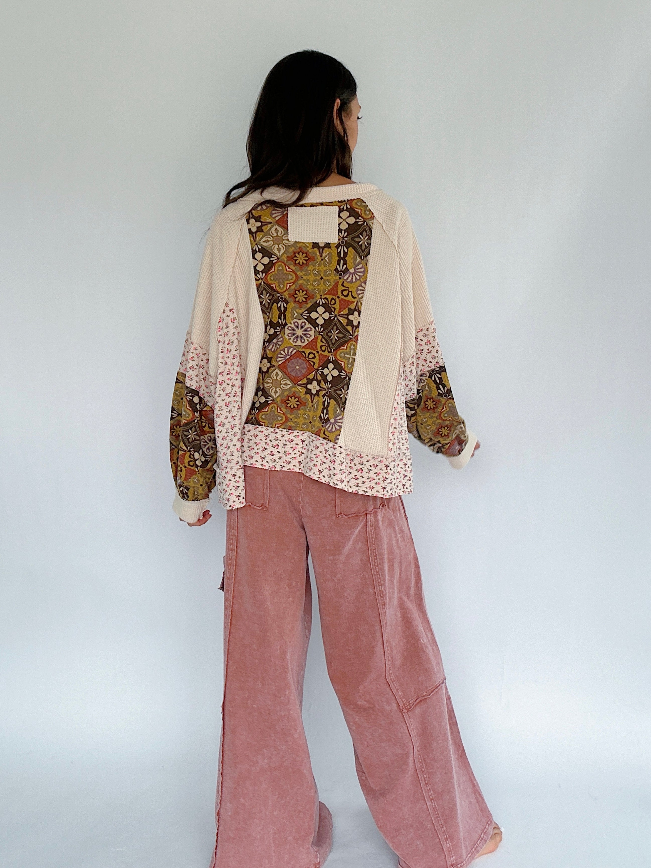 This long sleeve thermal top is adorable for a casual autumn day with a pair of your favorite jeans! It has warm toned boho inspired panels mixed with dainty floral contrasting and exposed seams. The notched neckline, raglan sleeves and slightly boxy fit makes it slouchy and so comfortable for an all day wear! Pro tip - change the jeans for a pair of wide leg sweatpants to make it a lounge outfit!