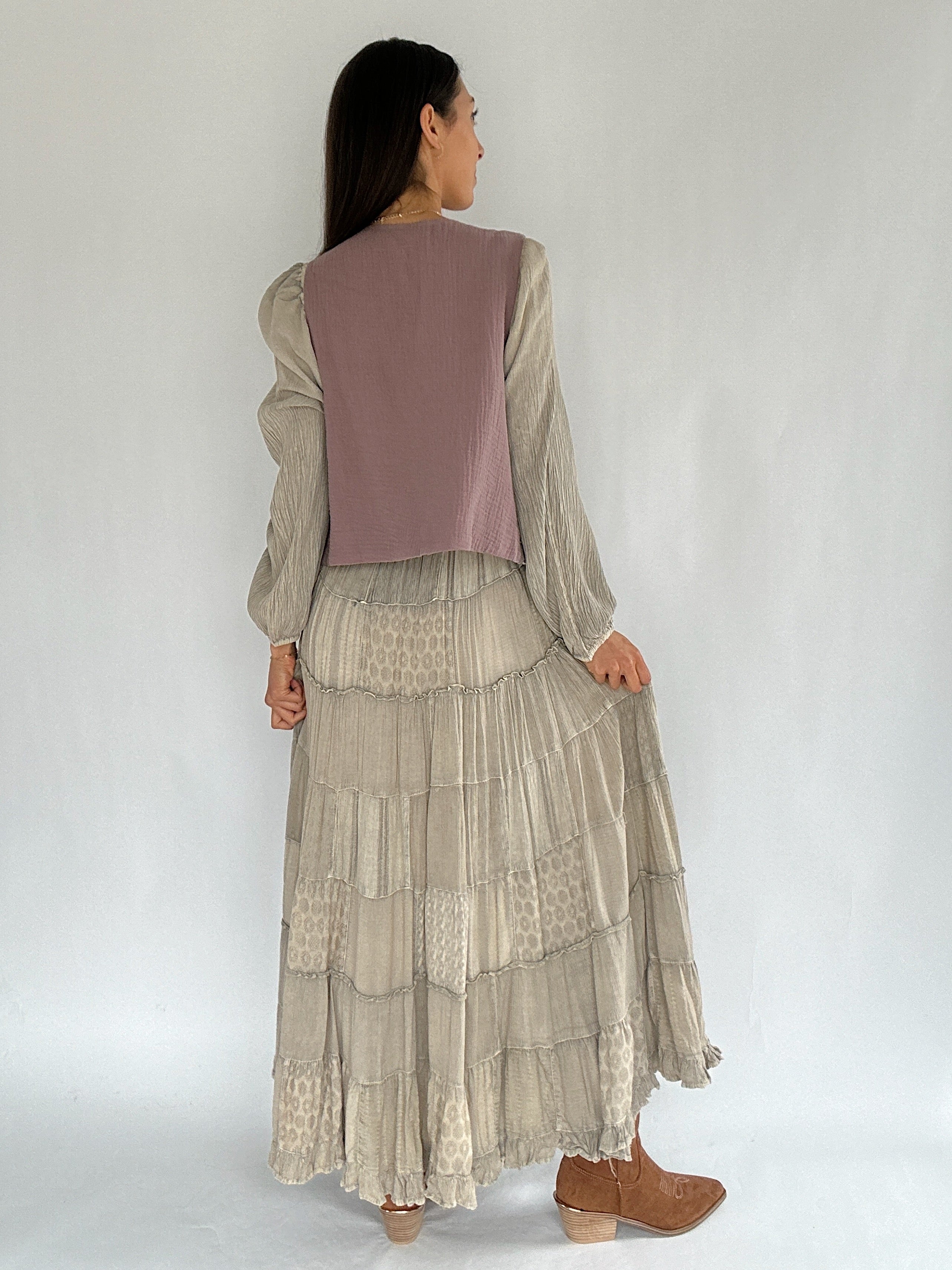 The Kenadie Embroidered Vest is giving casual fall with a little western flair—and she’s the kind of piece that makes a simple outfit feel like a whole look. The floral embroidery pops against the soft purple mushroom gauze, and the tassel tie is the perfect little detail. Toss it on with a tee and jeans, layer it over a dress, or pair it with a maxi skirt for major fall vibes.