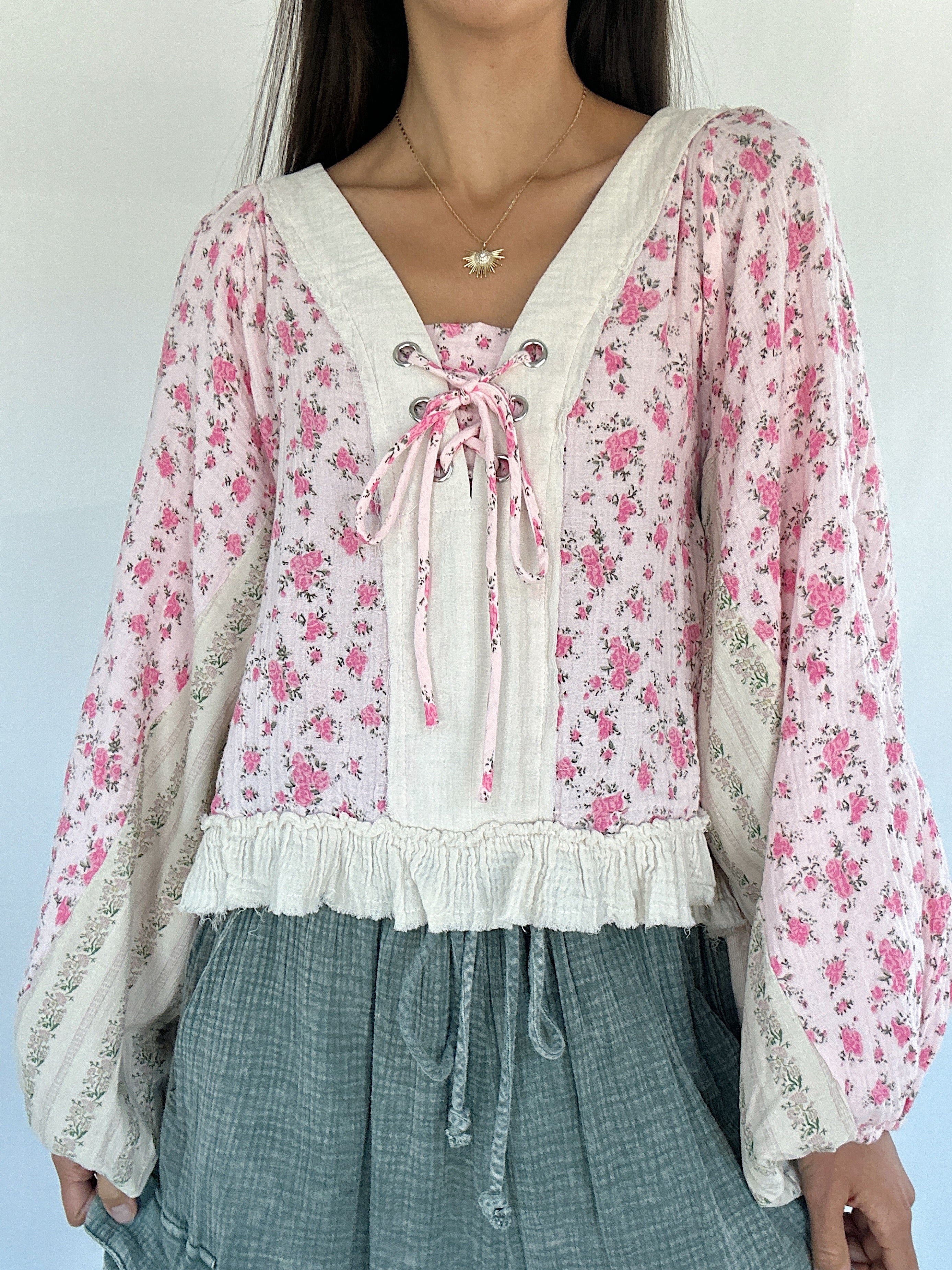It has a sweet floral mix, vintage-inspired details, and effortlessly relaxed shape. The lace-up neckline, gauzy ruffle hem, and exposed raw seams give it that perfectly undone charm, while the billowy balloon sleeves brings a feminine boho vibe.