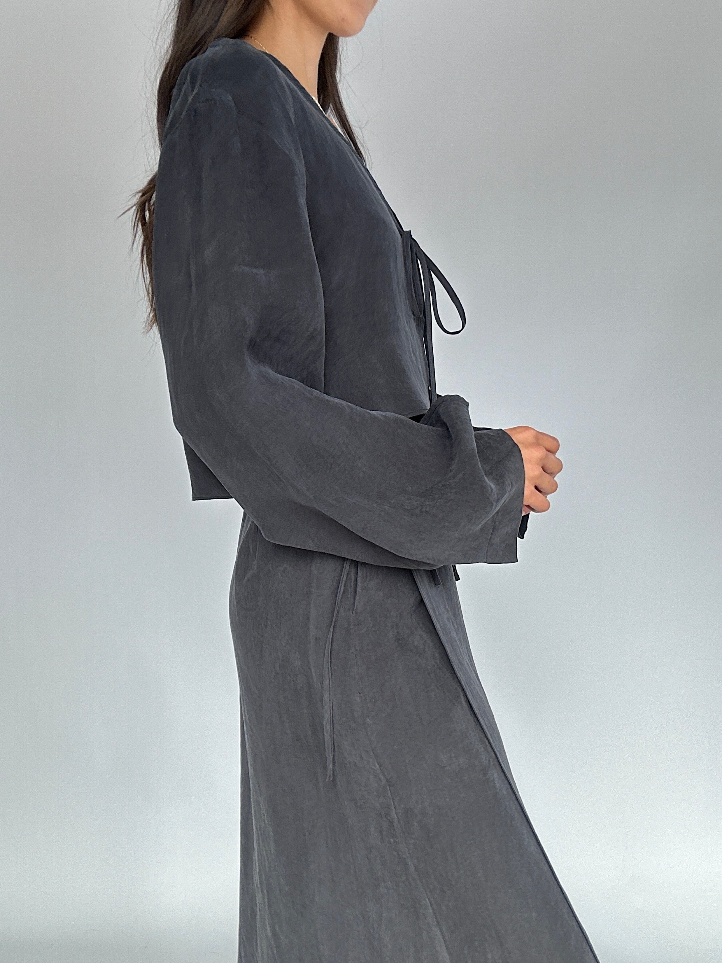 This charcoal black long sleeve top is a true stunner. Wear it alone or make a chic matching set when you pair it with the Maxine Wrap Maxi Skirt!