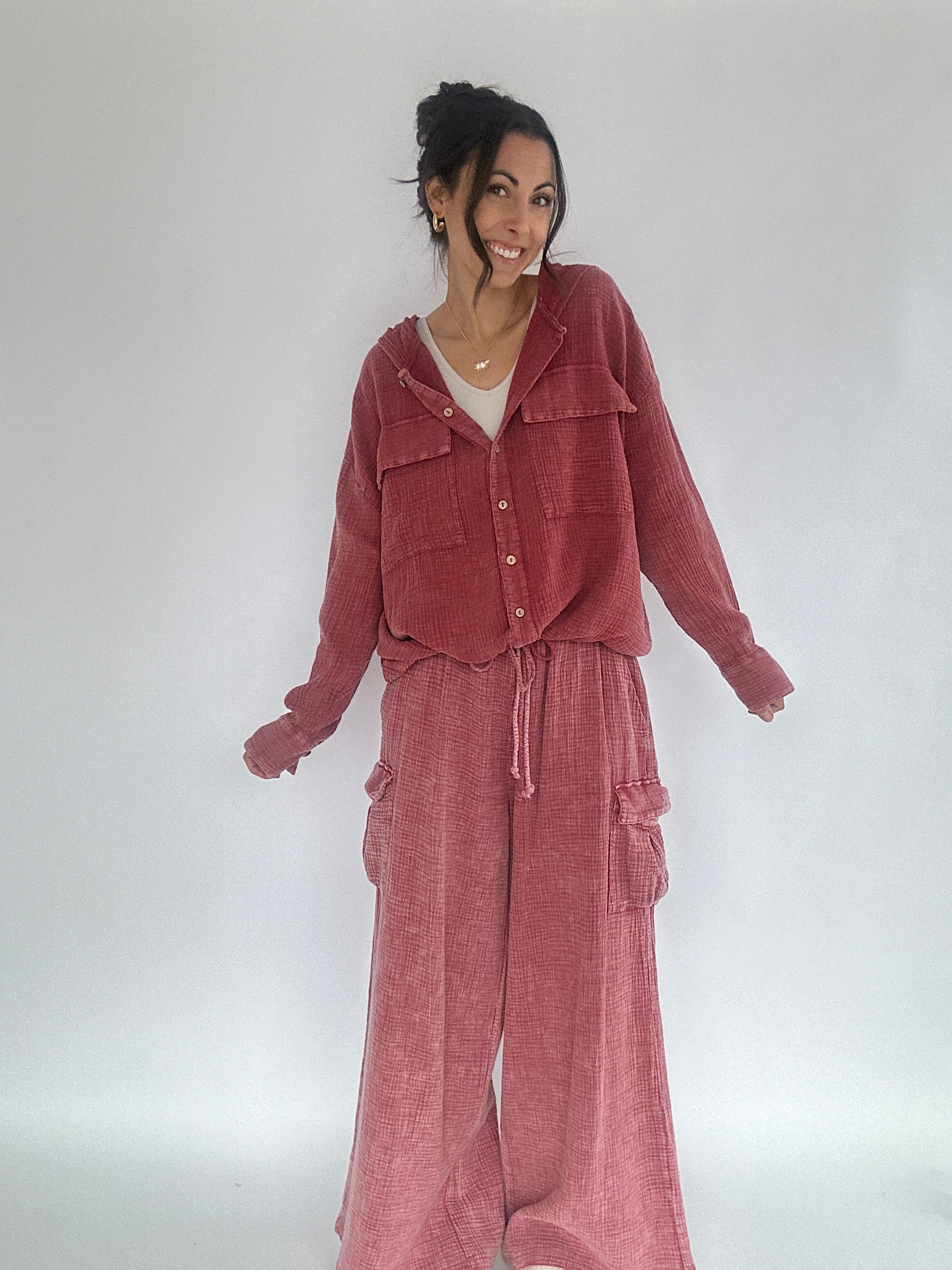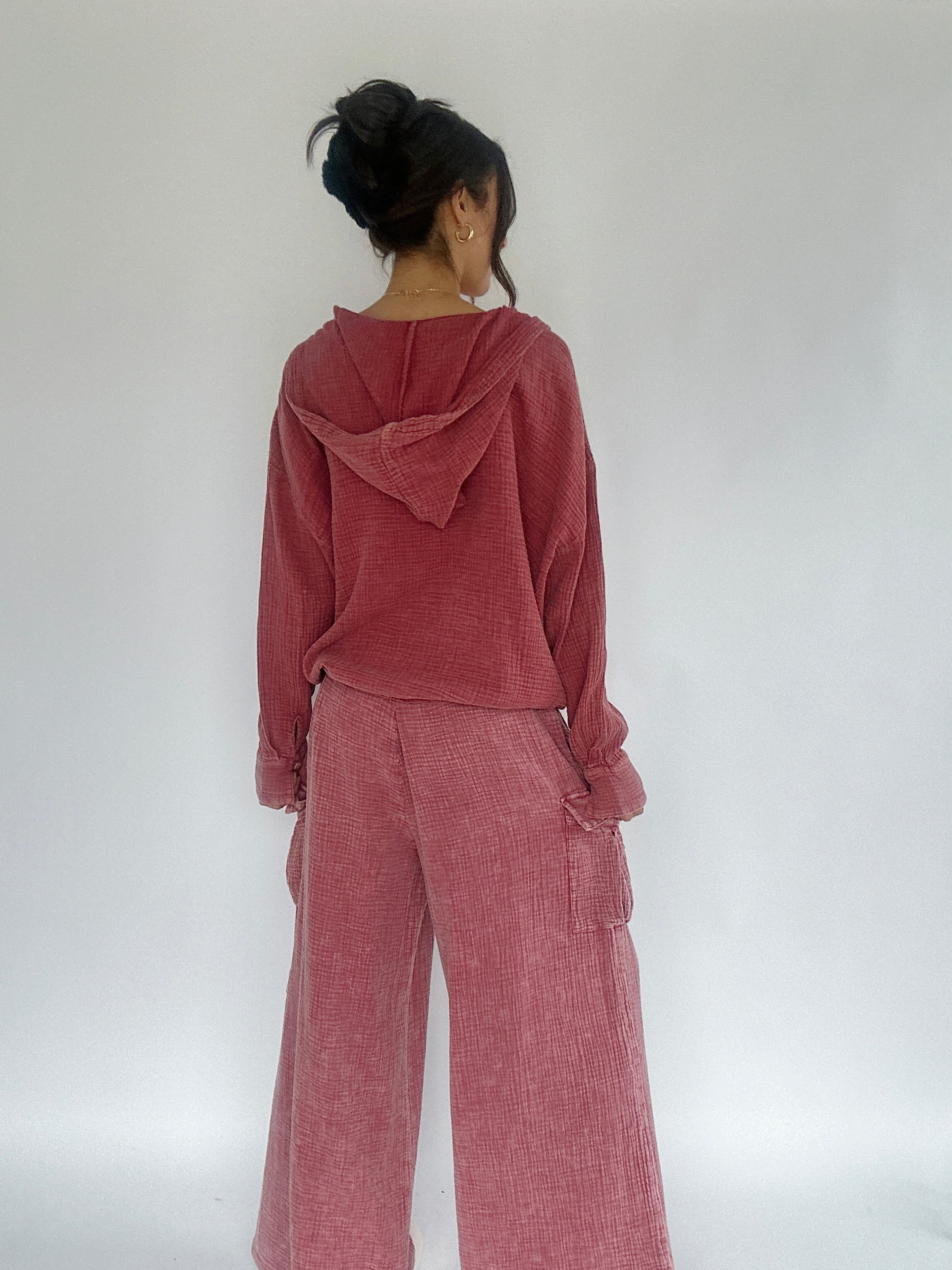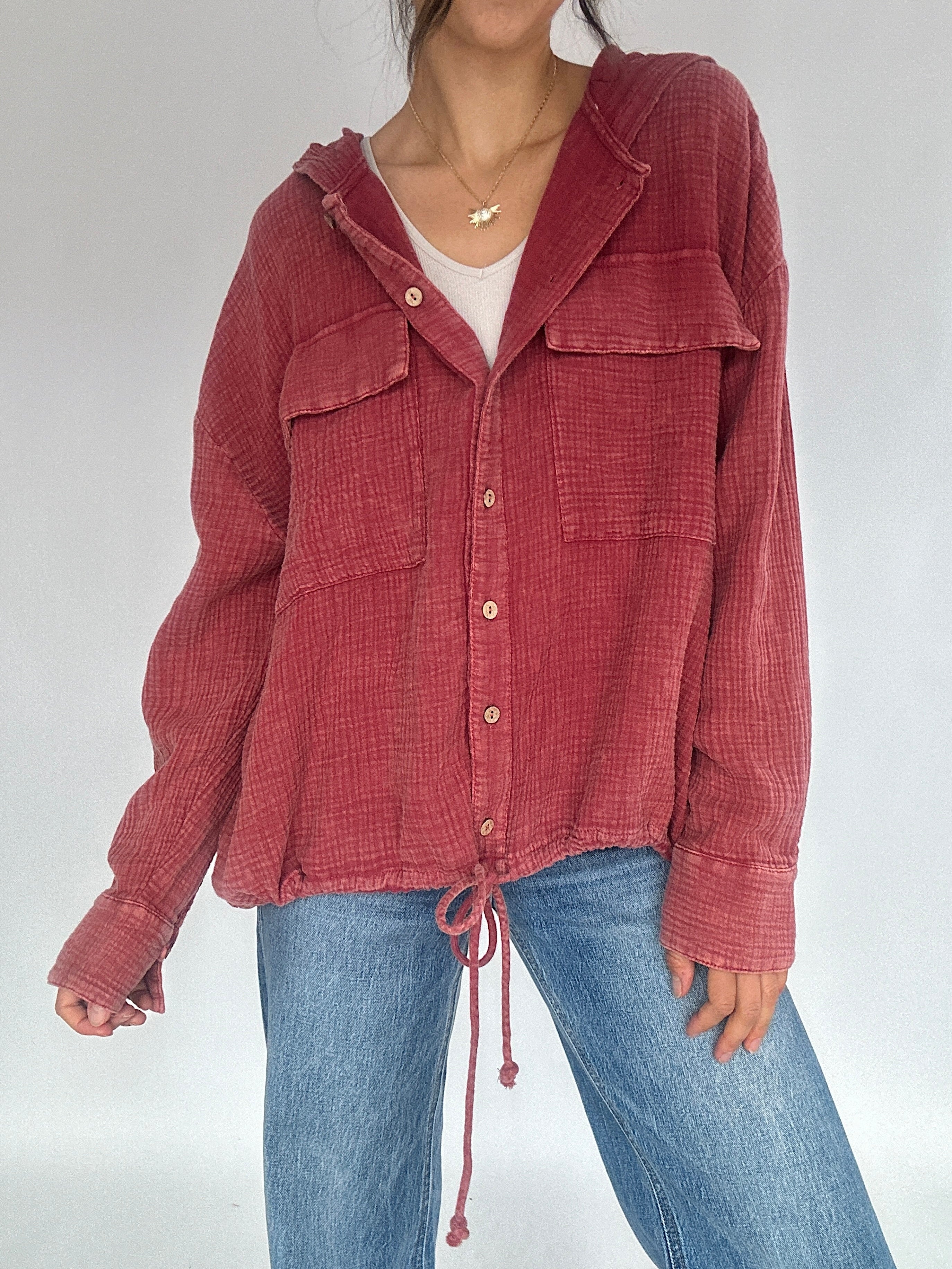 This raspberry red mineral washed cotton gauze hoodie style top has a button down front, oversized chest pockets, an adjustable tie hem and a relaxed, oversized fit. Wear t open or closed and pair with the matching North Bound Pants for an aesthetic set!