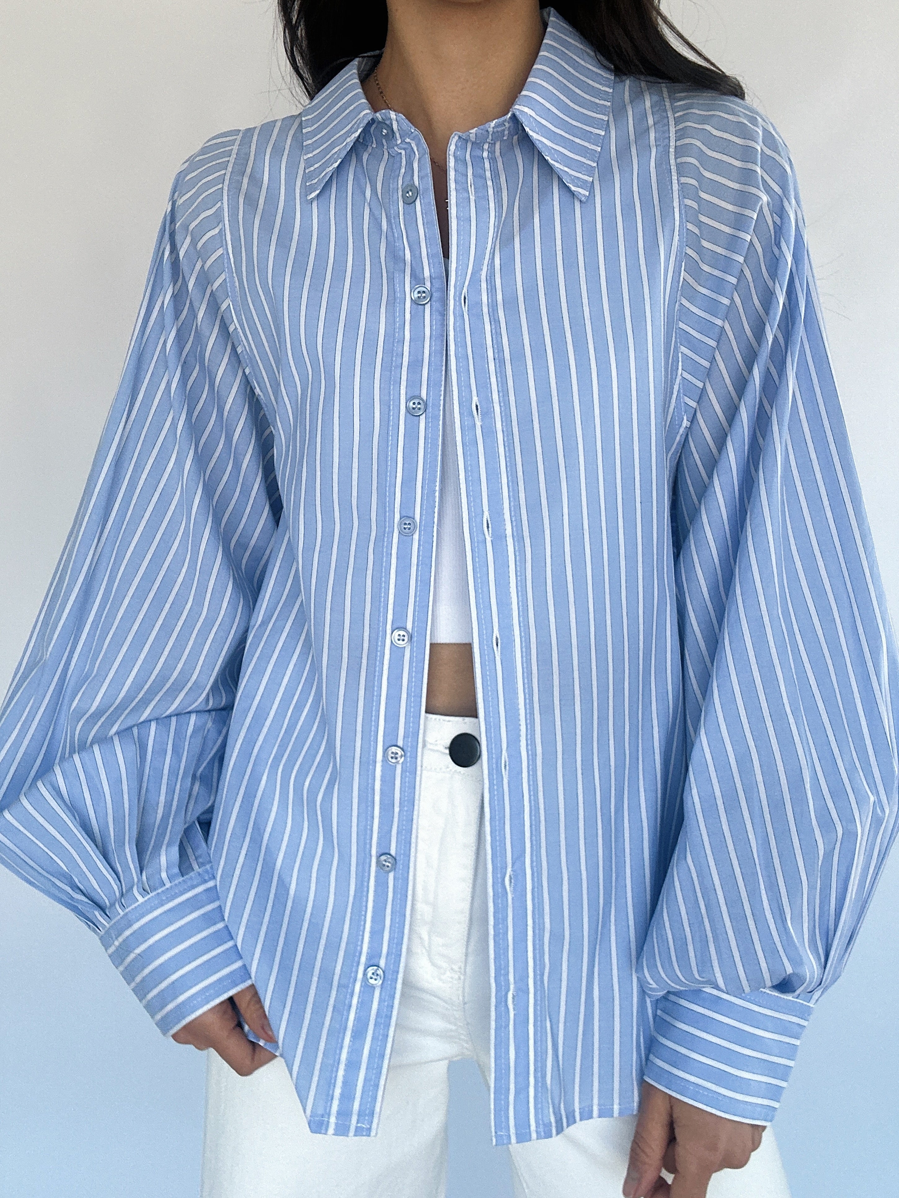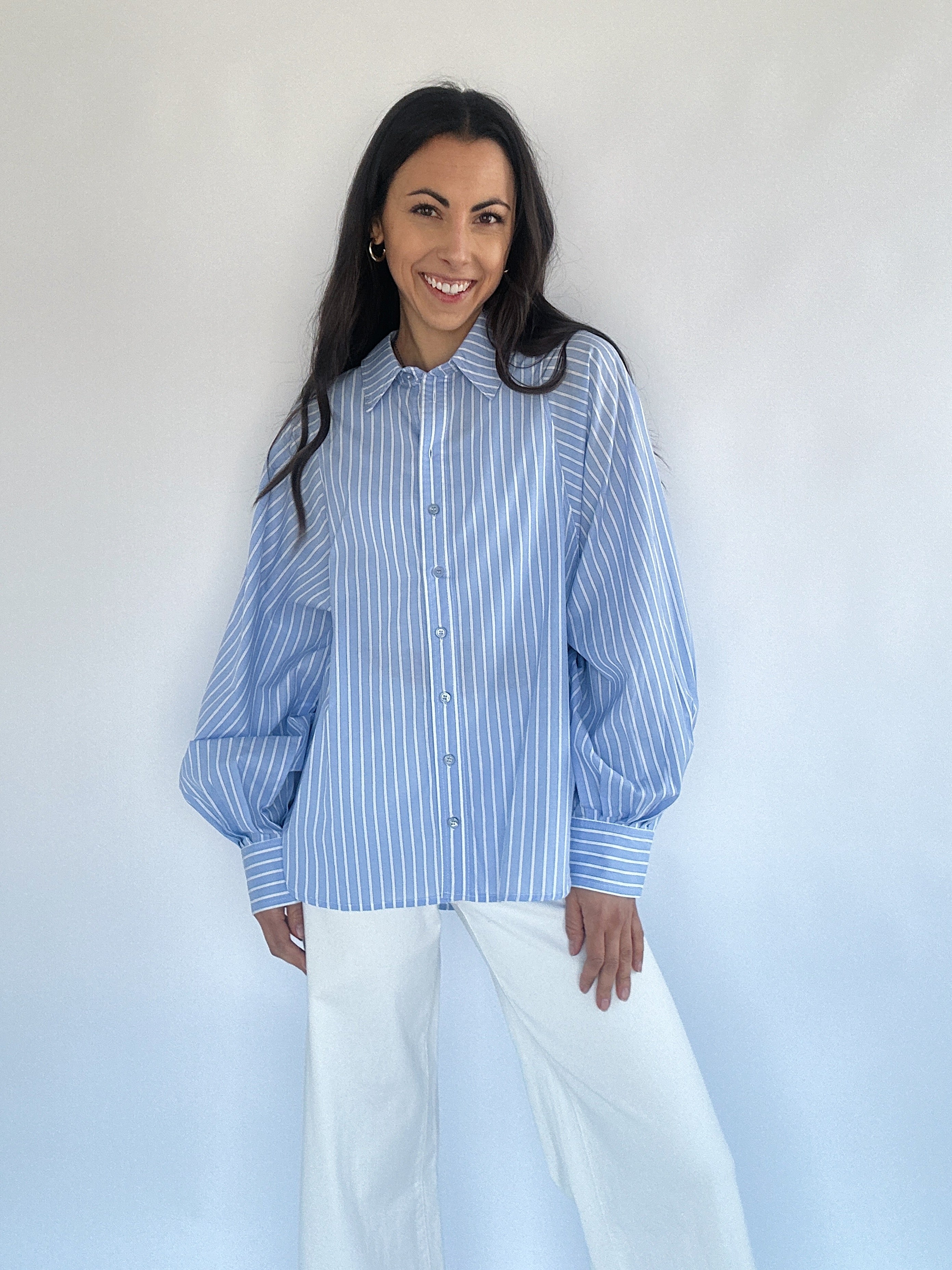 This peri blue pin stripe button down is an elevated classic with long balloon sleeves and an oversized fit. It has a full button front, collared top and button cuffs. Pair with denim or trouser pants, wear it open like a layering top or buttoned up,, its so versatile!