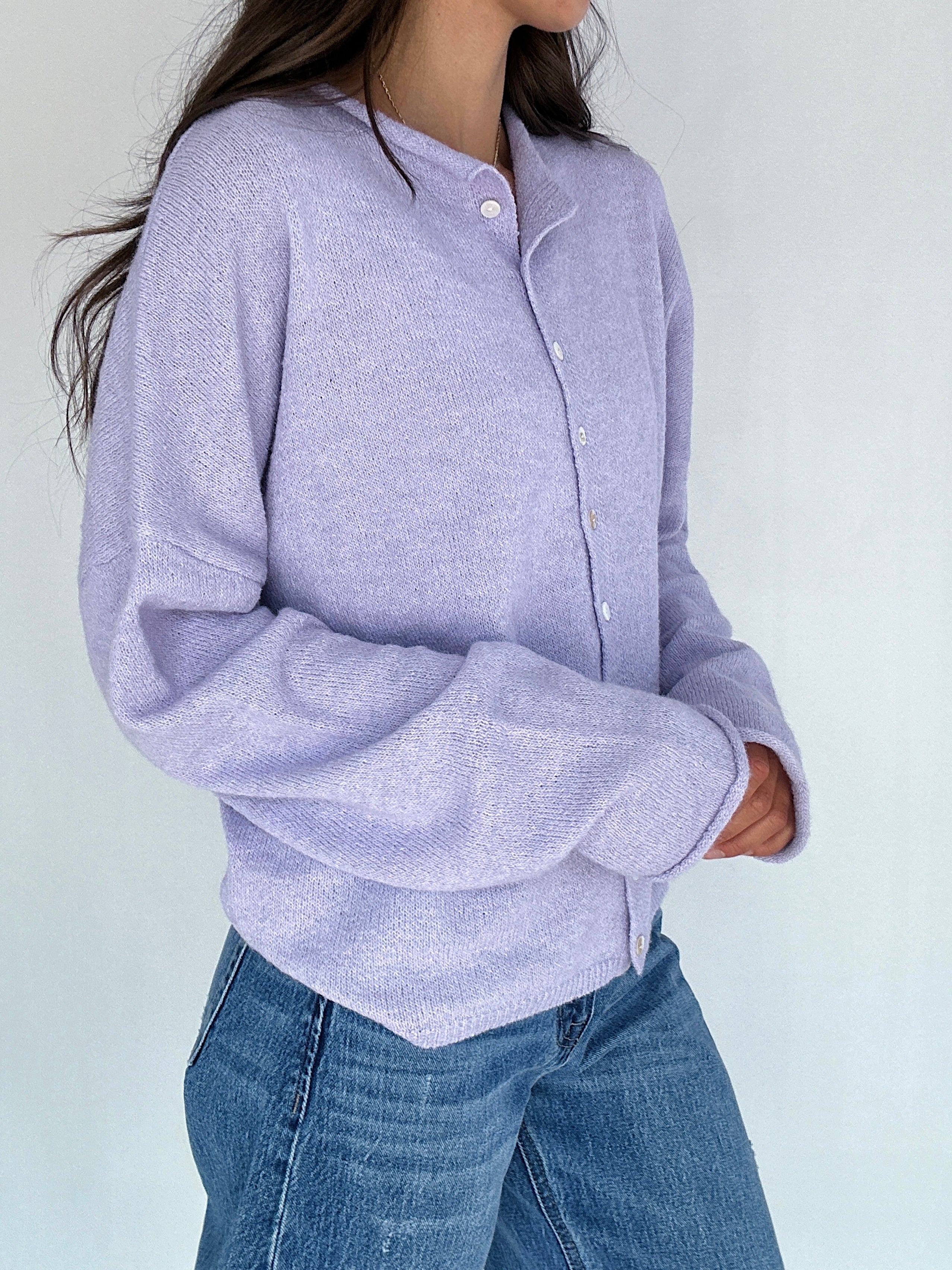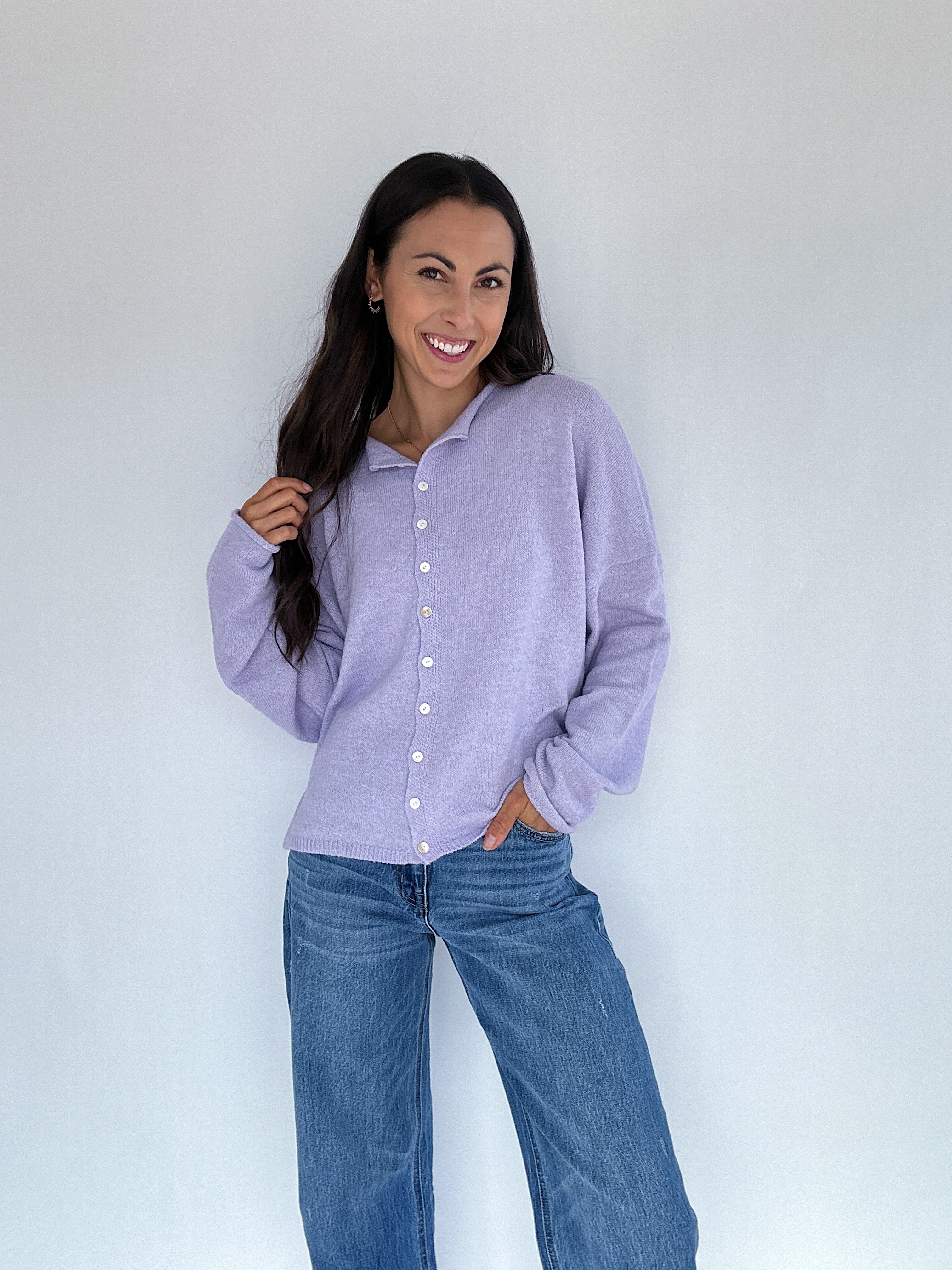 This light purple lavender cardigan is soft and light weight with a full button front and is the perfect layering piece. Or wear it alone with some jeans or wide leg pants!