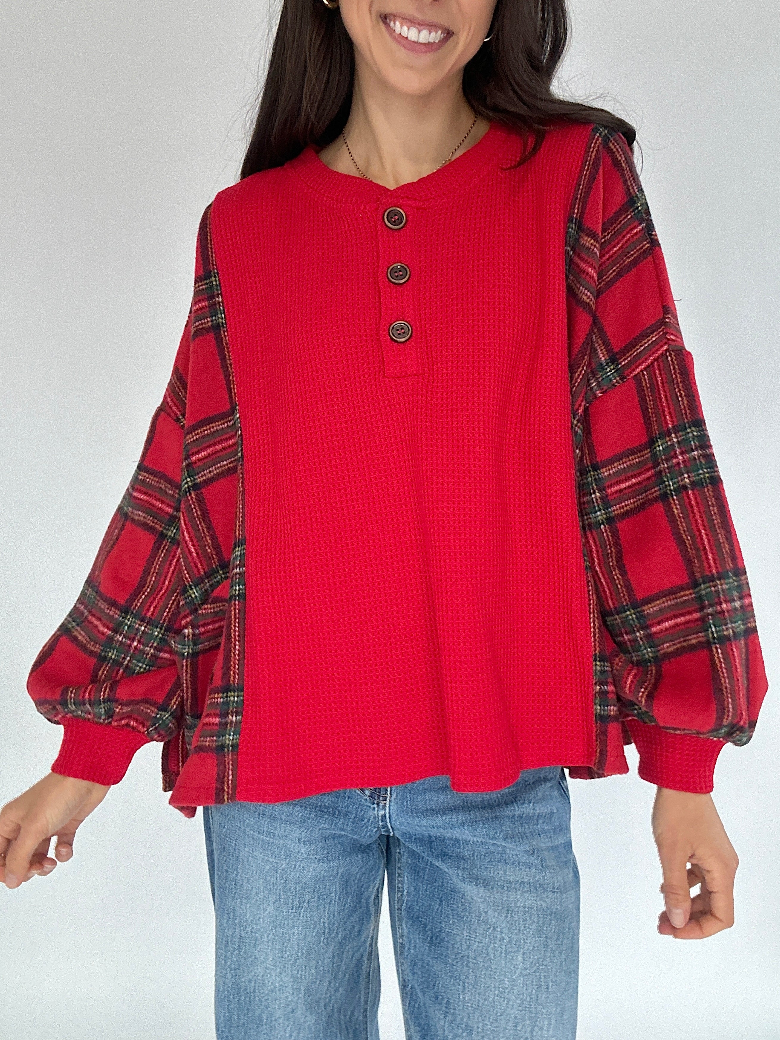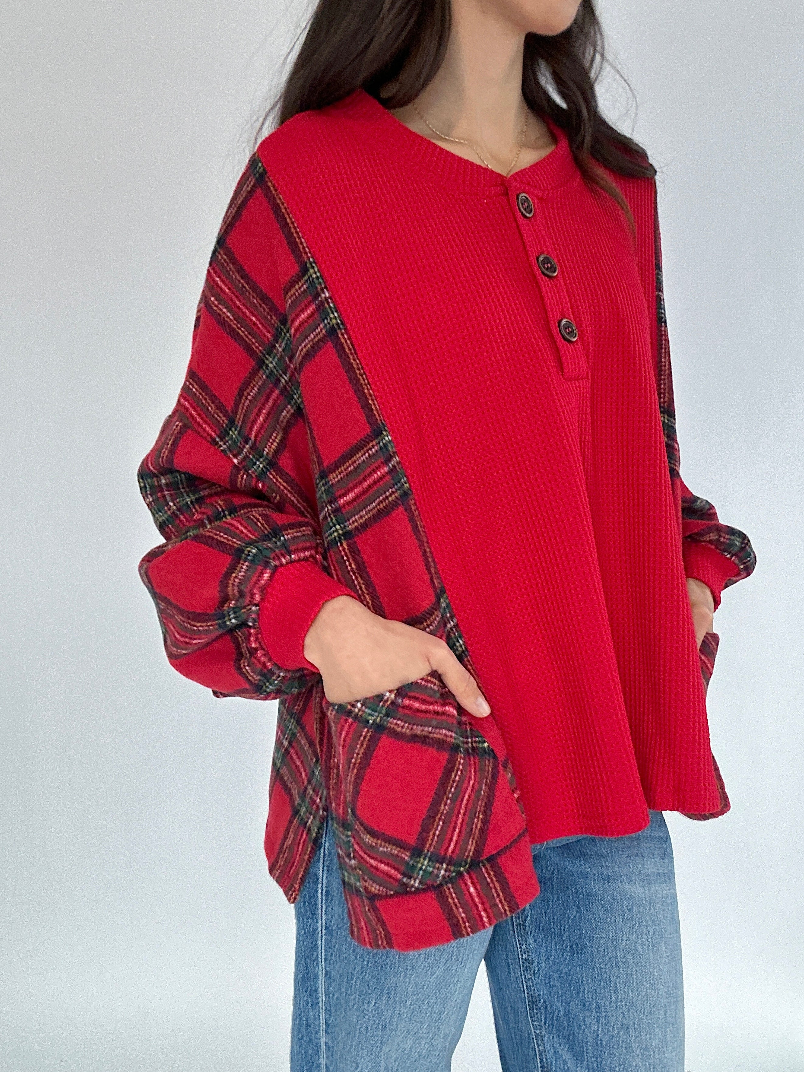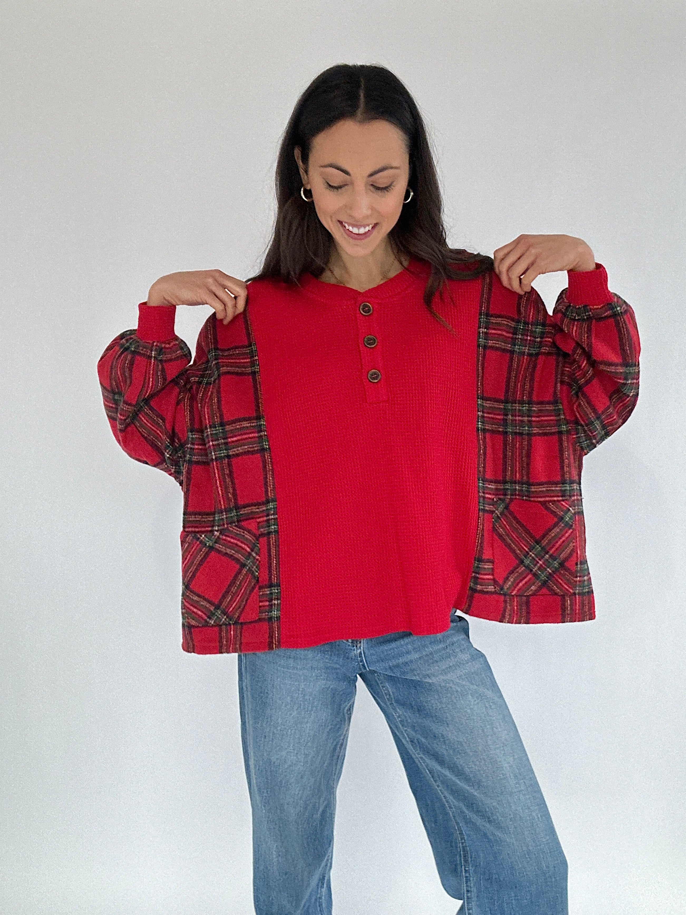 The Redwood Plaid Henley Top brings all the cozy, classic vibes of the holiday season. Picture tree farm afternoons, relaxed morning coffee runs, or strolling through a decorated downtown—the soft red waffle knit, plaid fleece side panels, and easygoing silhouette make it the top you’ll reach for on every festive day. The henley neckline adds a lived-in, effortless touch, while the relaxed fit keeps it comfortable for all-day wear.