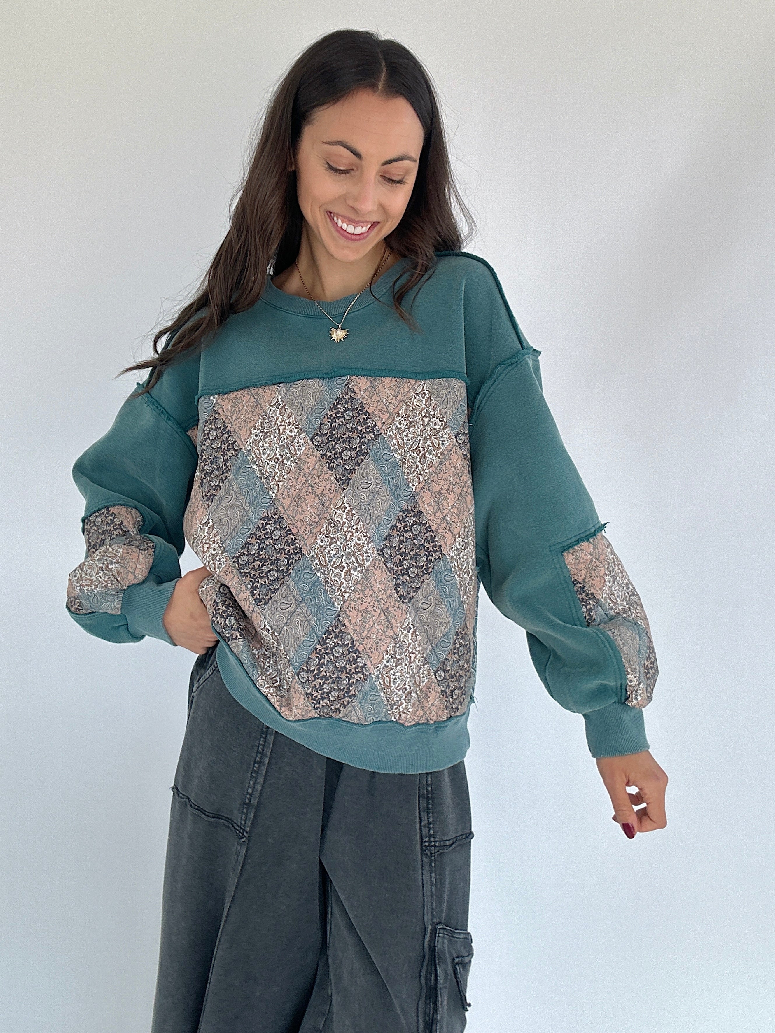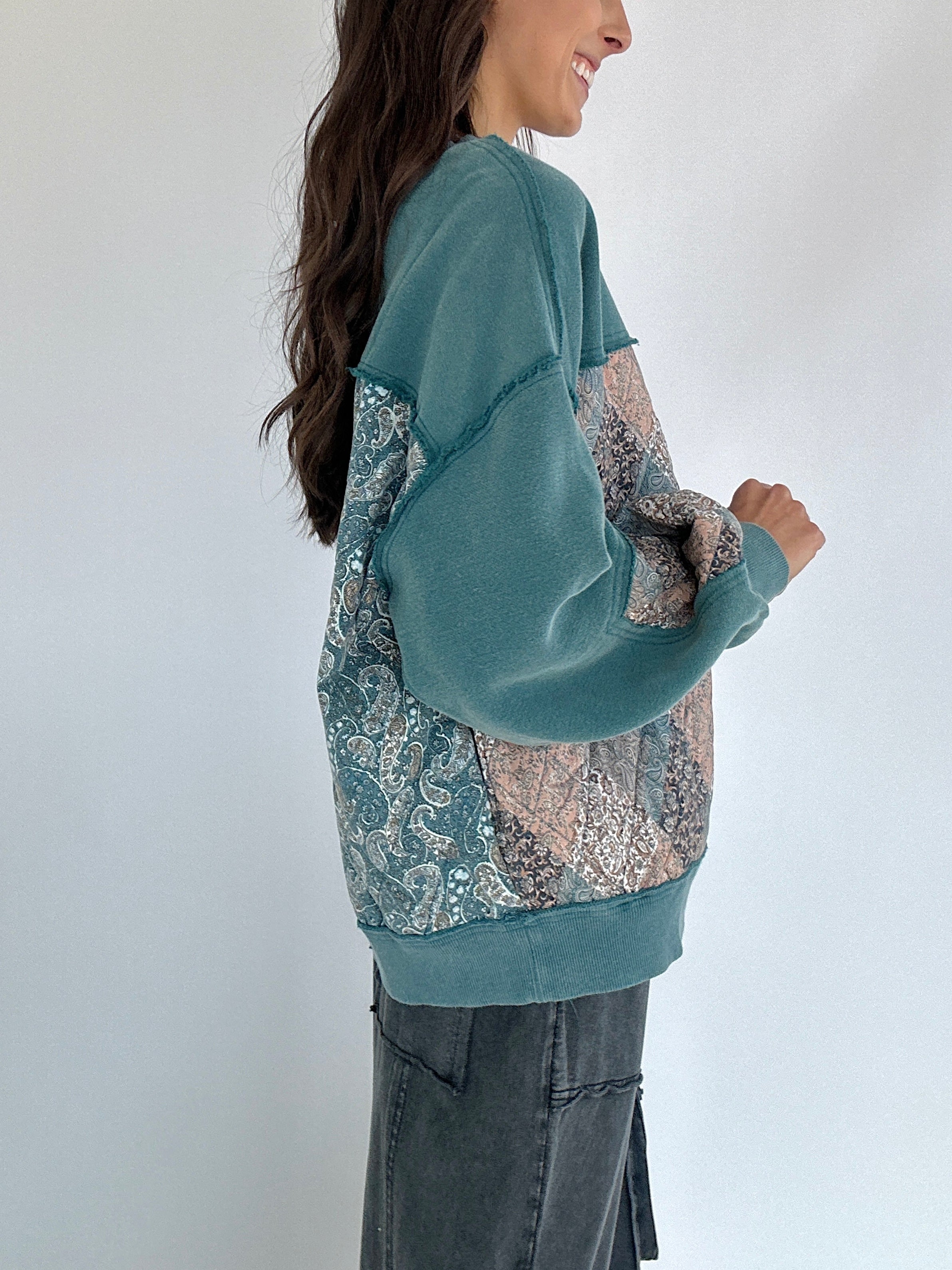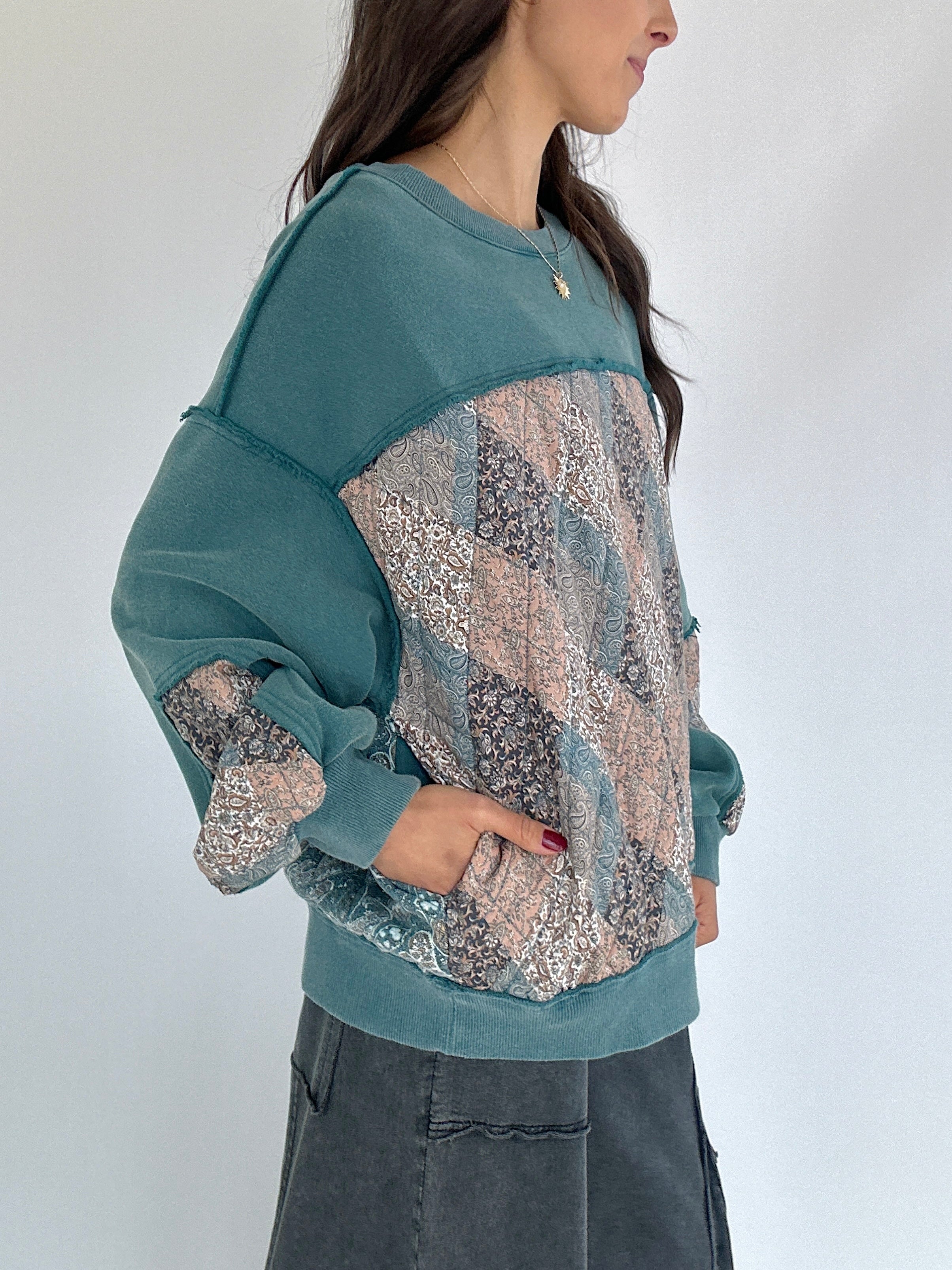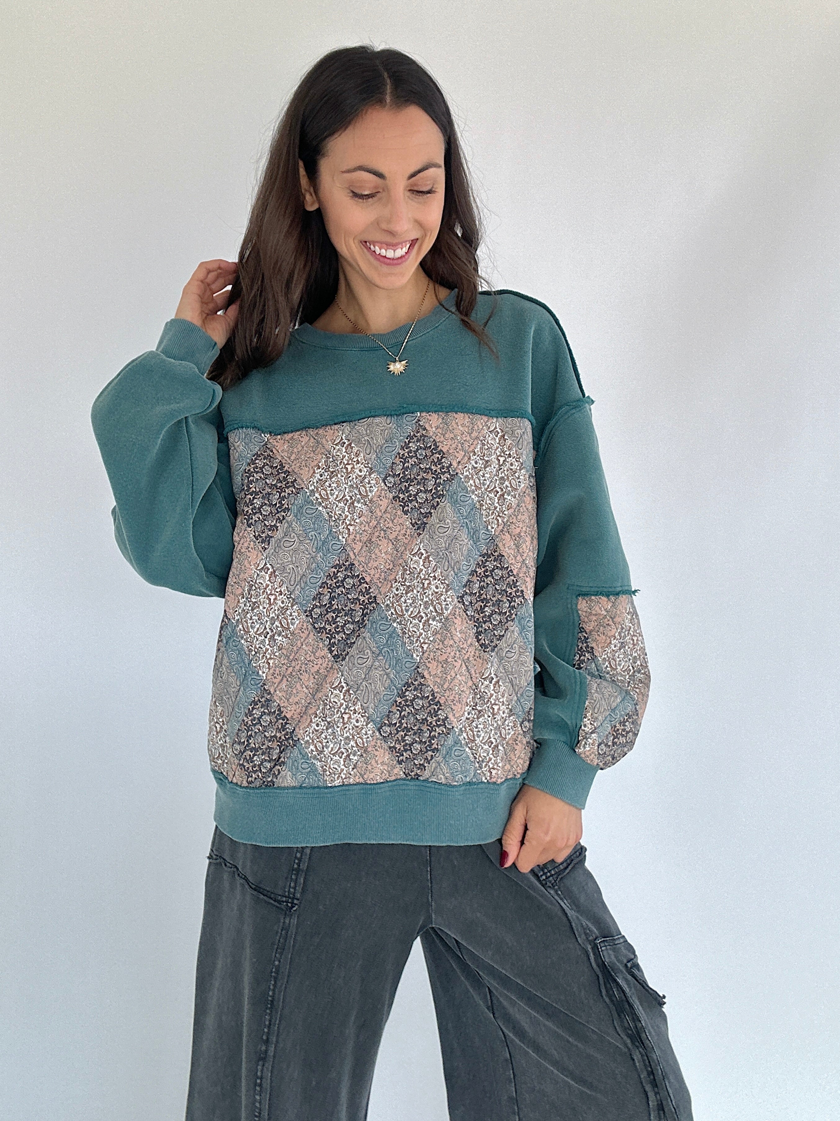 Meet your new go-to for cozy days with a little extra something. The Scottie Quilted Pullover brings all the comfy, lived-in feels with its mineral-washed finish and quilted floral details. The mix of textures and subtle paisley print on the back give it that one-of-a-kind, vintage look we love. Designed with a relaxed, boxy fit and side pockets for that laid-back ease.