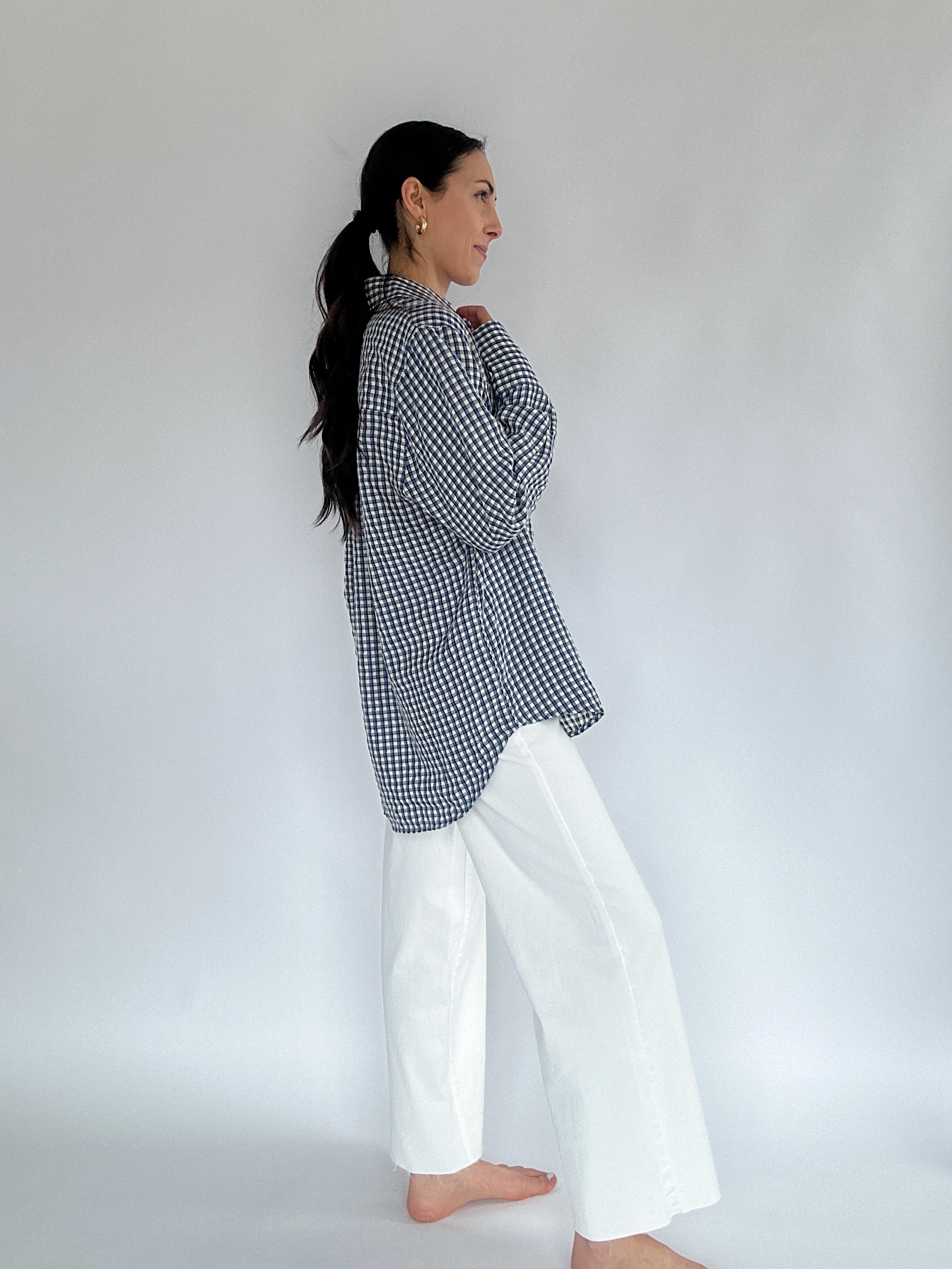 This navy blue plaid top has a button down front, collared neckline, long sleeves and chest pocket. Pair with jeans or shorts, layer or wear buttoned.. it's so veratile!