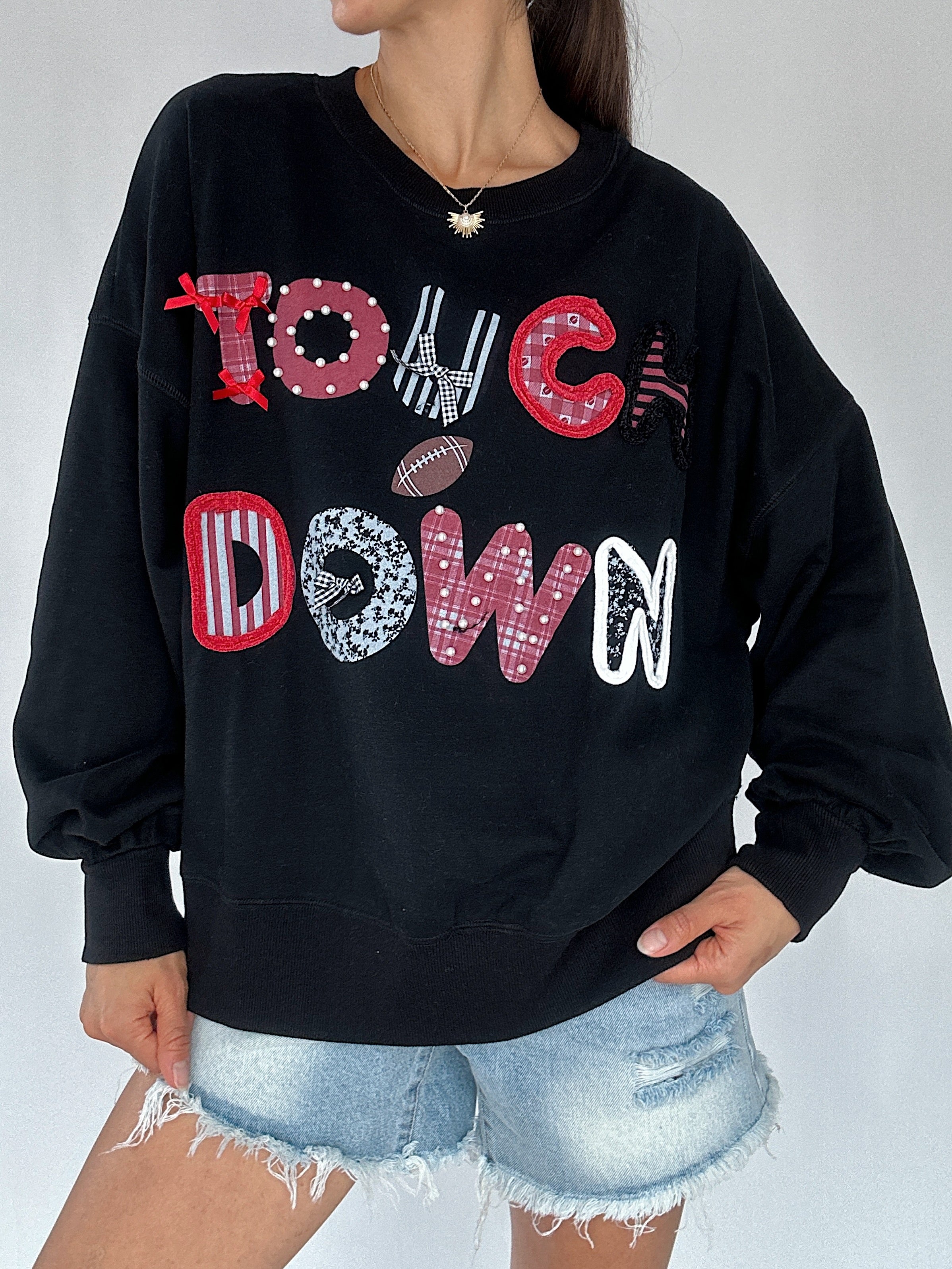 Football season just got cuter. The Touch Down Pullover is a playful take on game day style, with cutesy lettering in mixed red, black and white prints, sweet little bow accents, and a mini football graphic that makes it extra fun. Designed in a soft black fabric with a thick ribbed hem and cuffs, this crewneck sweatshirt has that relaxed oversized fit you’ll want to live in—whether you’re watching from the stands, the couch, or the tailgate.