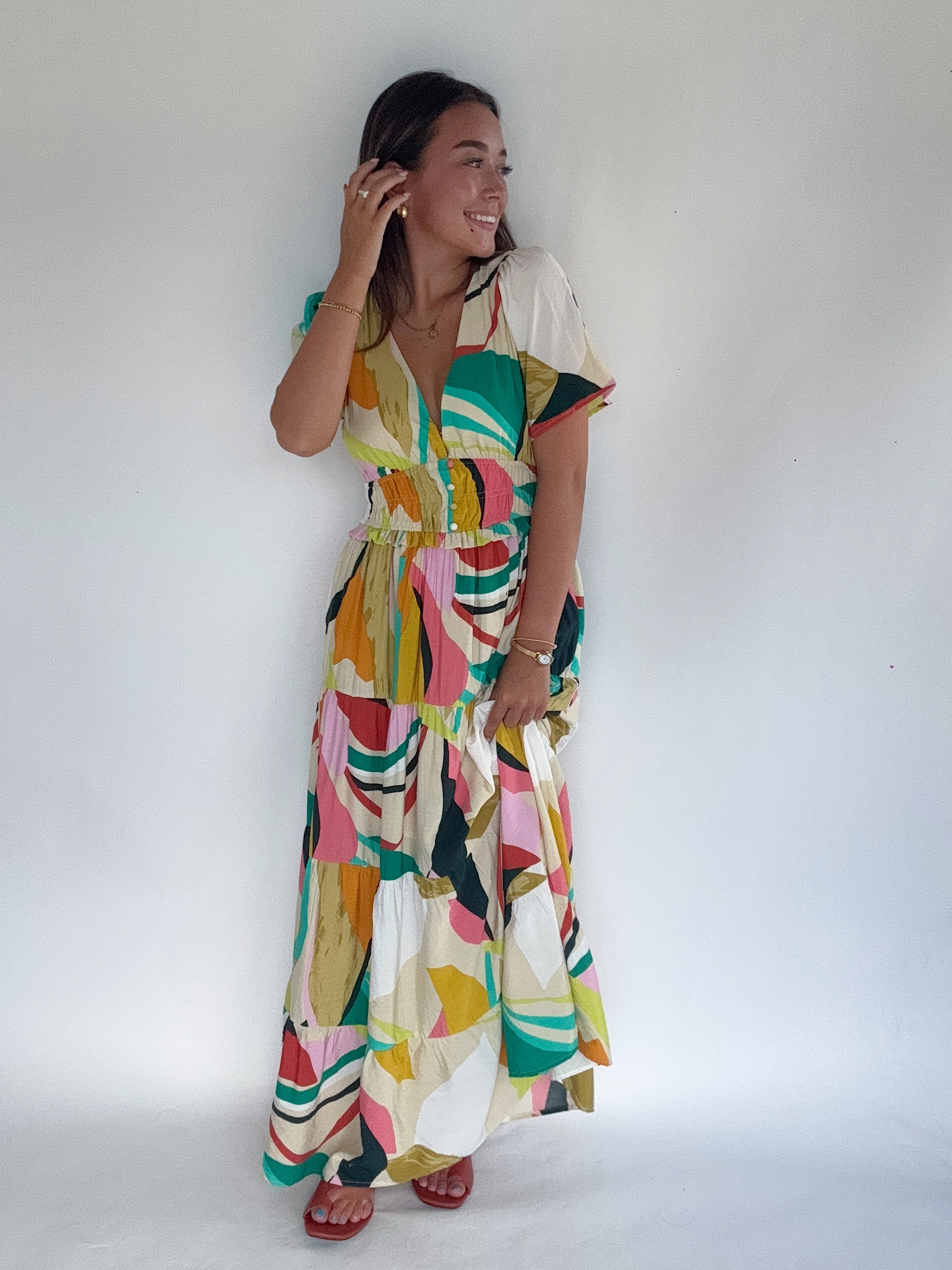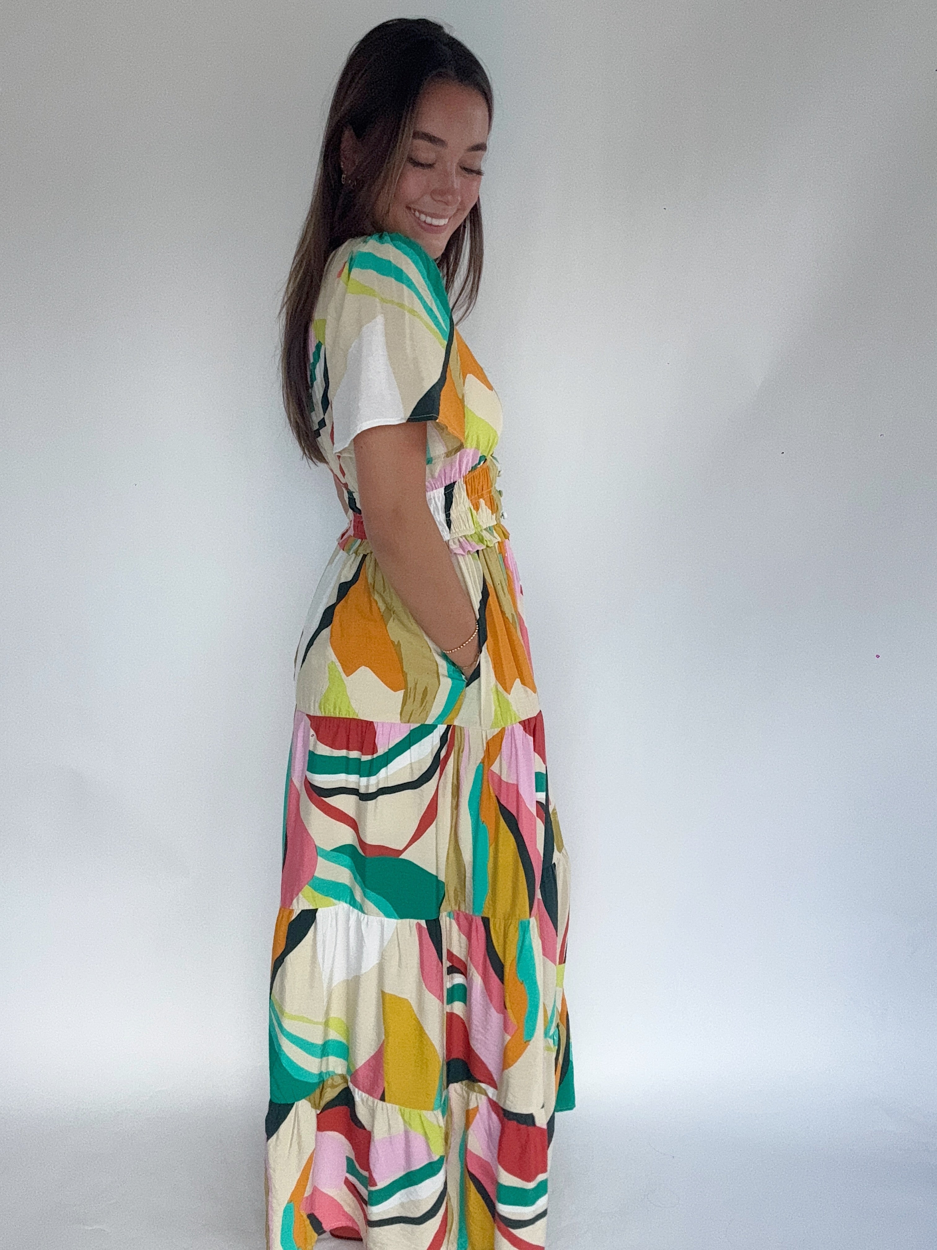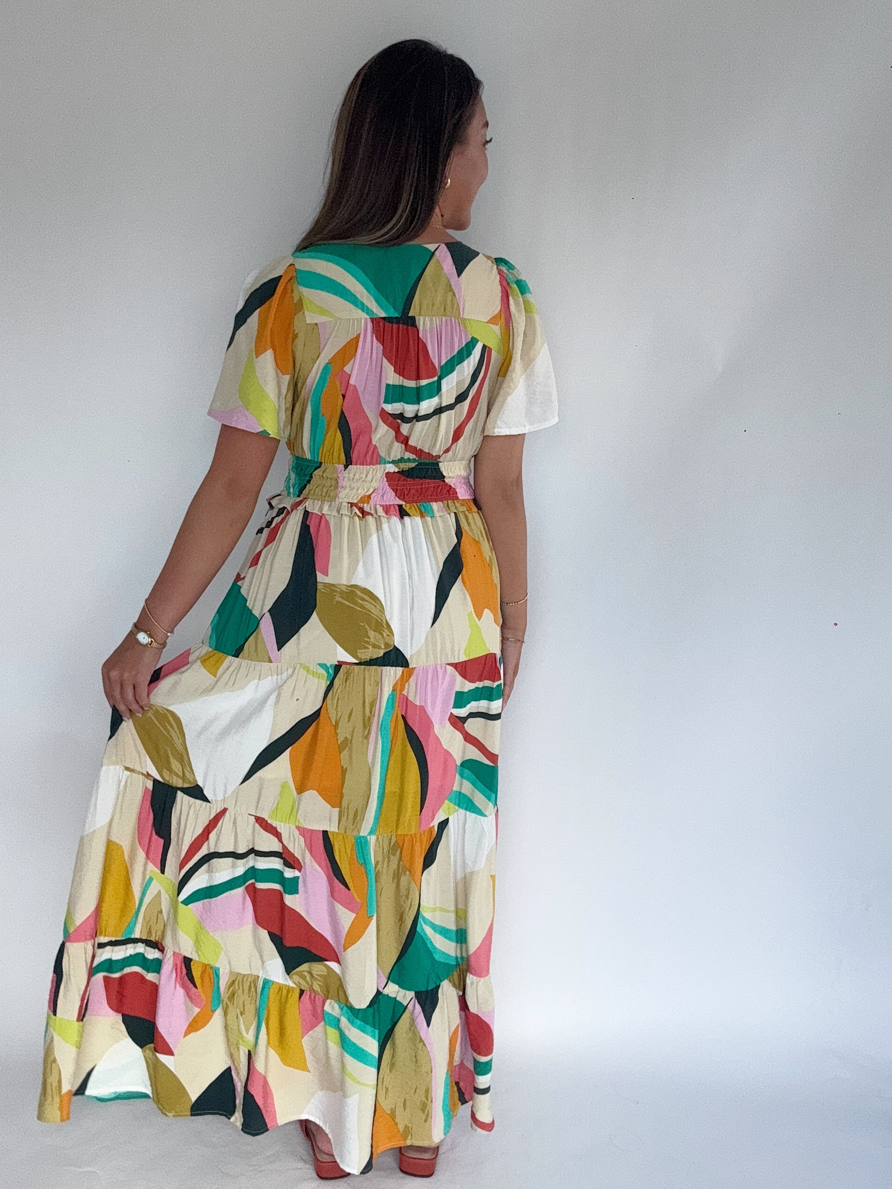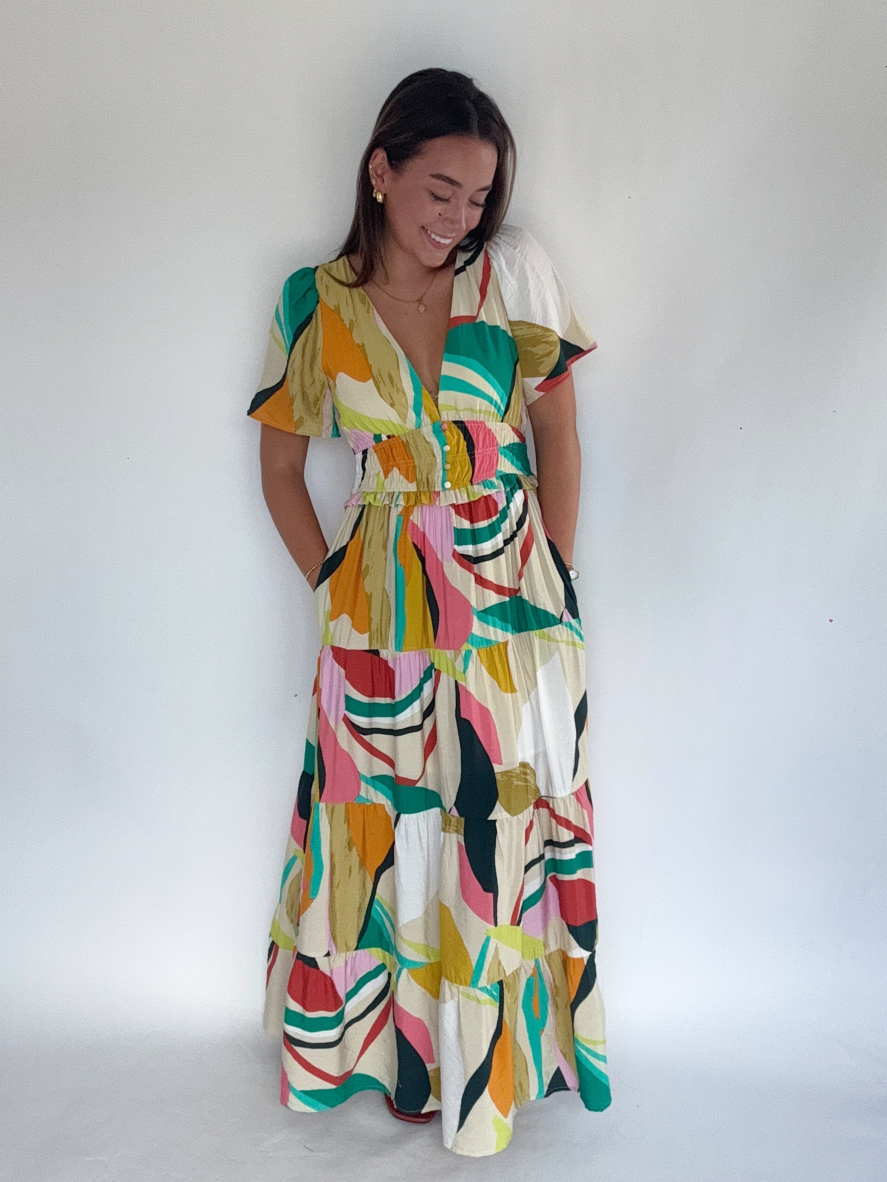 Retro vibes meet modern ease in the Groovy Baby Tiered Maxi Dress. This colorful stunner features a bold abstract print with a plunging neckline, smocked waist, and a flowy tiered skirt that brings all the movement. With subtle button details at the bust and easy short sleeves, it’s the kind of dress that feels like sunshine and good music.
