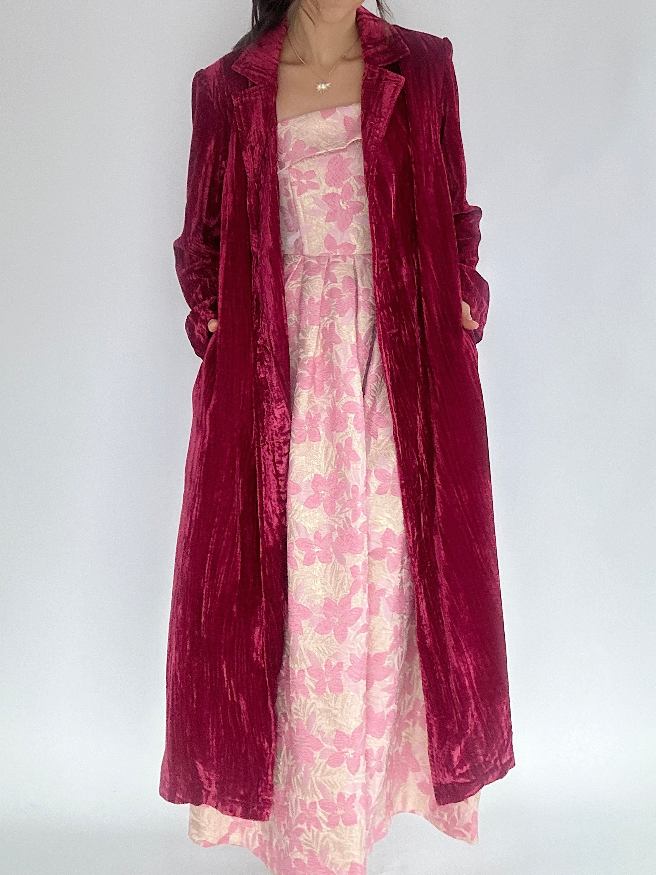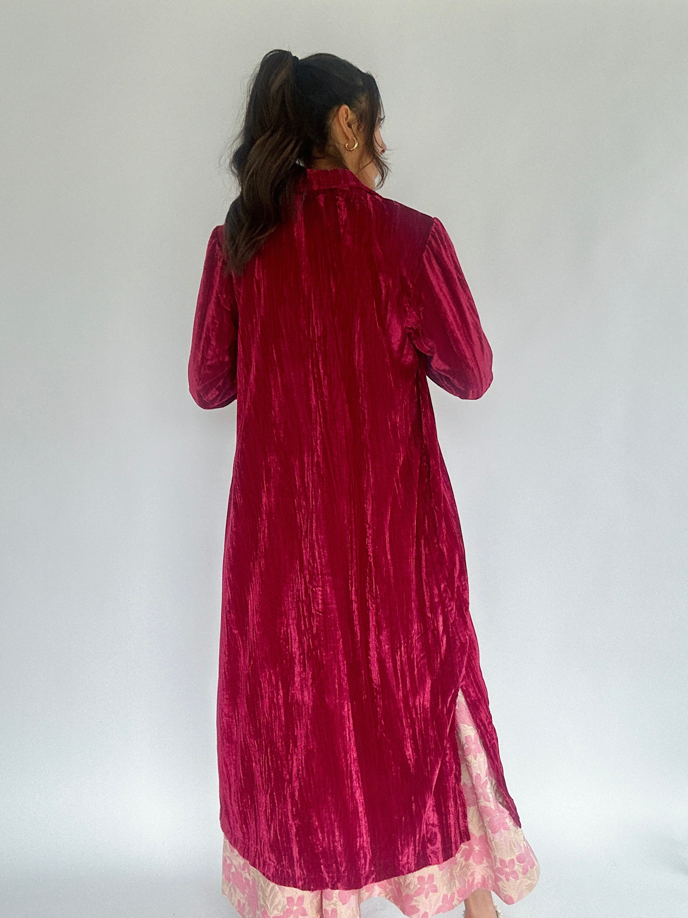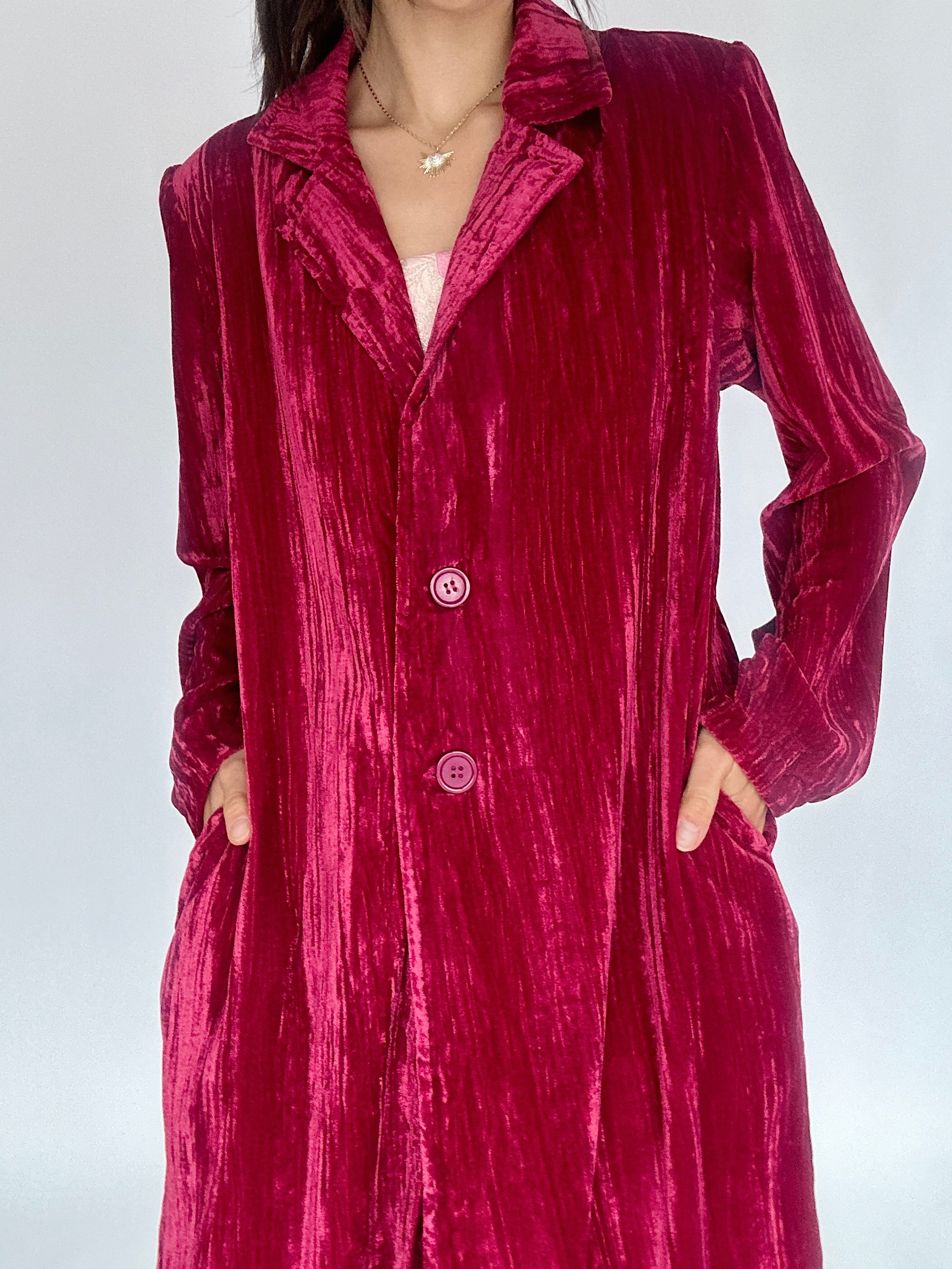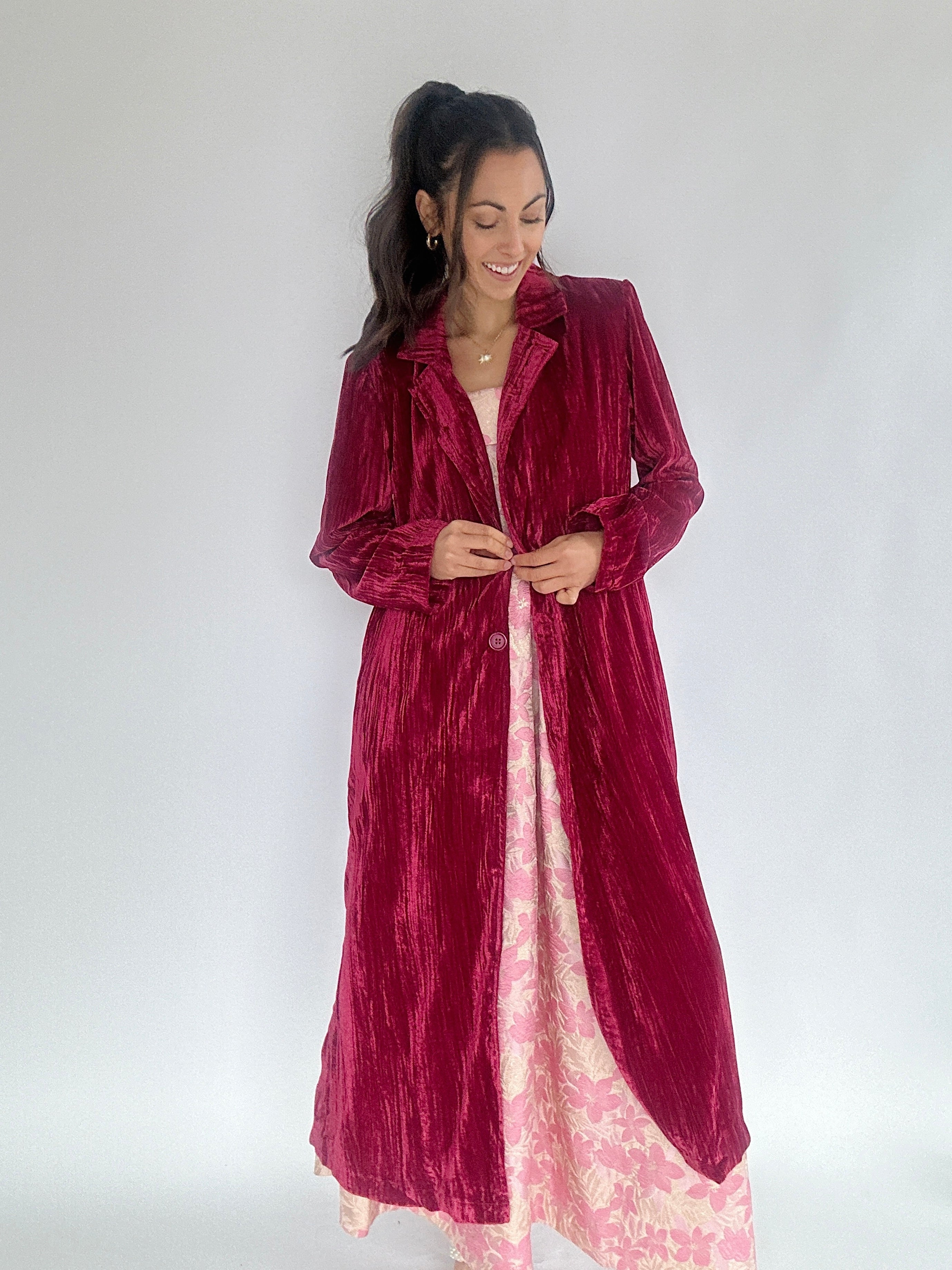 This red velvet longline coat is the statement piece your outfit is looking for! It has an open front, lapel collar, button closure, padded shoulders, side slits and pockets. Wear it over your dress to your next event or throw it over jeans a graphic tee to spice up a basic outfit! Perfect for the holiday season too :)