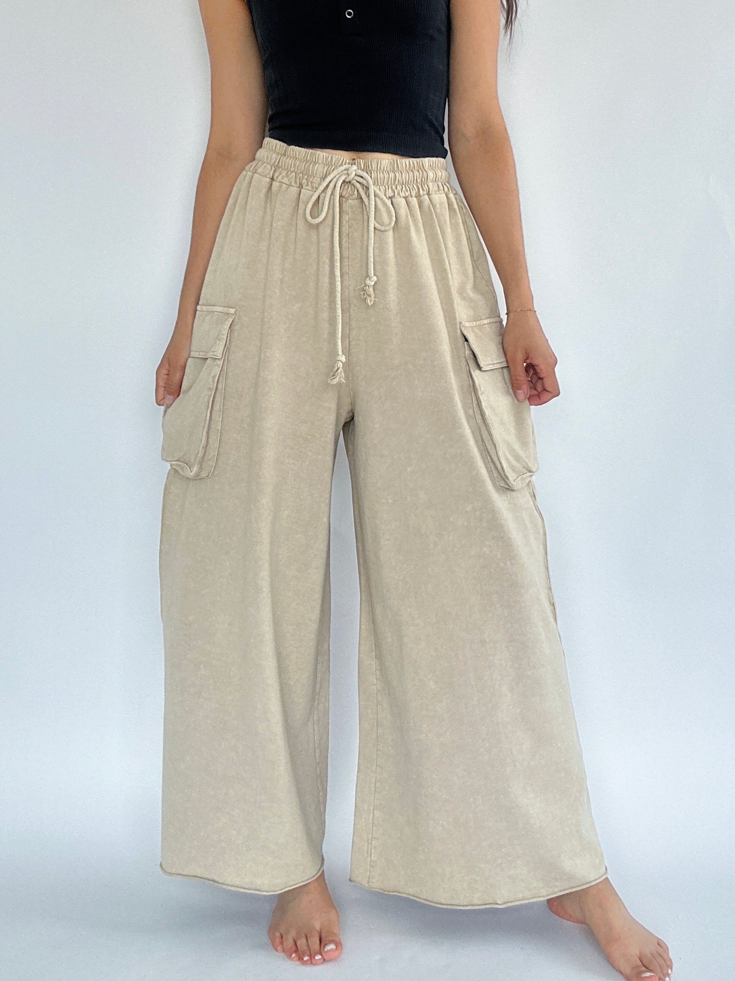 These wide leg sweatpants have cargo pockets with velcro flaps, an elastic waistband with adjustable drawstring and a cropped raw hem. We love these pants because they're cute, comfy and so east to style!