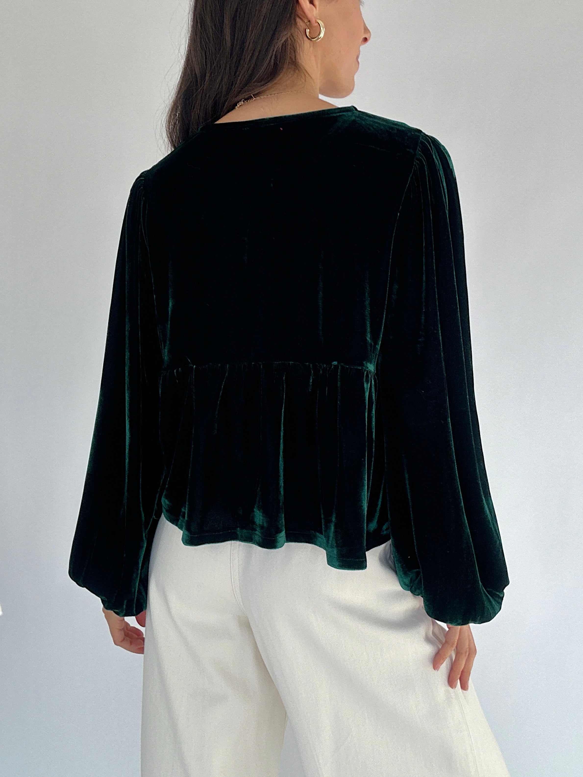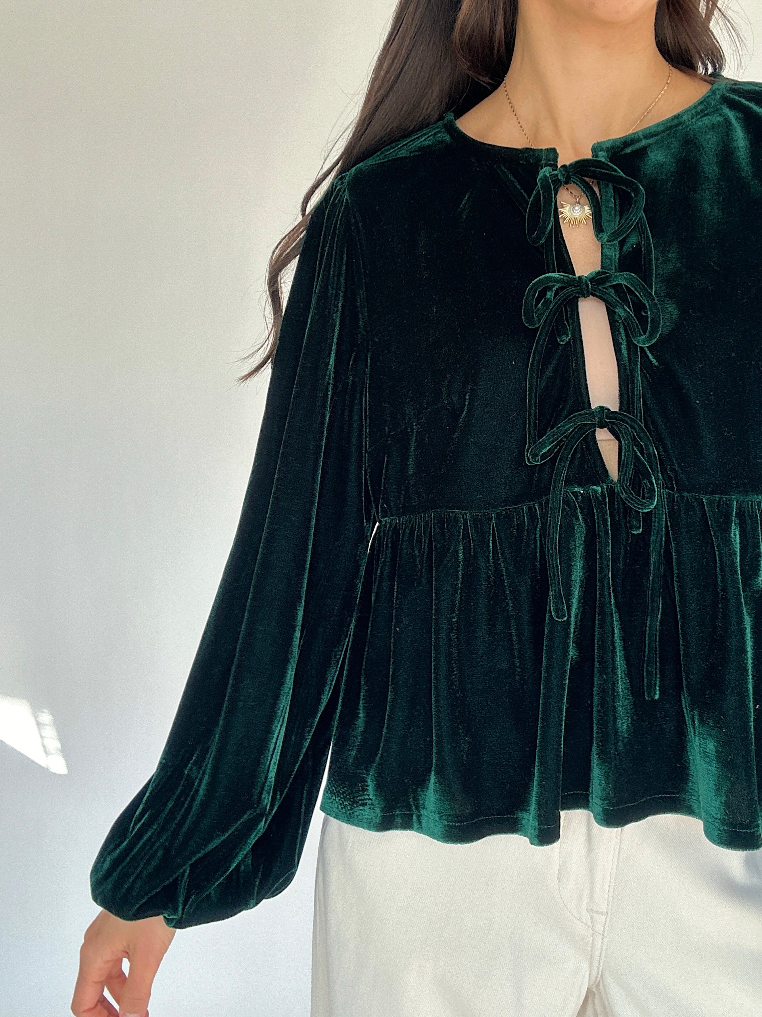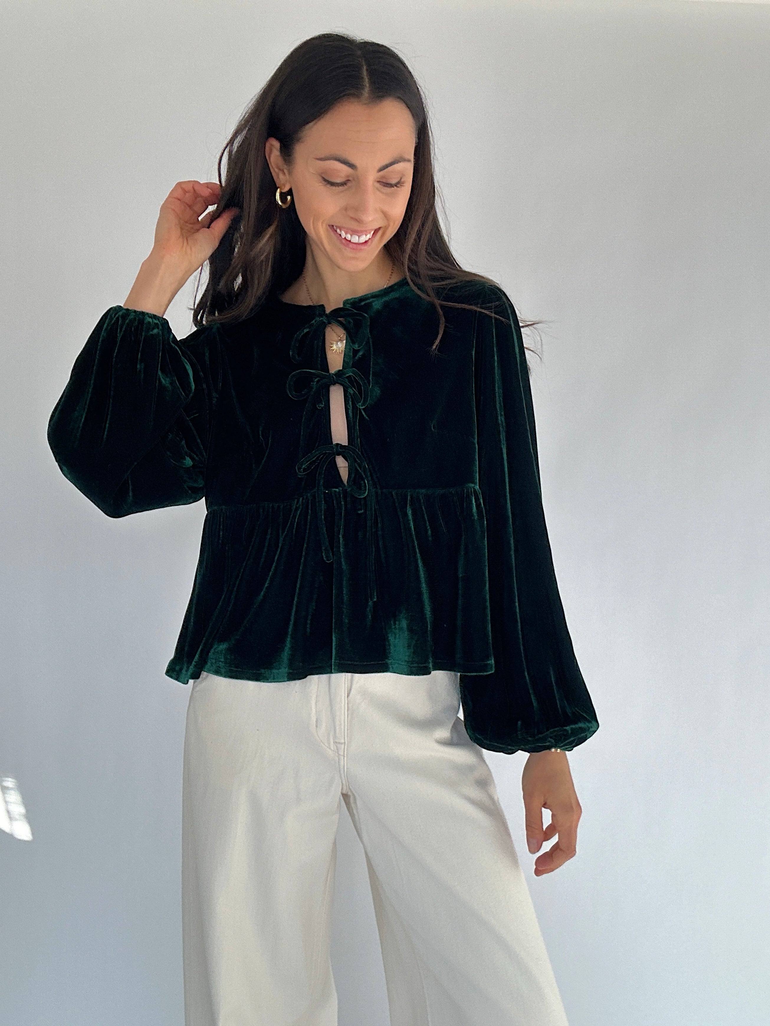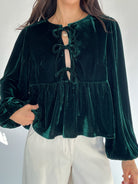 Soft, festive, and a little flirty—the Alysa Velvet Tie Front Top is an instant favorite. Made in soft hunter green velvet, this top features three playful self-ties down the front, bubble sleeves for extra charm, and a relaxed babydoll-style fit that’s both comfy and flattering. Dress it up with skirts or trousers for holiday parties, or pair it with denim and boots for a more laid-back seasonal look.