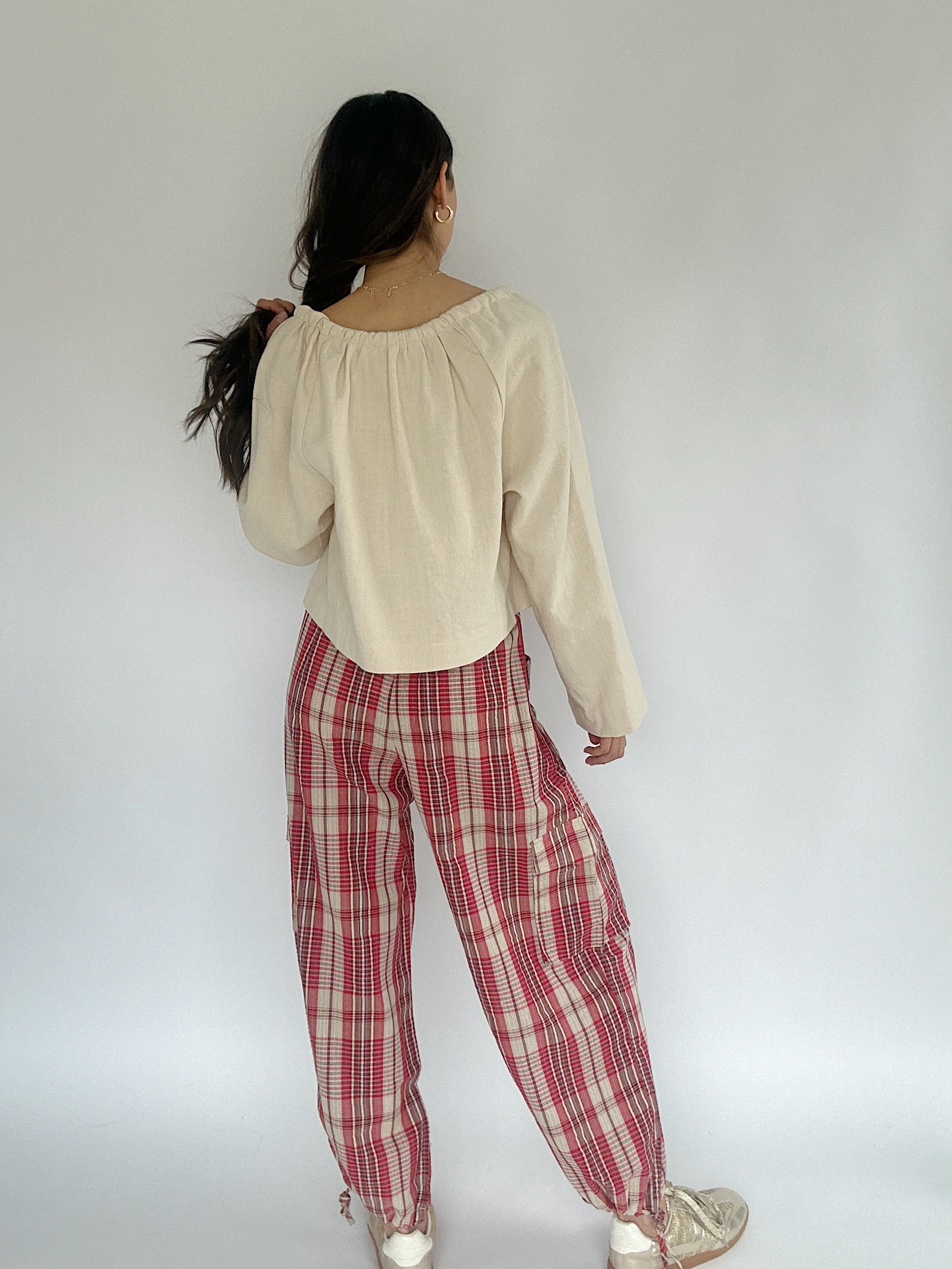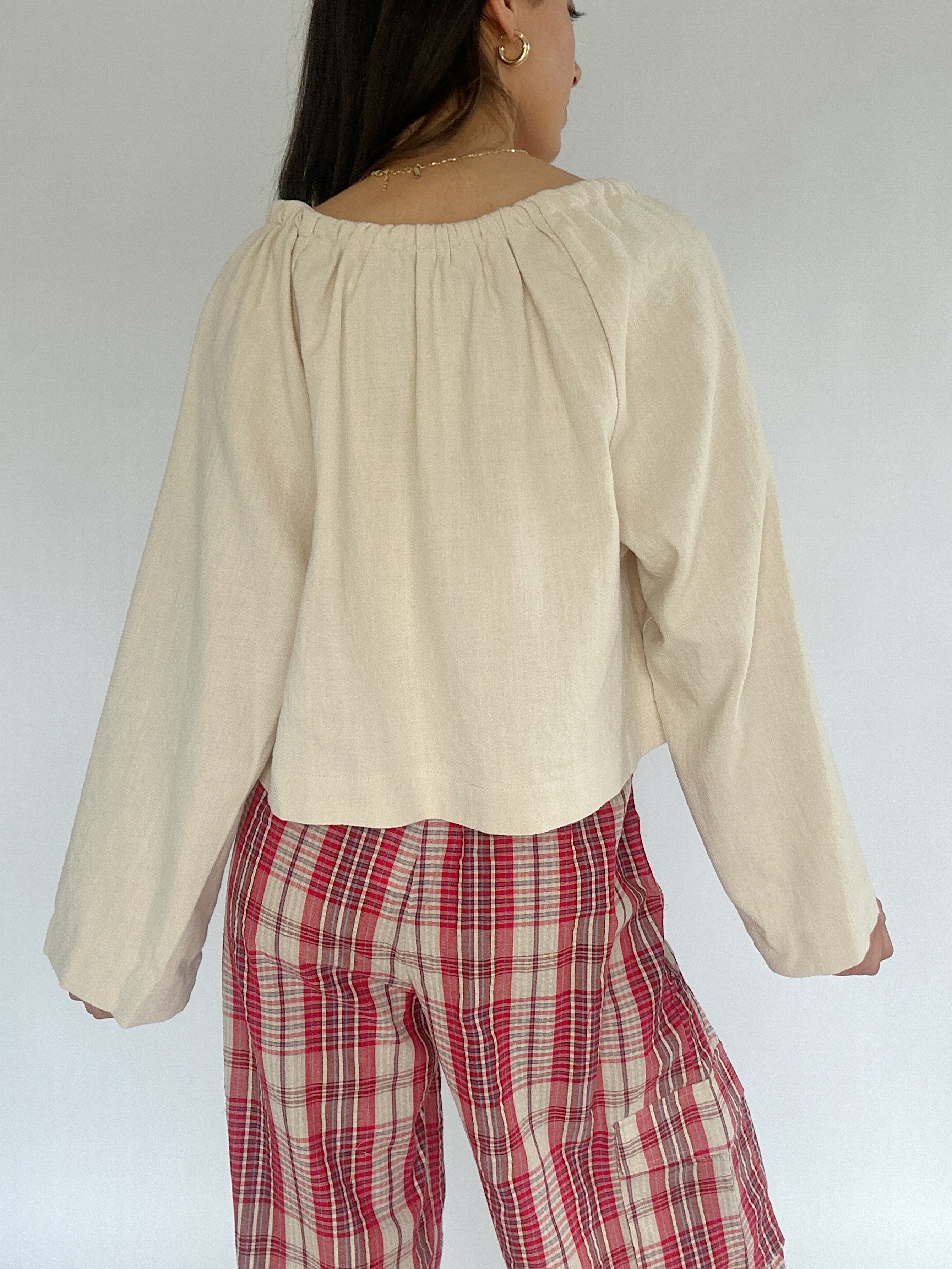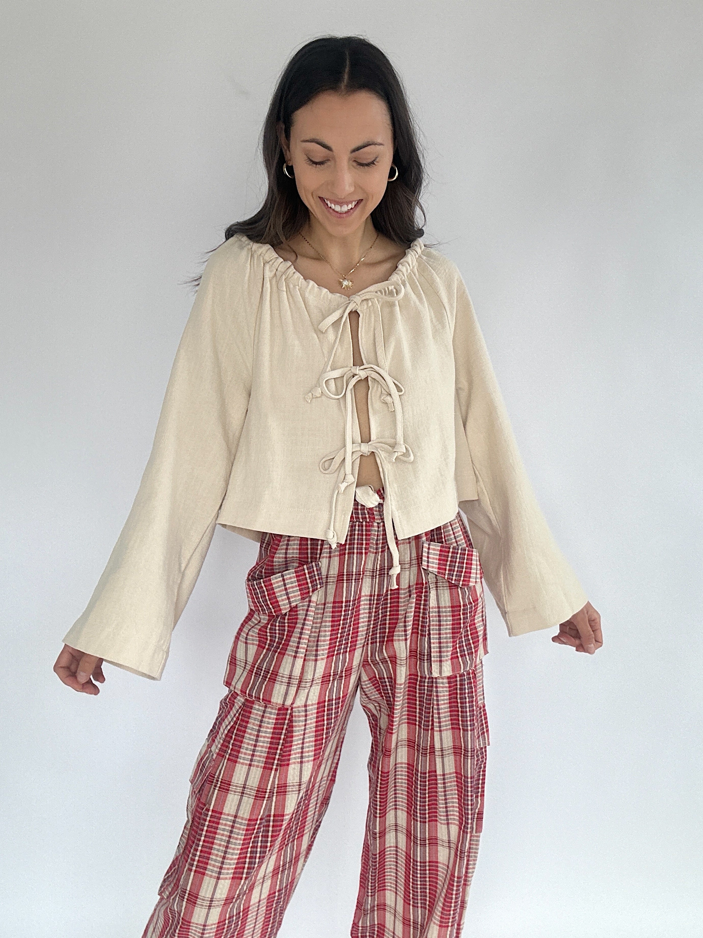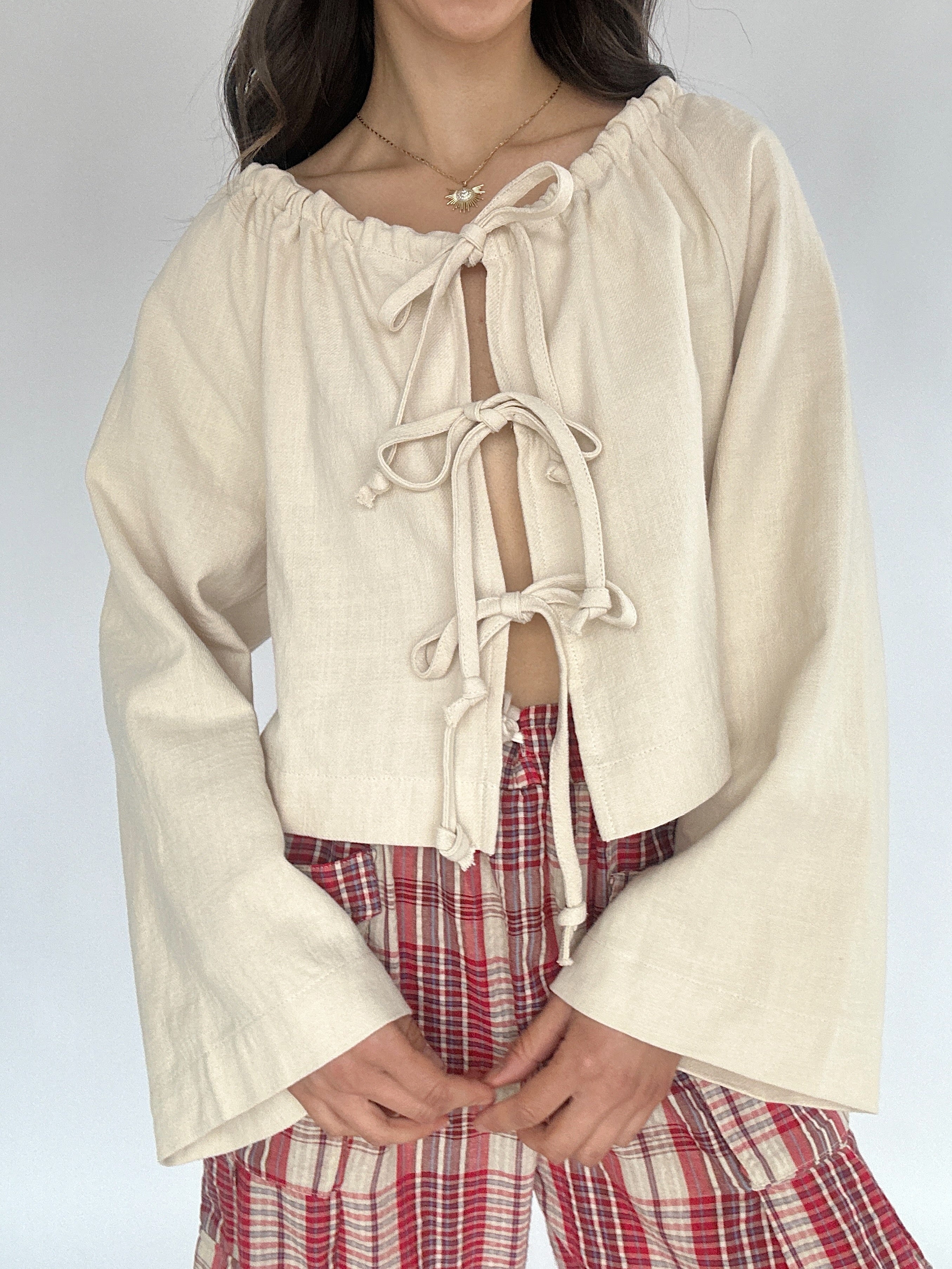 This trendy beige linen blend top is going to be your new staple! It has an adjustable neckline with drawstring tie and a three tie front. The long sleeves have a slight bell silhouette and overall, the top is loose and slightly boxy making it a comfortable wear. Pair with denim, wide leg pants, skirts or even over dresses!