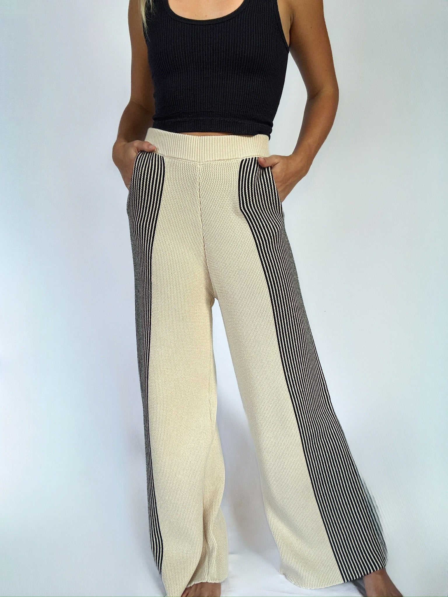 The black contrast stripes down the sides of these oatmeal knit pants give an elongating look plus the stretchy knit makes them so comfy! They have a ribbed elastic waistband and side pockets. Pair with the matching Asleep At The Wheel Sweater to make a cute set!