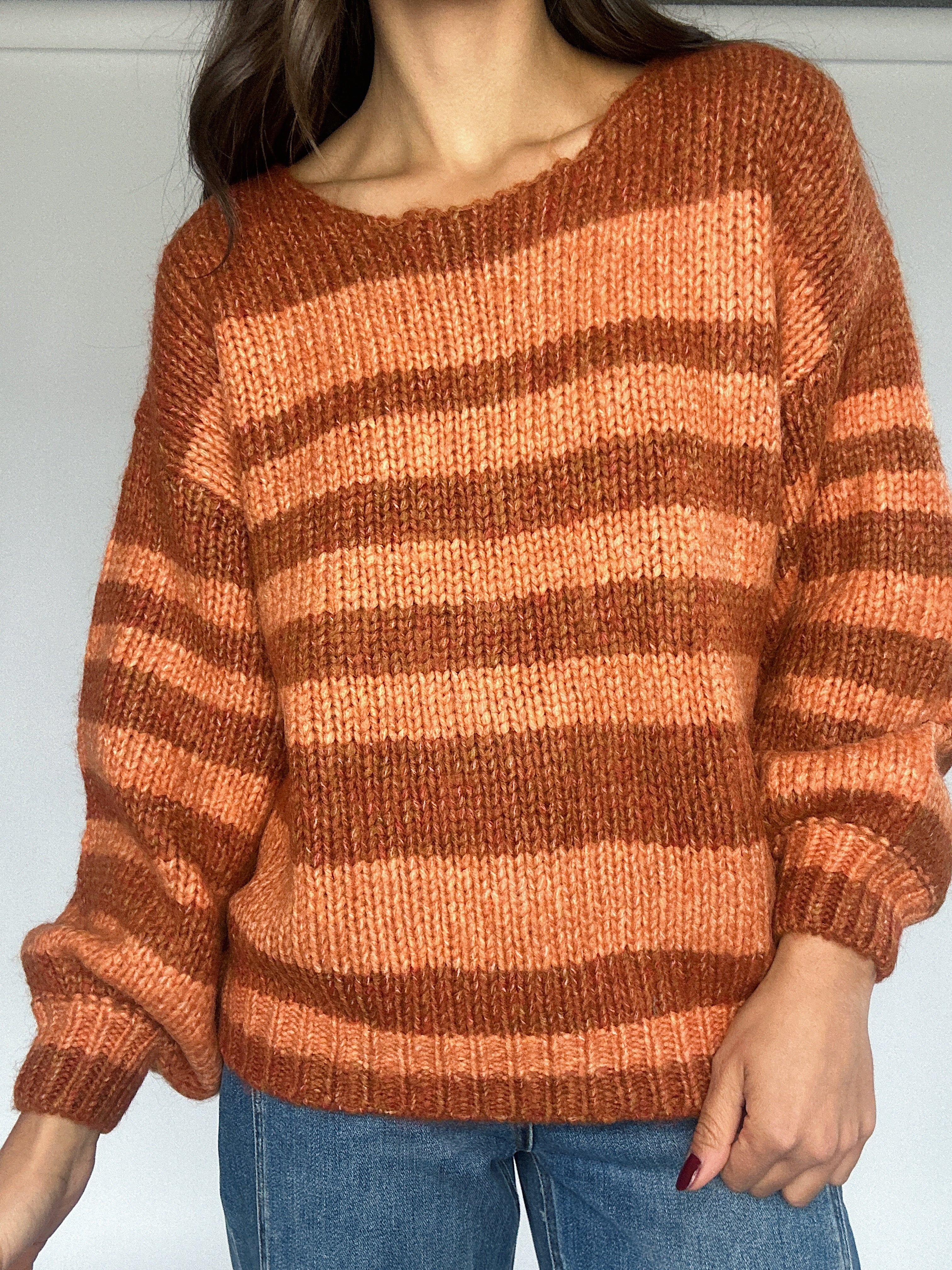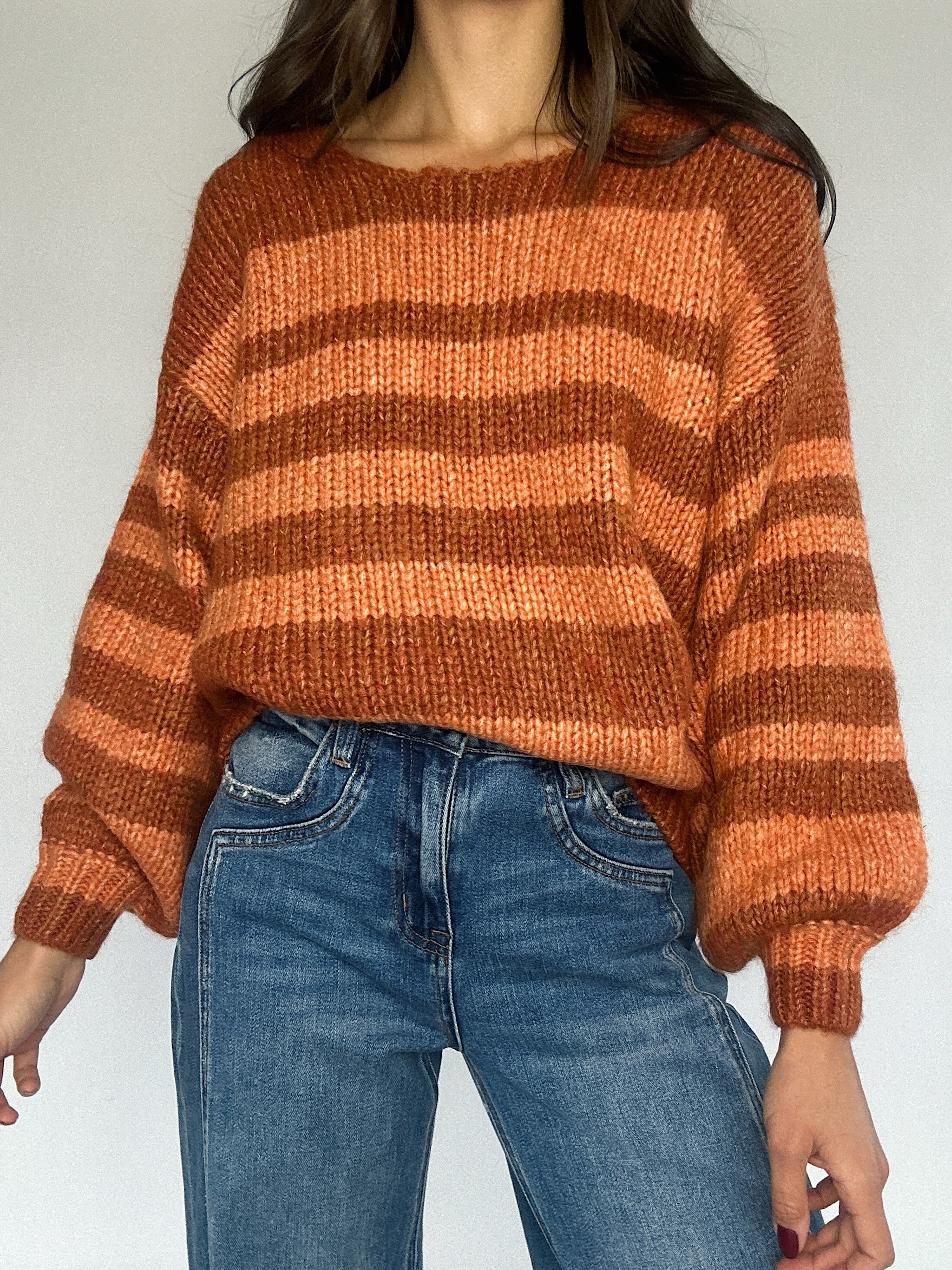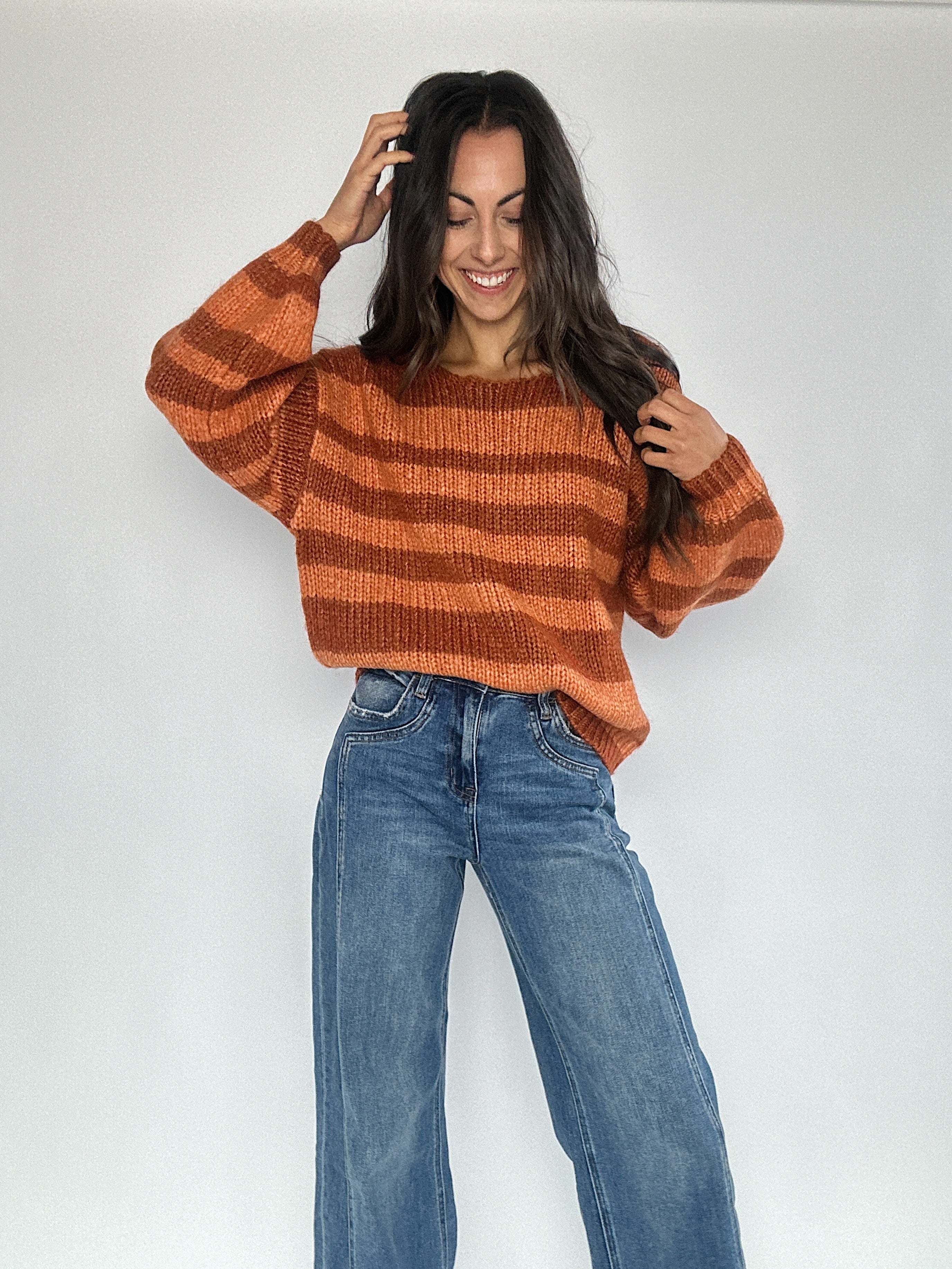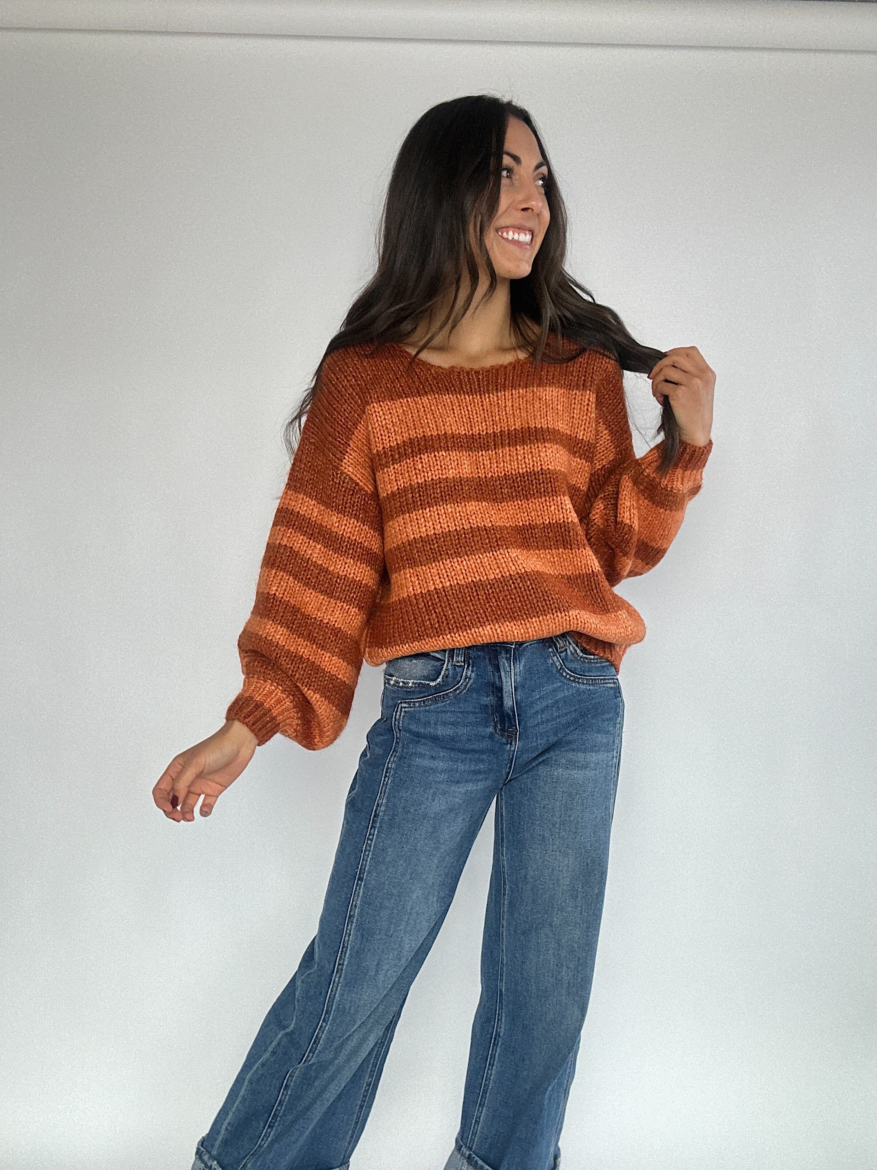 This rust orange striped sweater is giving all the cozy autumn vibes with its slouchy fit, wide neckline and loose, bubble sleeves. Pair with denim and grab yourself a pumpkin spice latte!