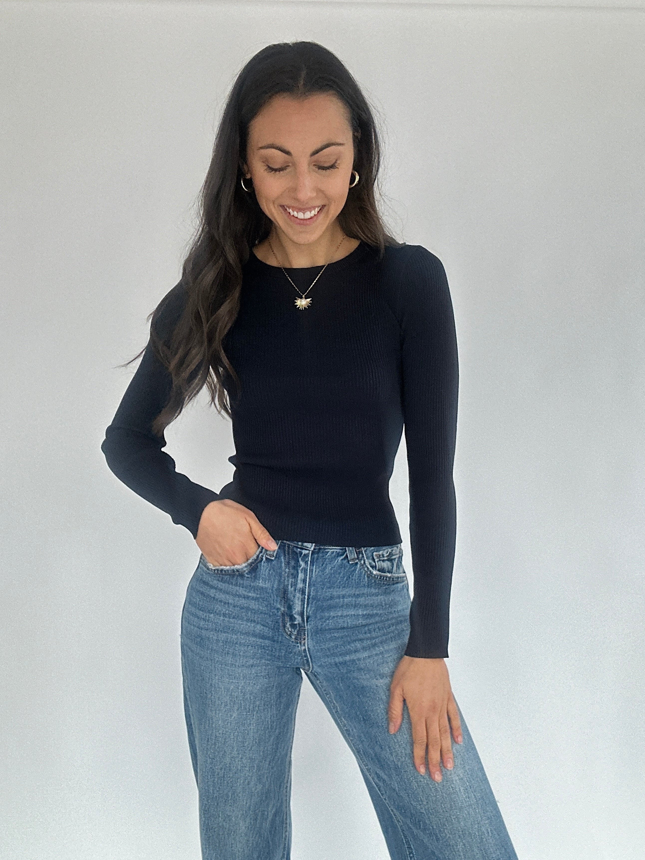 This navy blue long sleeve ribbed knit top is the perfect basic! It has a crew neckline and fitted silhouette that makes it great for layering.