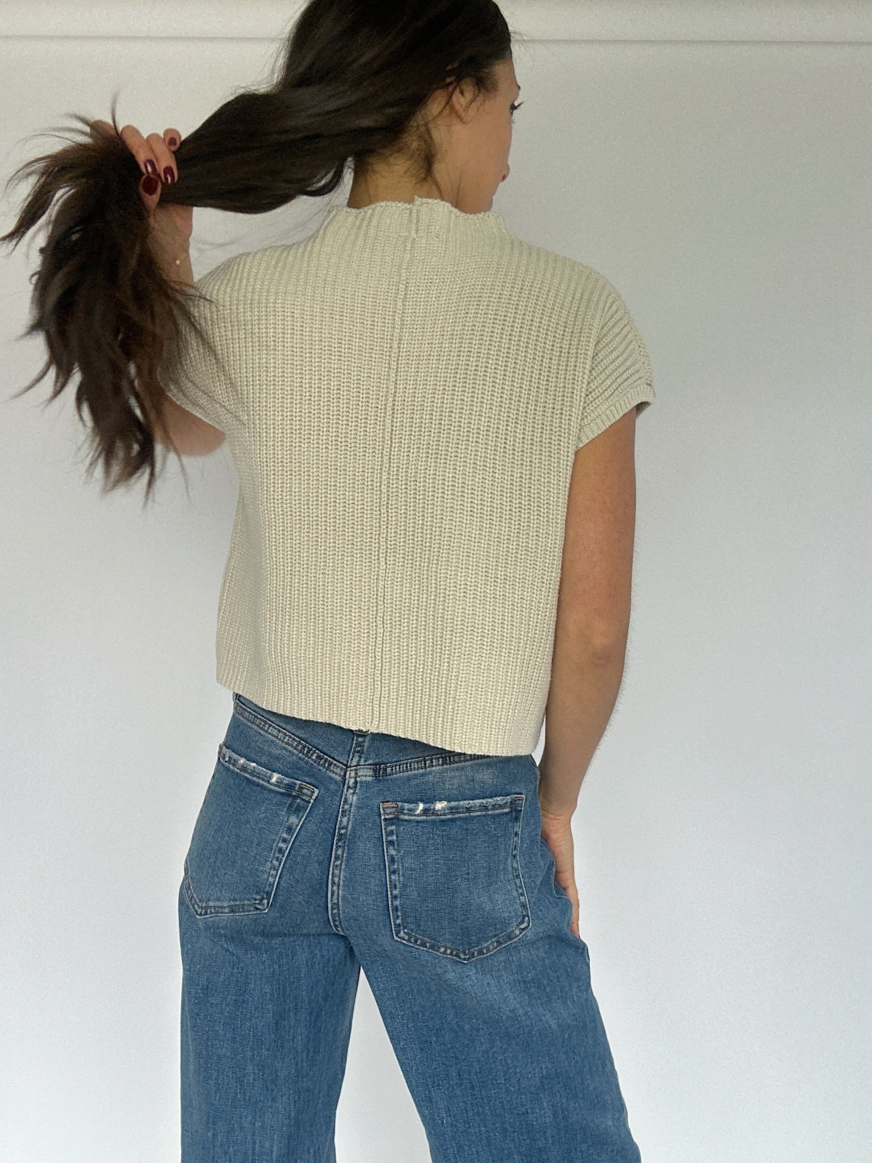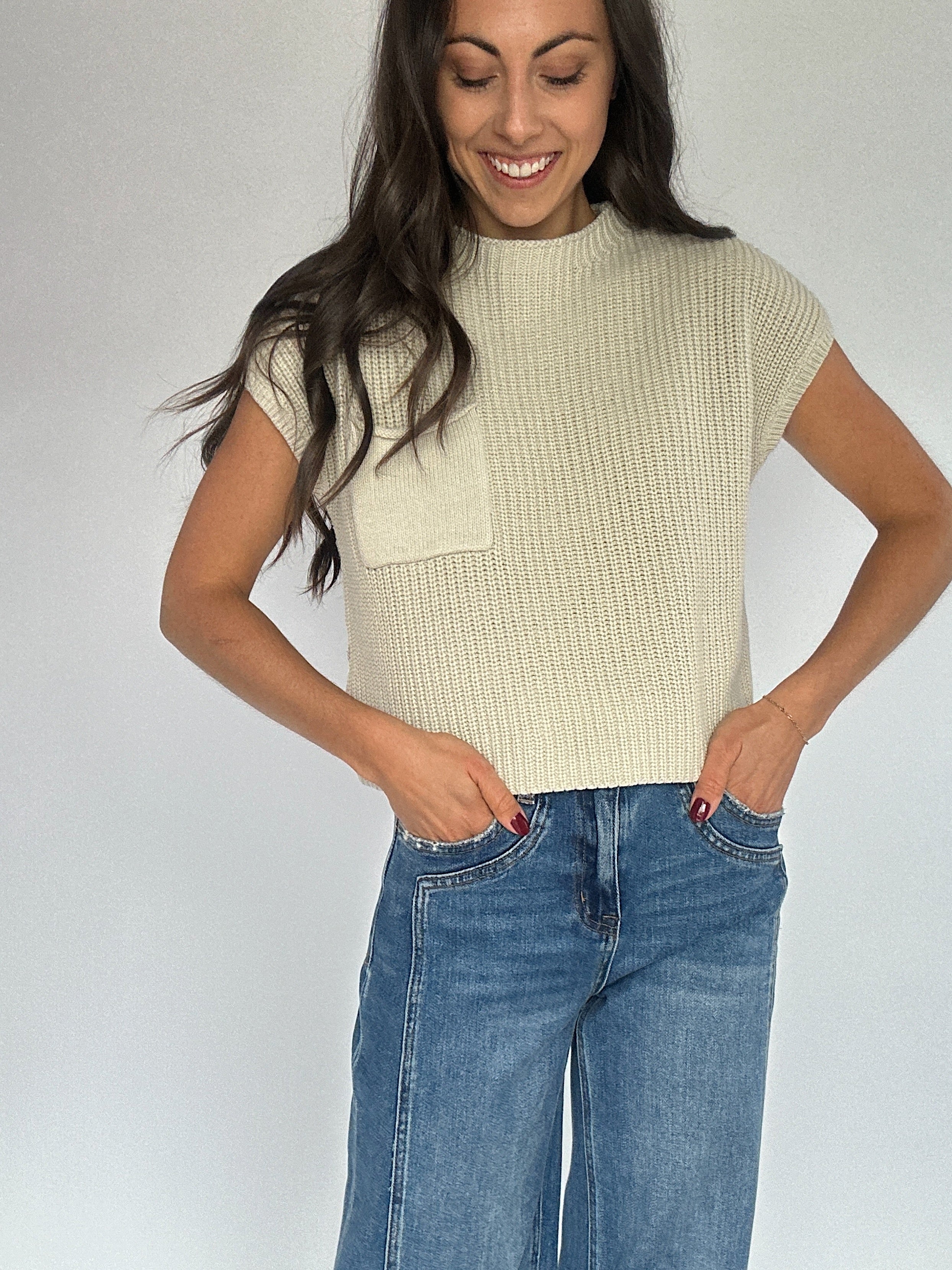 This stone knit top has short sleeves and a half mock neckline with a front chest pocket. Its slightly cropped fit makes it easy to pair with high waisted denim, trousers or lounge pants!