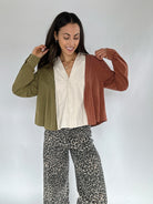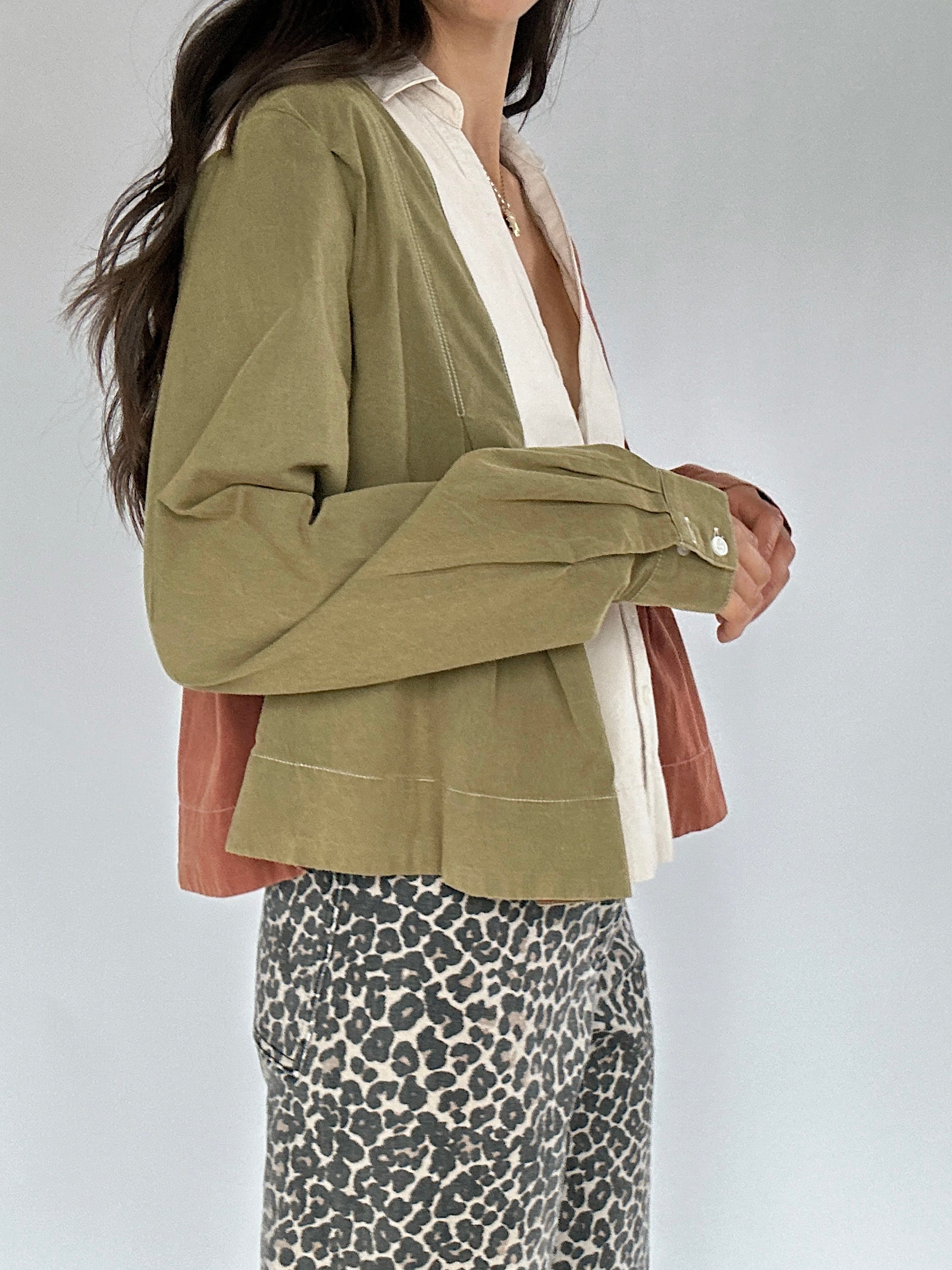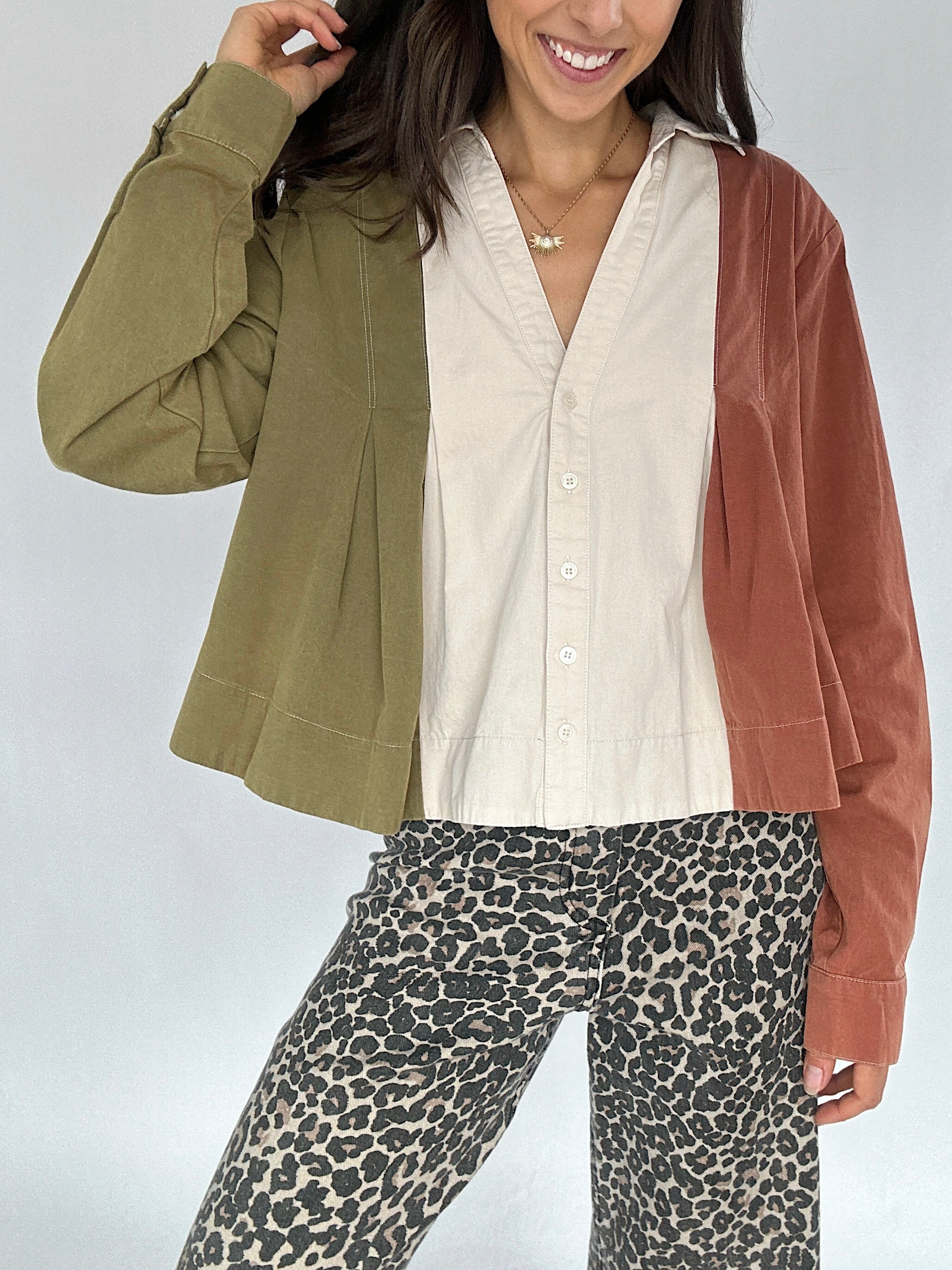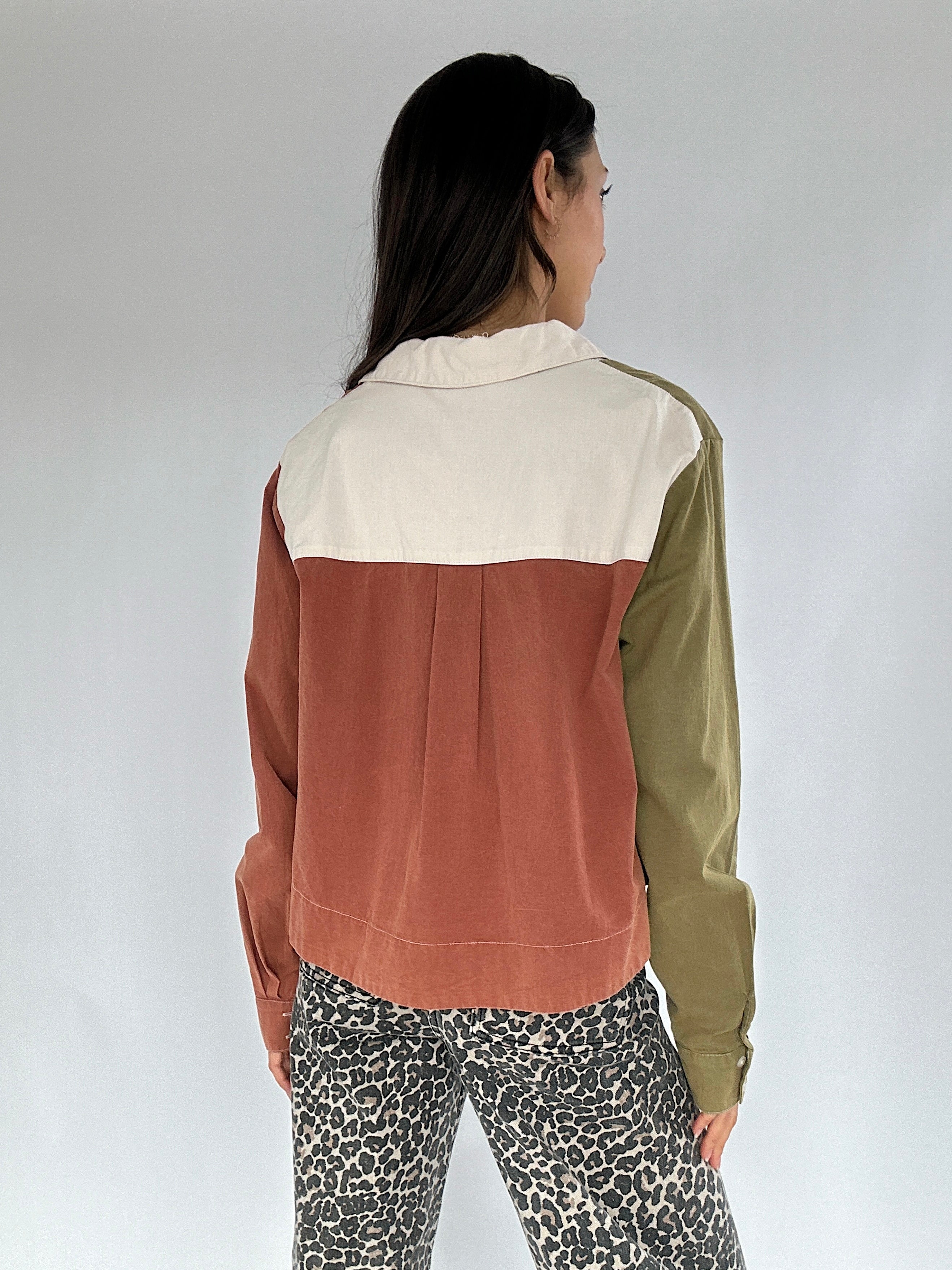 Easygoing with a little edge—the Cactus Sunset Top is a fun twist on a classic button-up. With its color block palette of rust, cream, and olive, this cropped cotton top is perfect for your fall wardrobe. The pleated front, boxy fit, and deconstructed paneling give it a cool, lived-in look that’s just as great for casual days as it is layered up for a statement vibe. Pair it with some boots for a little western moment too!