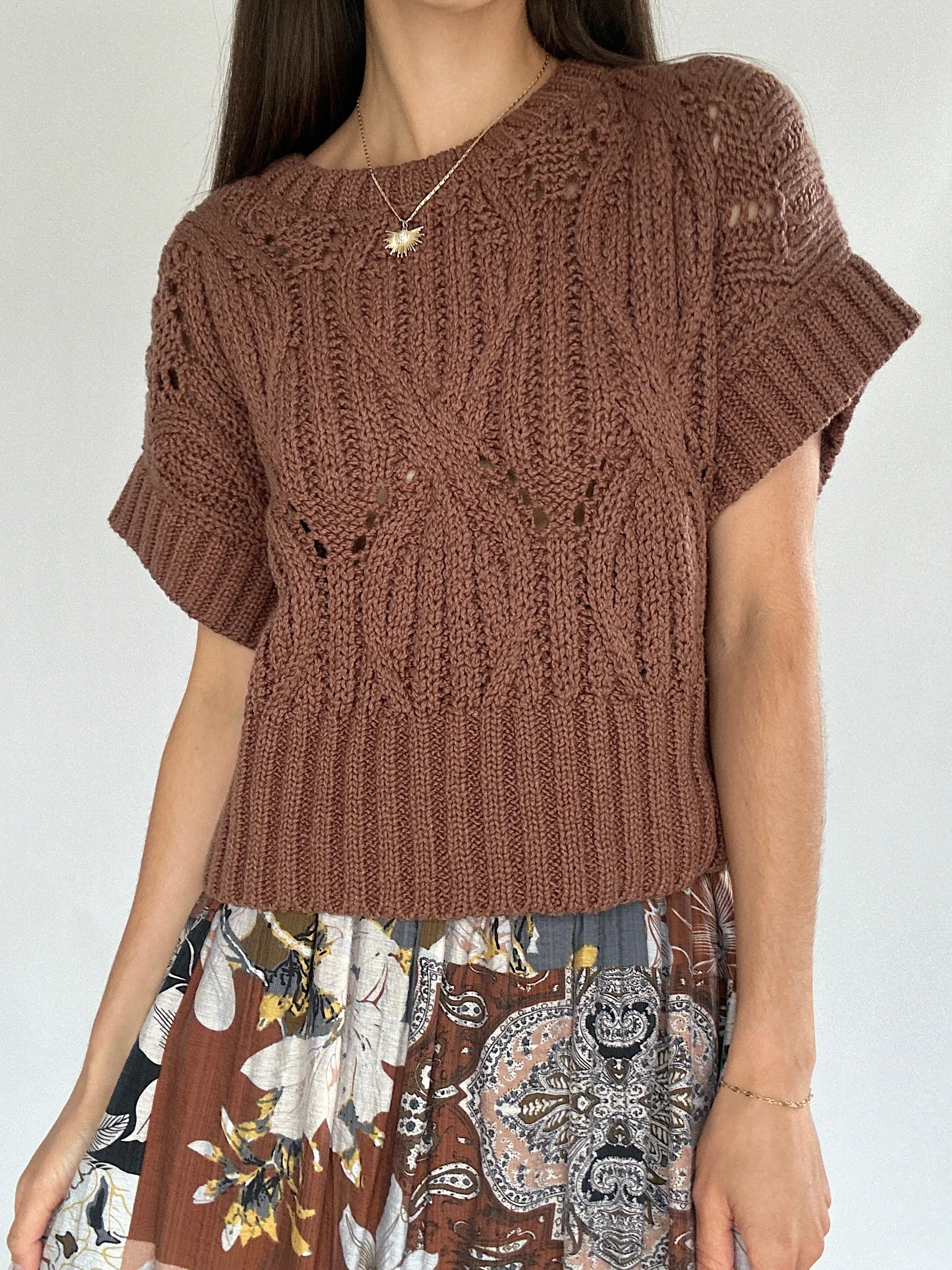 This dark brown short sleeve sweater has a round neckline and slightly cropped fit. So cute for transitioning seasons with wide leg pants, shorts or your favorite jeans! We also love throwing it over dresses too.
