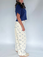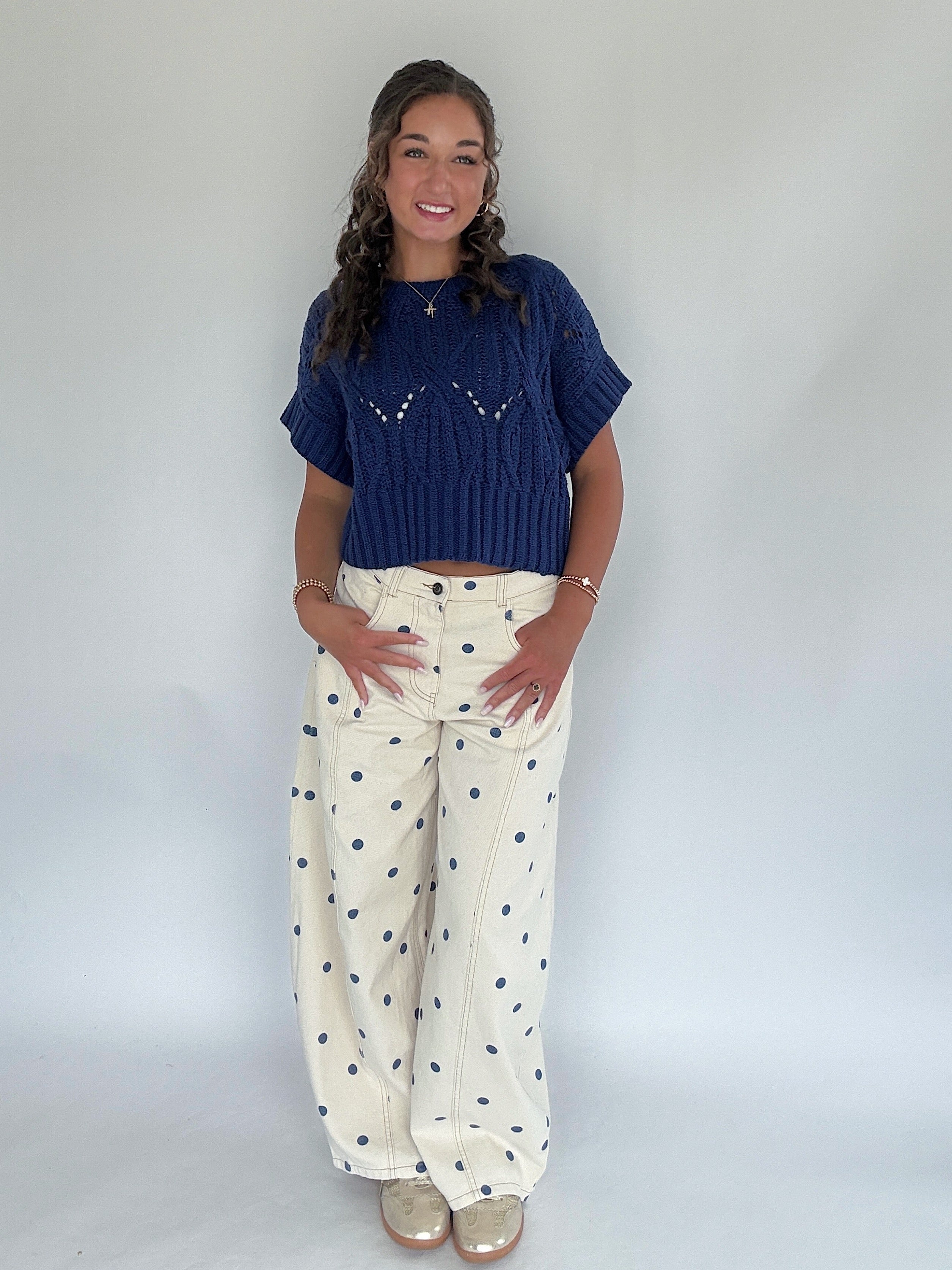 This navy blue short sleeve sweater has a round neckline and slightly cropped fit. So cute for transitioning seasons with wide leg pants, shorts or your favorite jeans! We also love throwing it over dresses too.