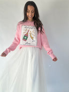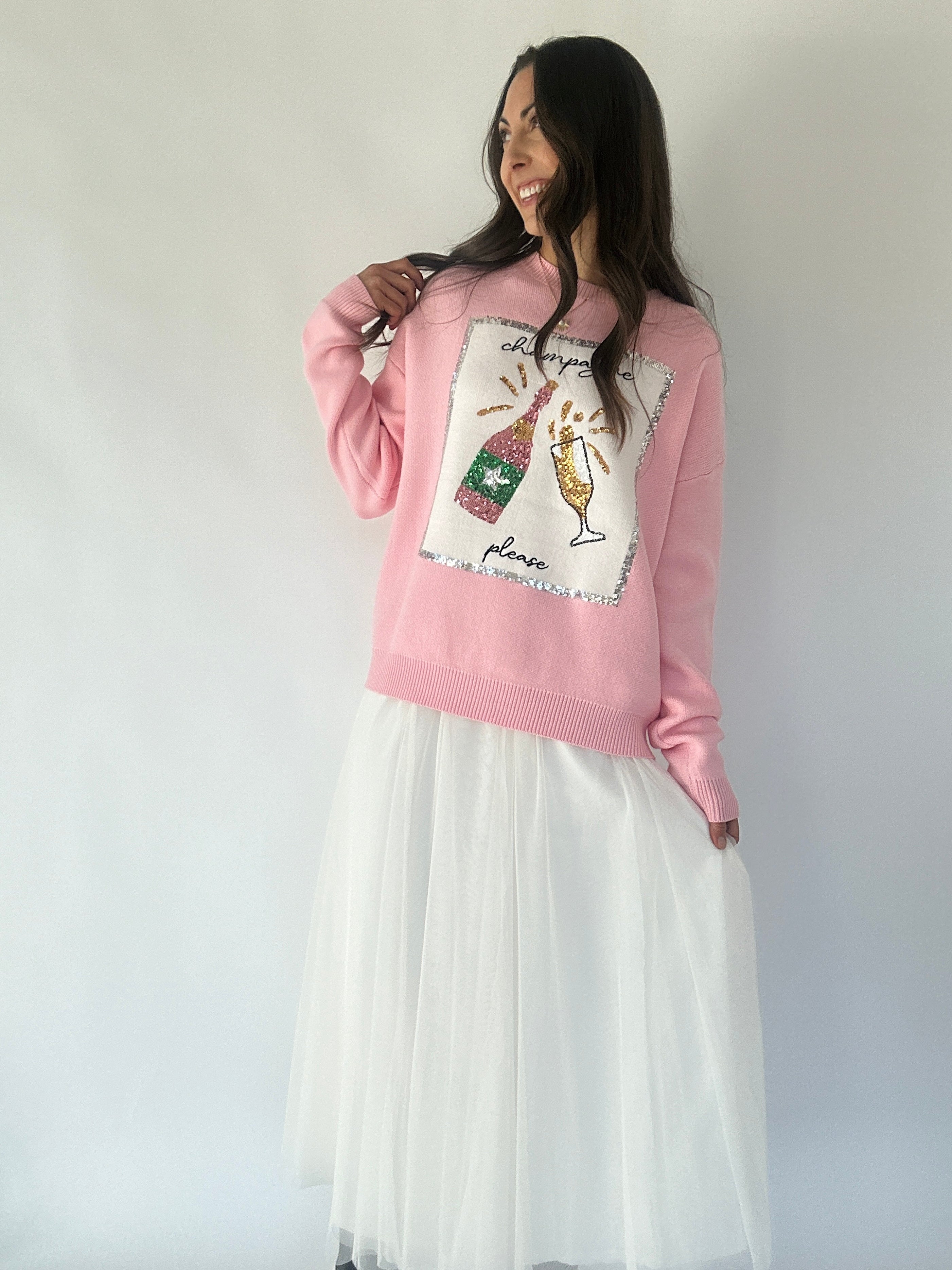 This fun pink sweater has sequined champagne bottle. Pair with some denim or a skirt and you're ready for the party!
