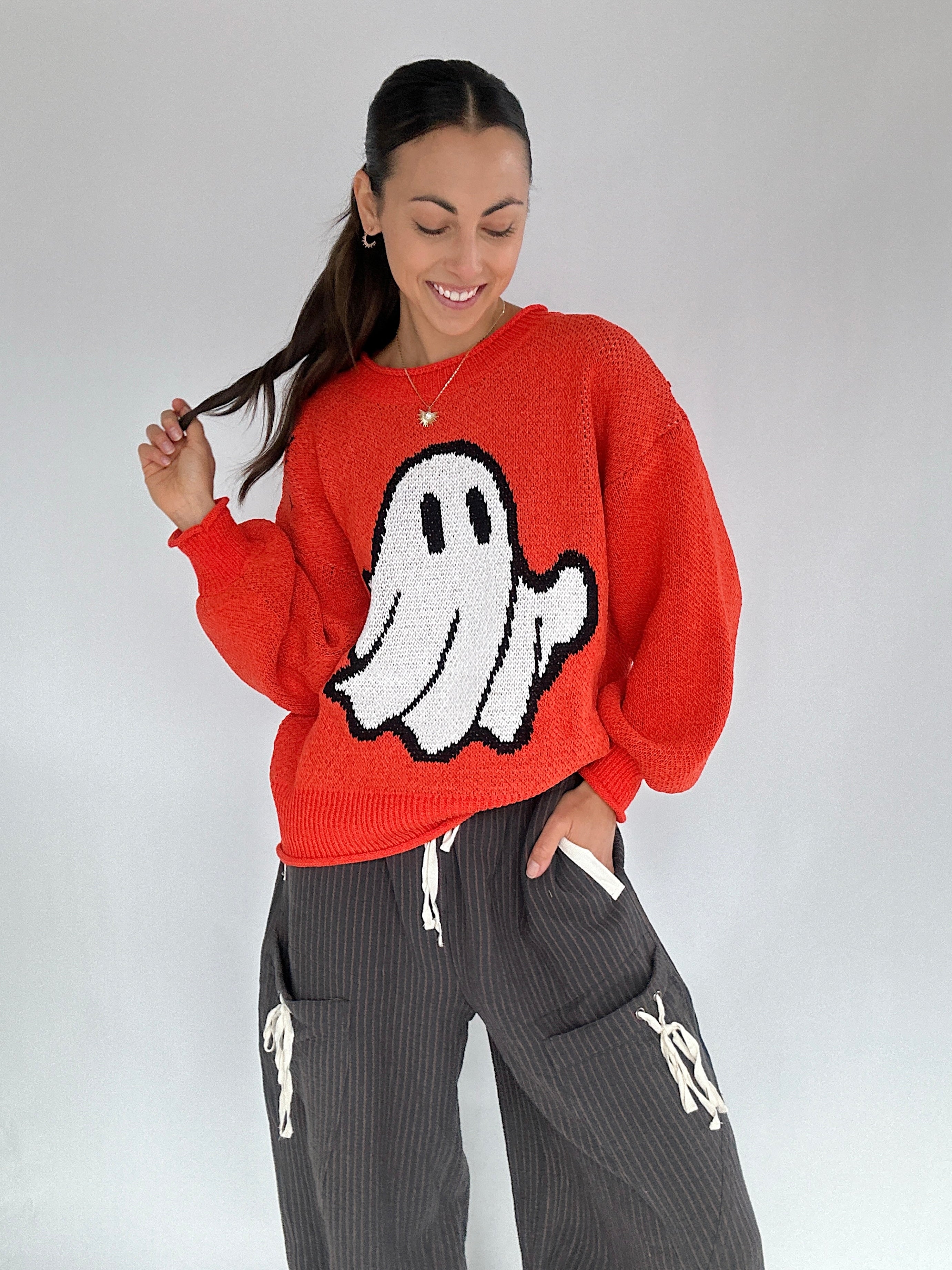 A cozy touch of spooky-cute style—the Friendly Ghost Sweater is perfect for pumpkin patches, trick-or-treating, or casual fall days. Featuring a cheerful ghost graphic with little bat details, this festive orange knit has a crew neckline, ribbed cuffs and hem, and a relaxed pullover fit. Medium weight keeps you warm without being bulky, making it your new go-to sweater for the season.