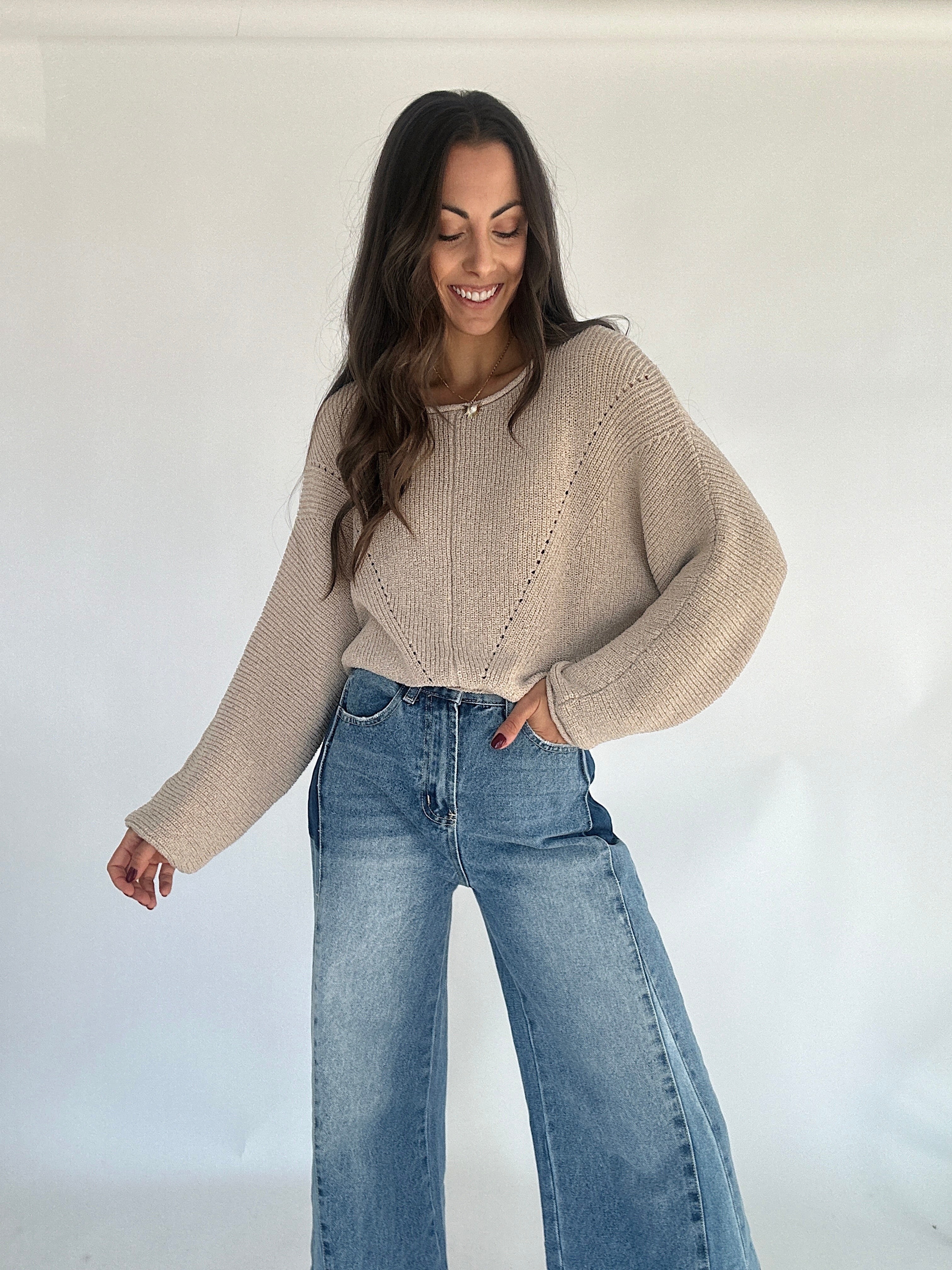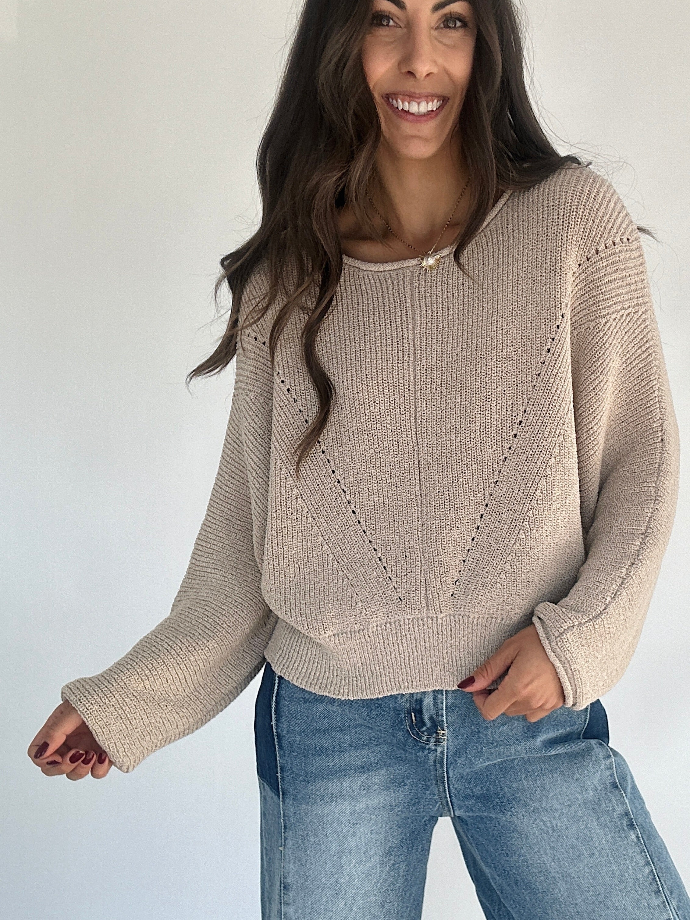This oatmeal ribbed knit sweater has a boat neckline, rolled collar and cuffs at the eld of long dolman sleeves and pointelle detail throughout.