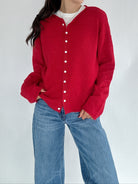 Timeless yet modern, the Jeanie Cardigan is the red staple you’ll reach for all year long. Featuring a rolled collar, button-down front, and long sleeves with dropped shoulders, it blends classic design with an easygoing, relaxed fit. The lightweight knit and ribbed hem detail make it versatile enough to wear on its own or layered as outerwear.