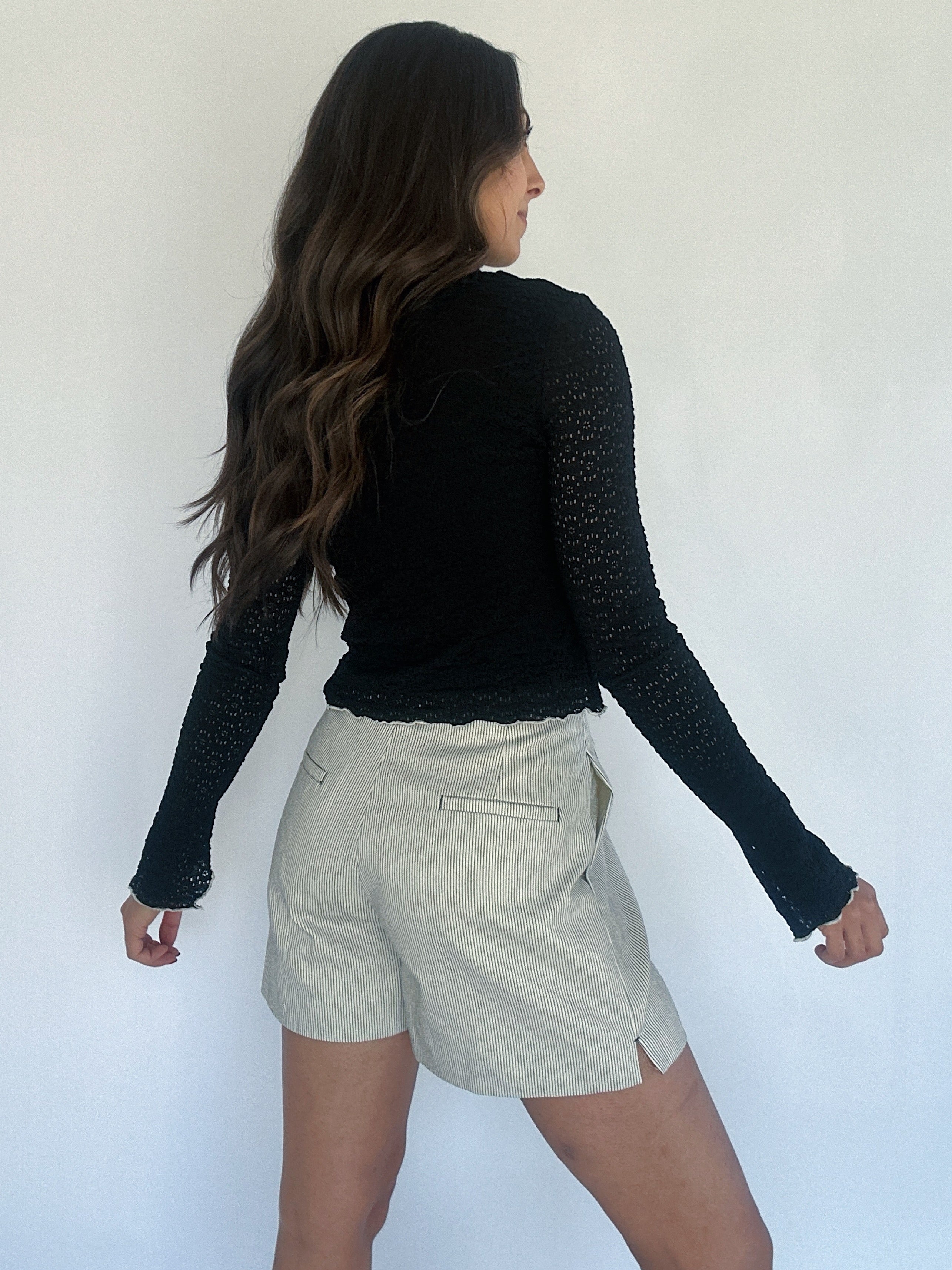 This floral lace long sleeve top has a high neckline with ruffle hems and is so cute on its own or as a layering piece under vests, dresses, overalls or graphic tees!
