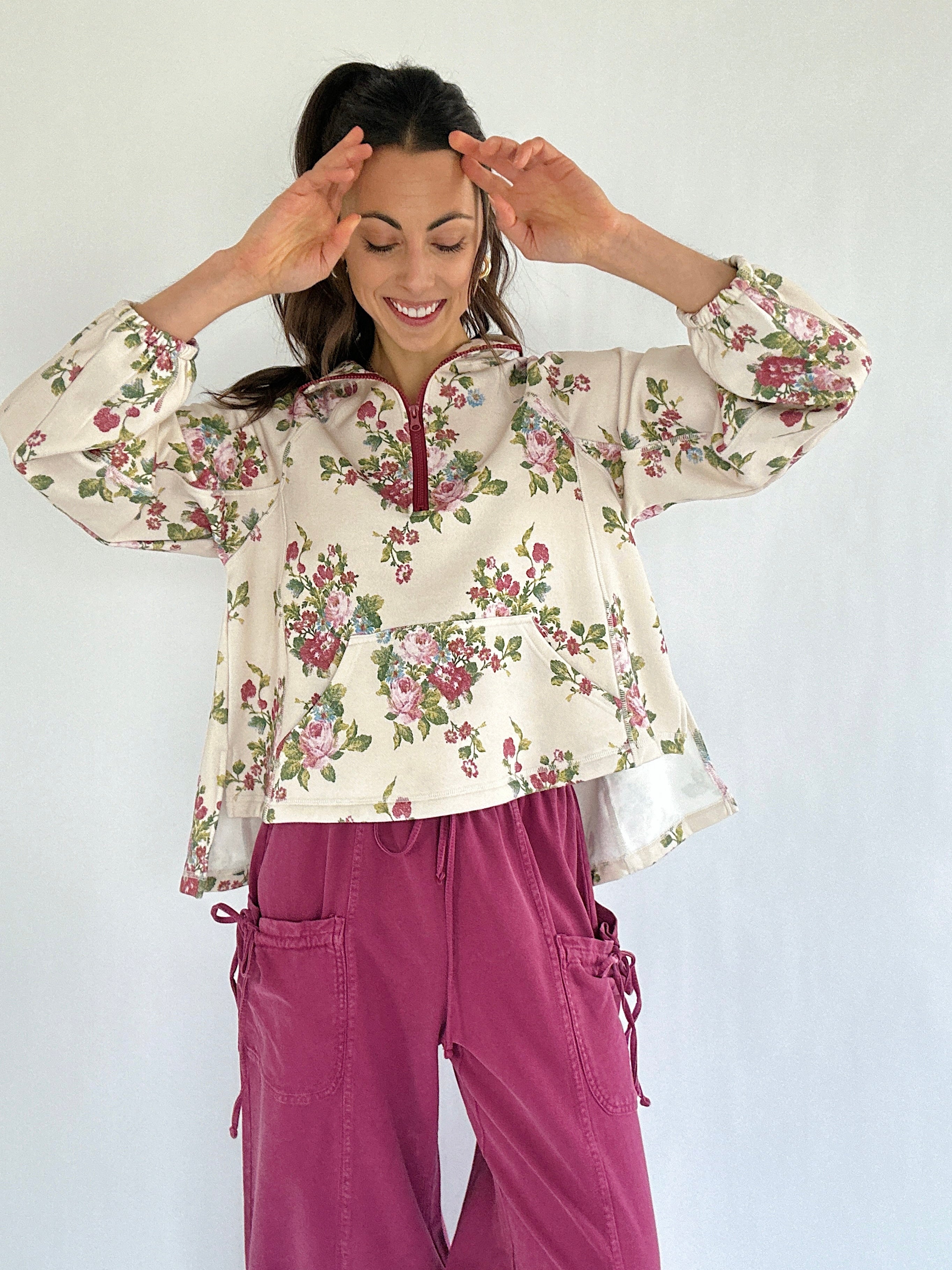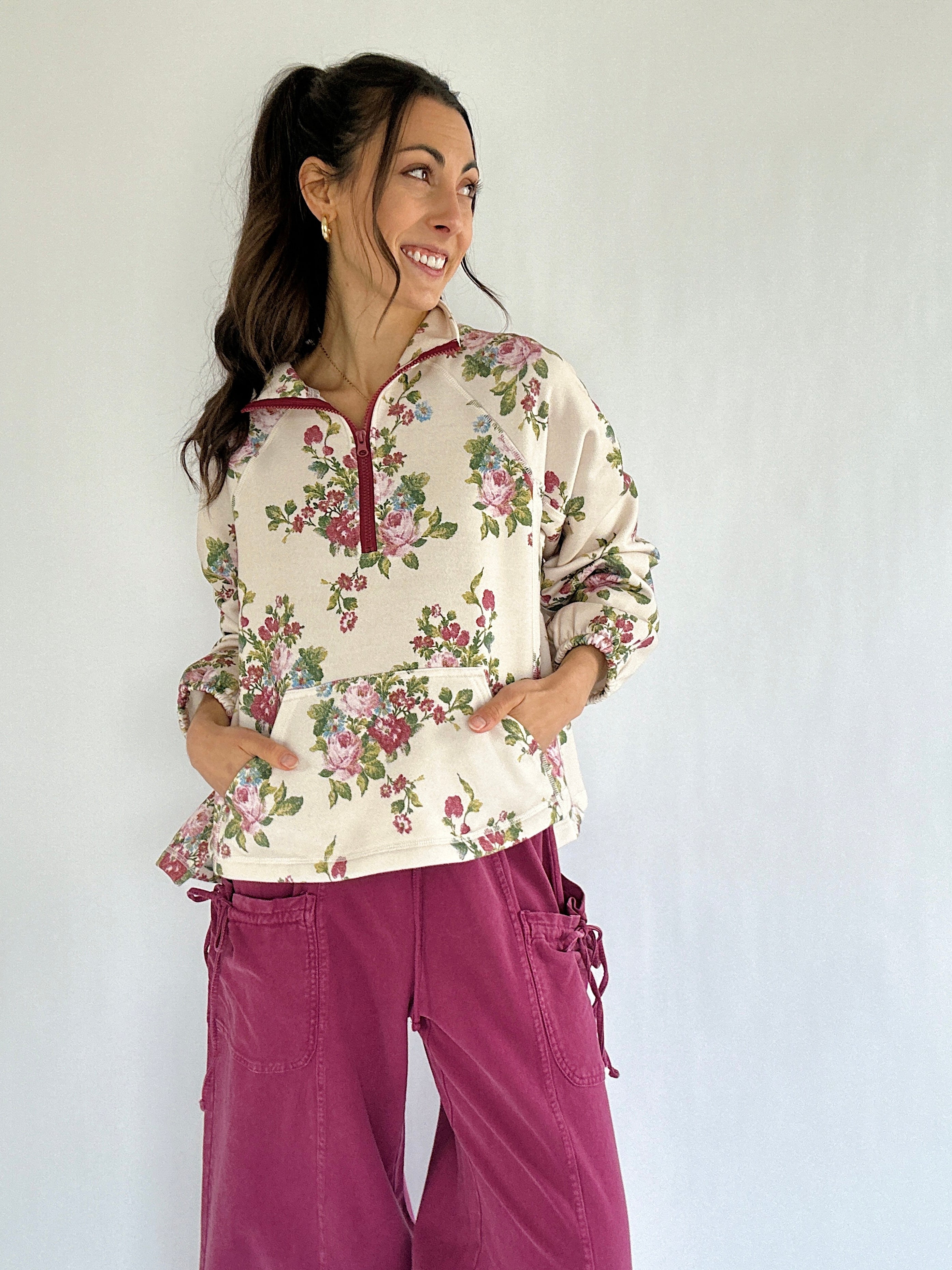 Made for coffee runs, walks, or just hanging out in something comfy. The Maeve Floral Half Zip is soft and relaxed, with an all-over floral print that brings a fun pop. The half-zip lets you wear it open or closed, and the front kangaroo pocket adds a functional, laid-back touch. The back hem is slightly longer, giving extra coverage for casual wear. Pair with the matching joggers to make an adorable lounge set!