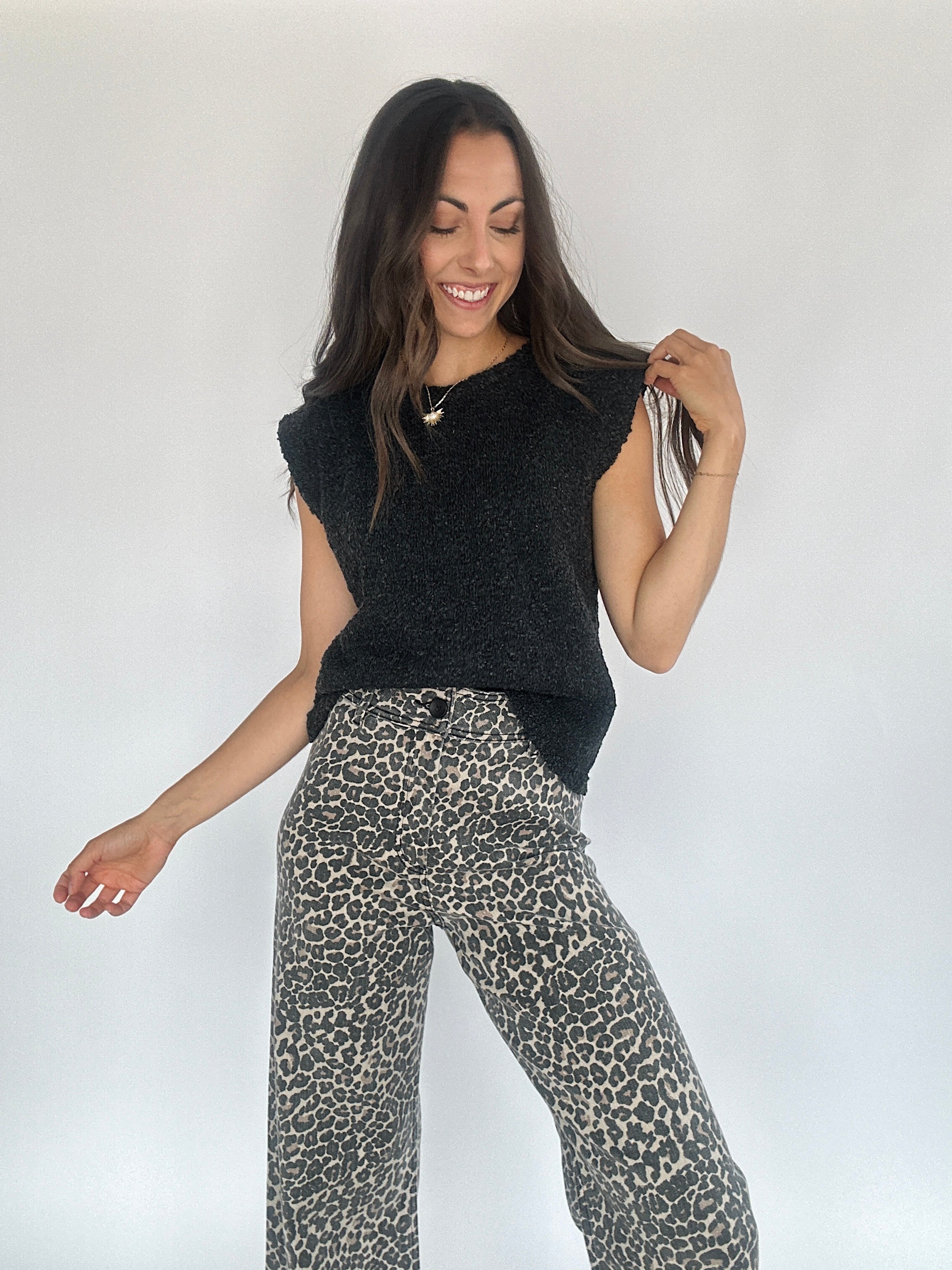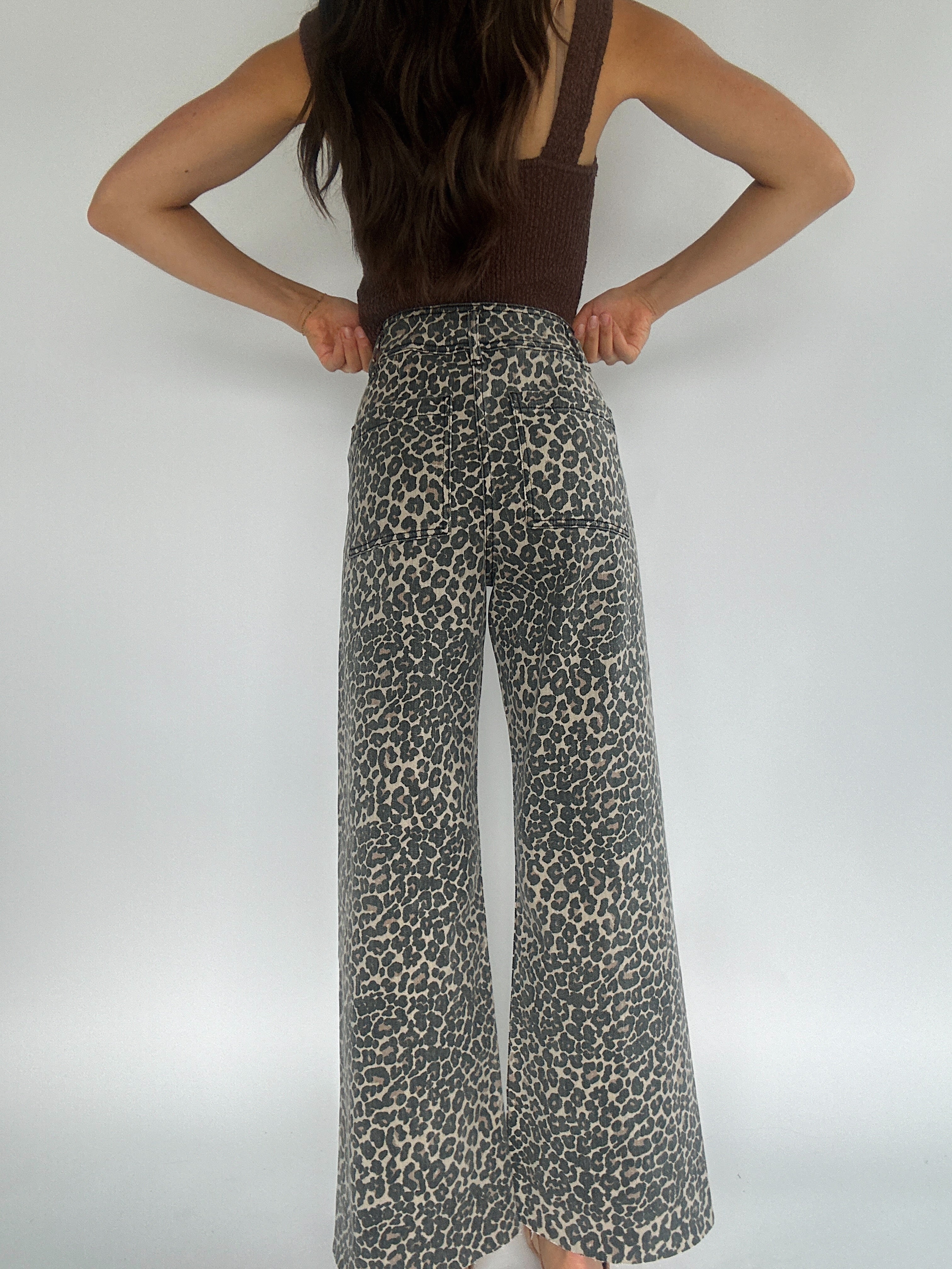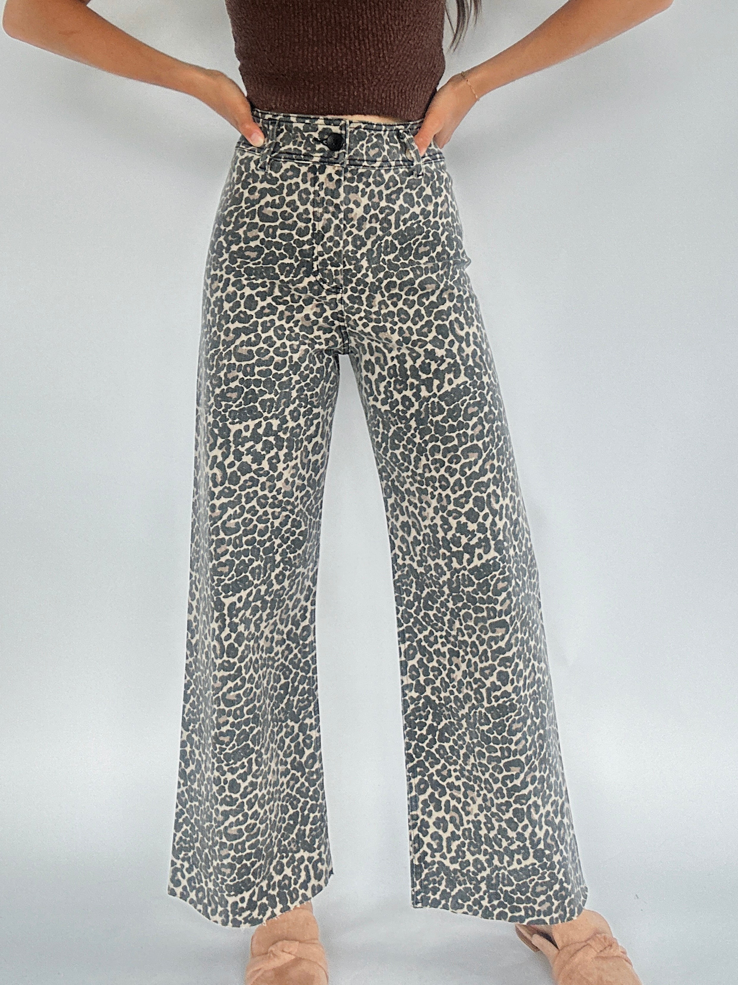 Leopard is back and we are here for it! These leopard pants have a wide leg fit, high waist, zip fly and button top with belt loops. So easy to style with graphic tees or sweaters all season!