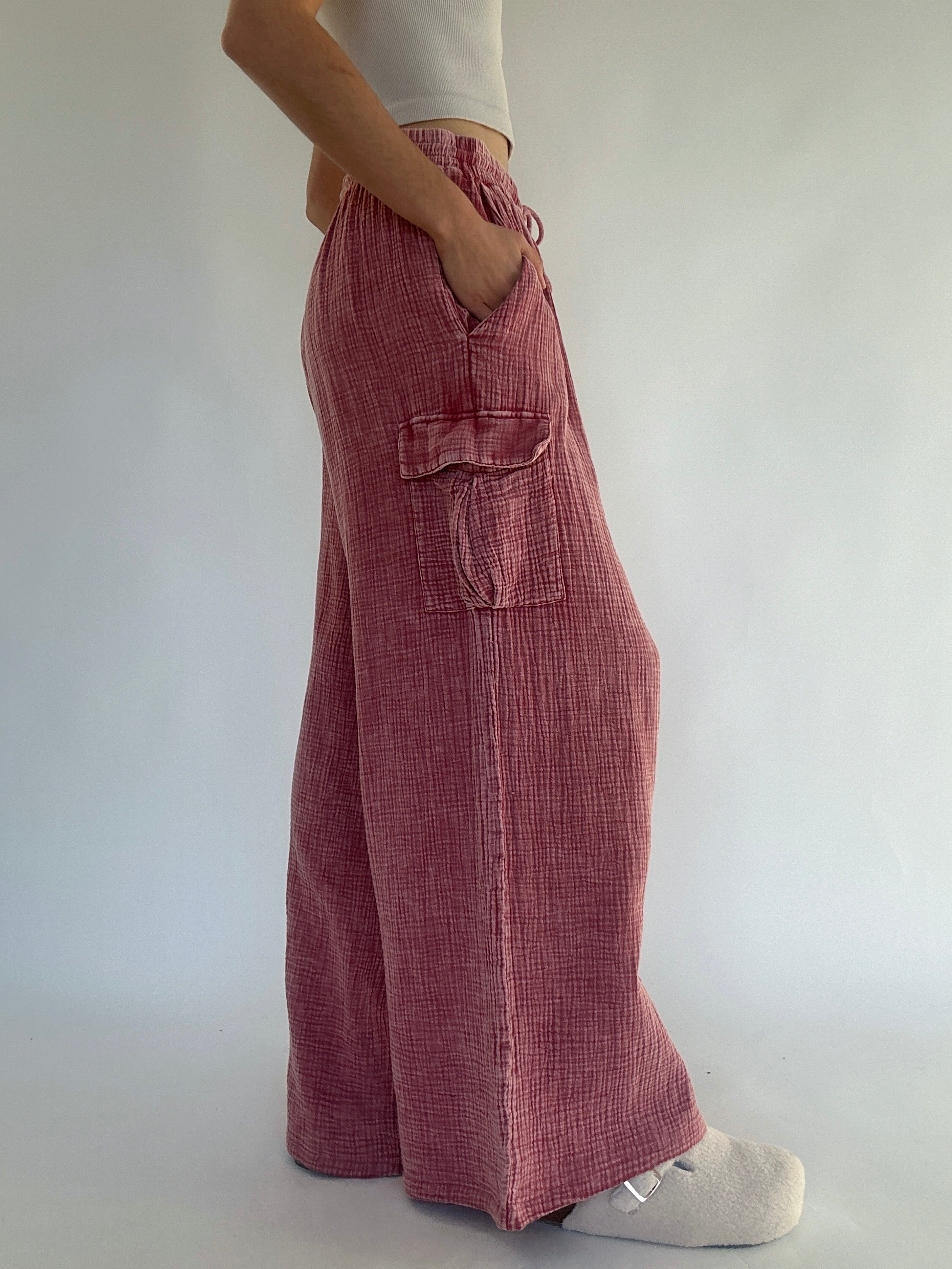 These raspberry red mineral washed cotton gauze wide leg pants have cargo side pockets, elastic waistband with adjustable tie and make the cutest most aesthetic set when paired with the matching North Bound Hoodie Top!