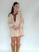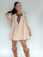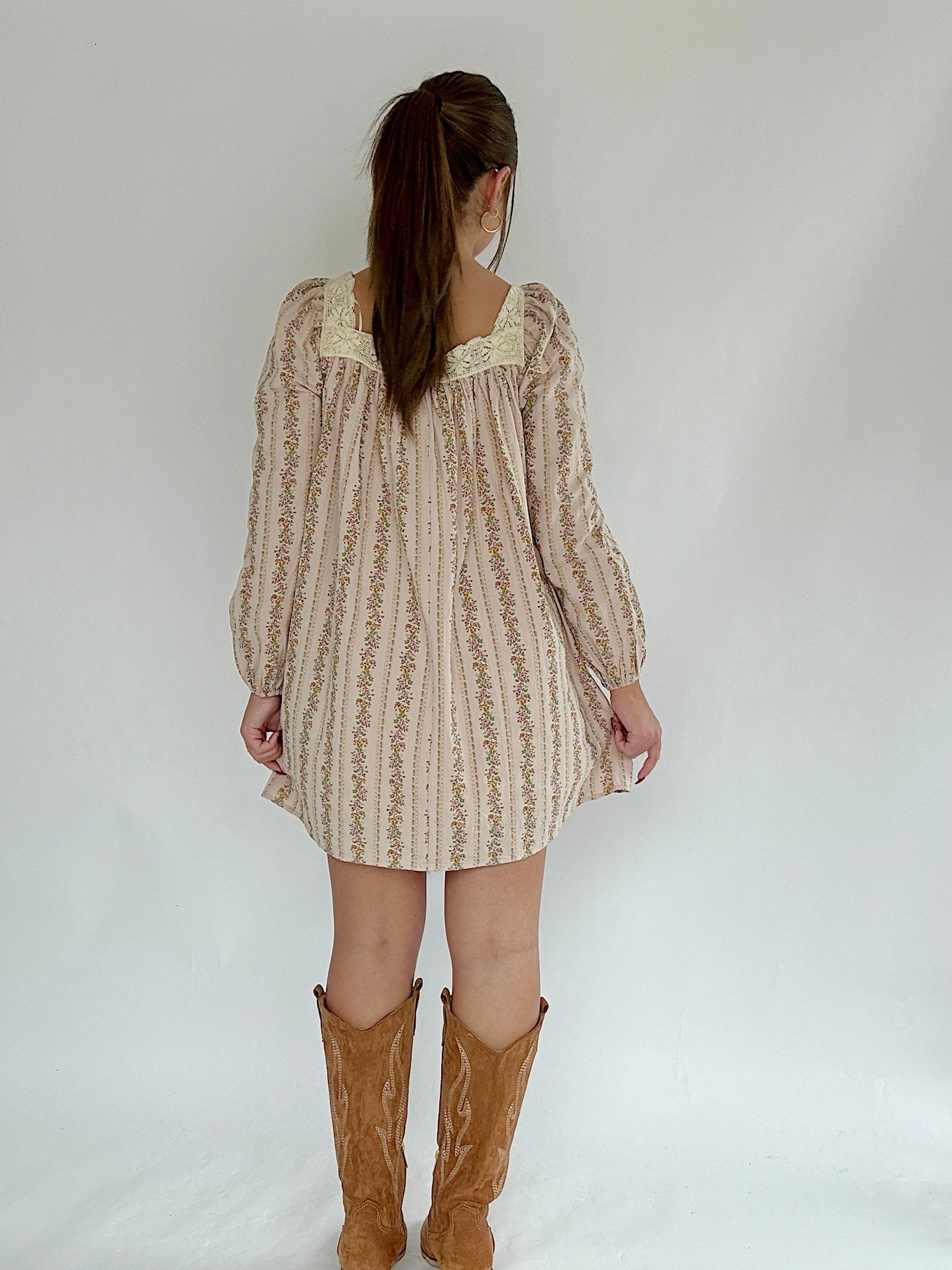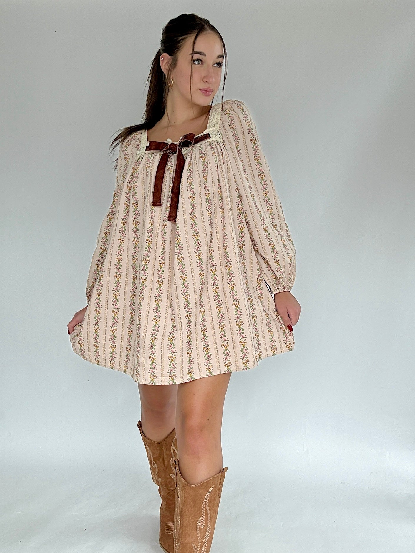 In a soft light khaki color with a dainty floral print arranged in vintage-inspired vertical stripes, it’s finished with a sweet lace-trimmed square neckline and a brown velvet lace tie for a touch of romance. The relaxed, loose silhouette and long bubble sleeves make it the perfect throw-on-and-go dress you’ll wear on repeat.