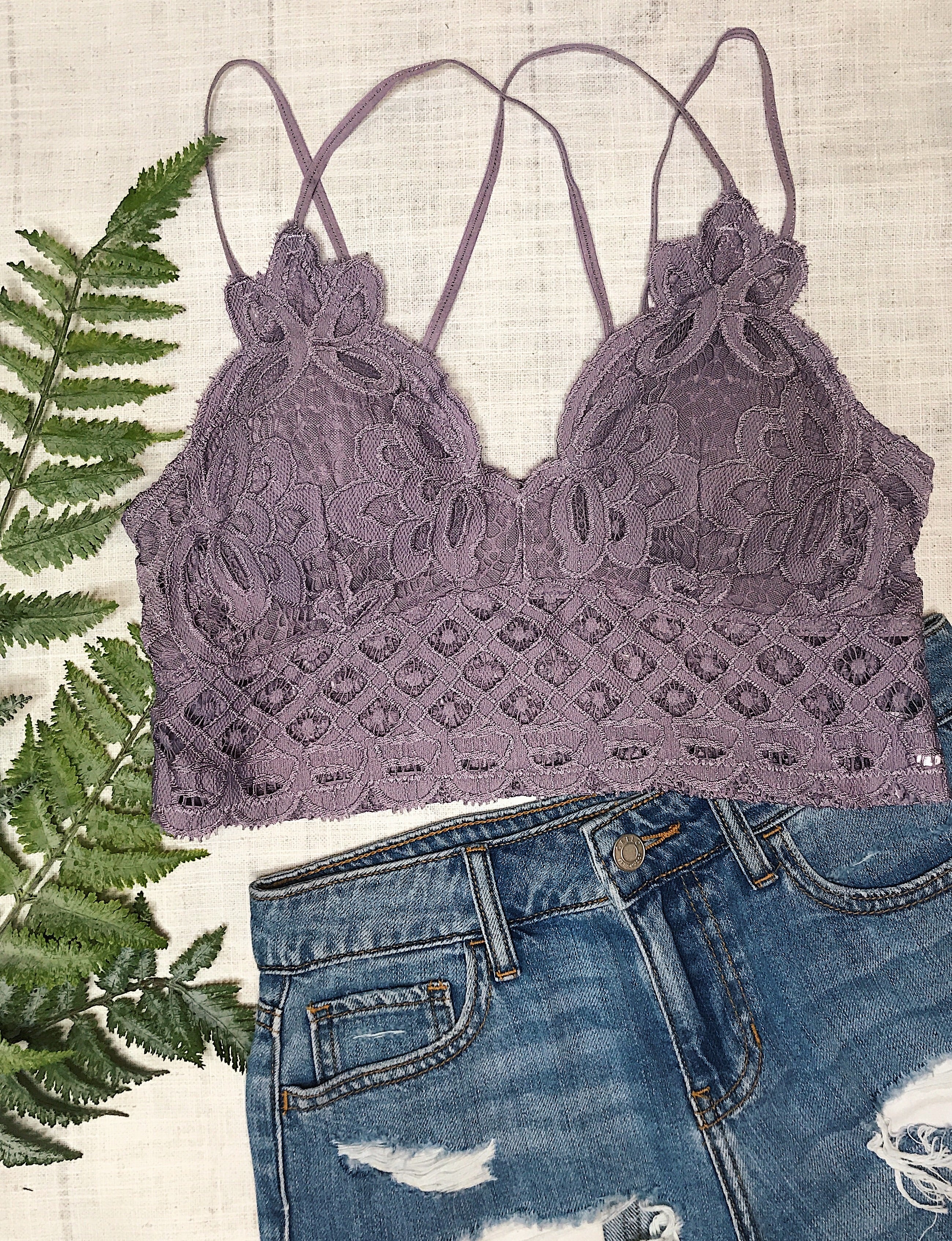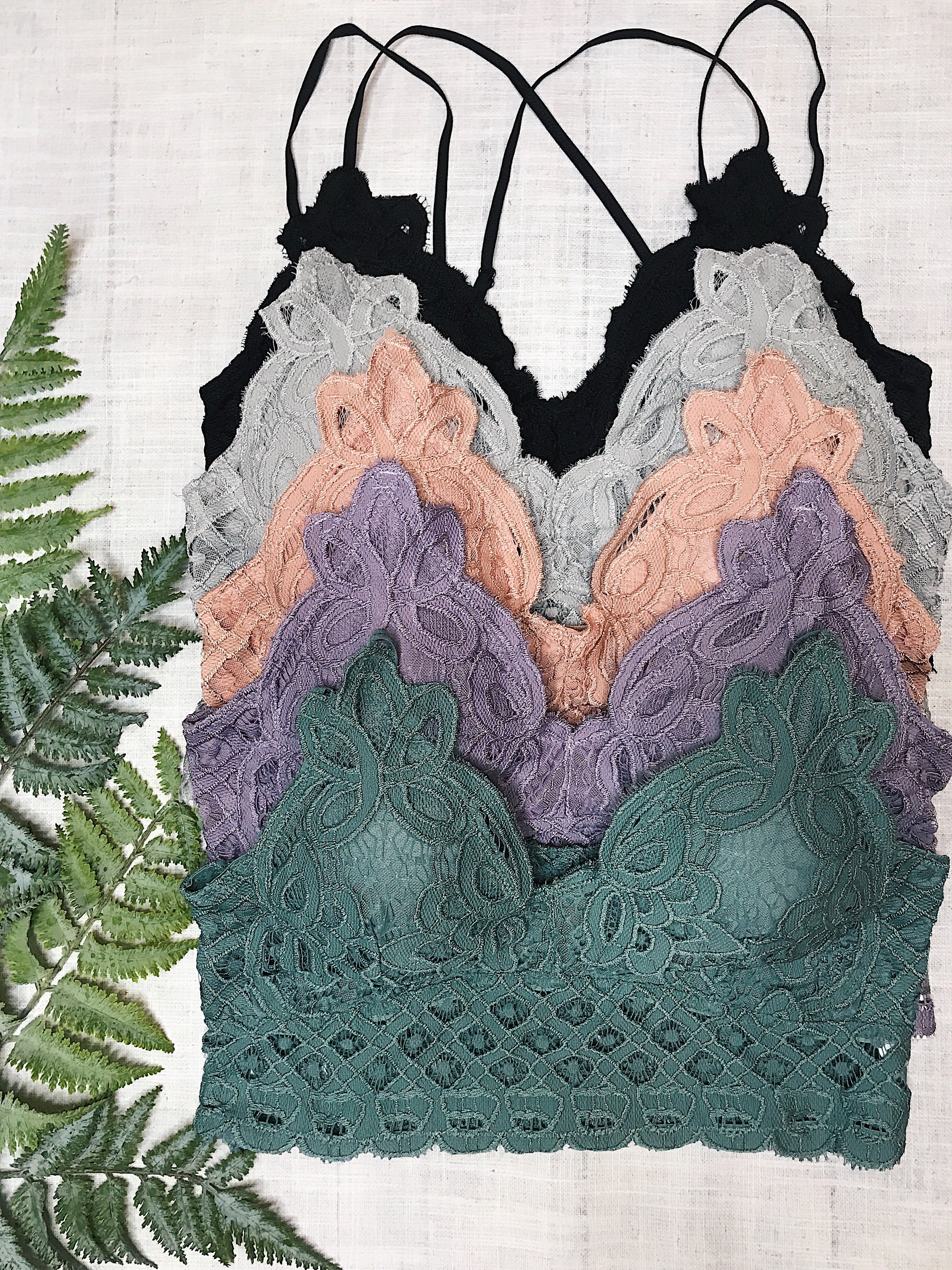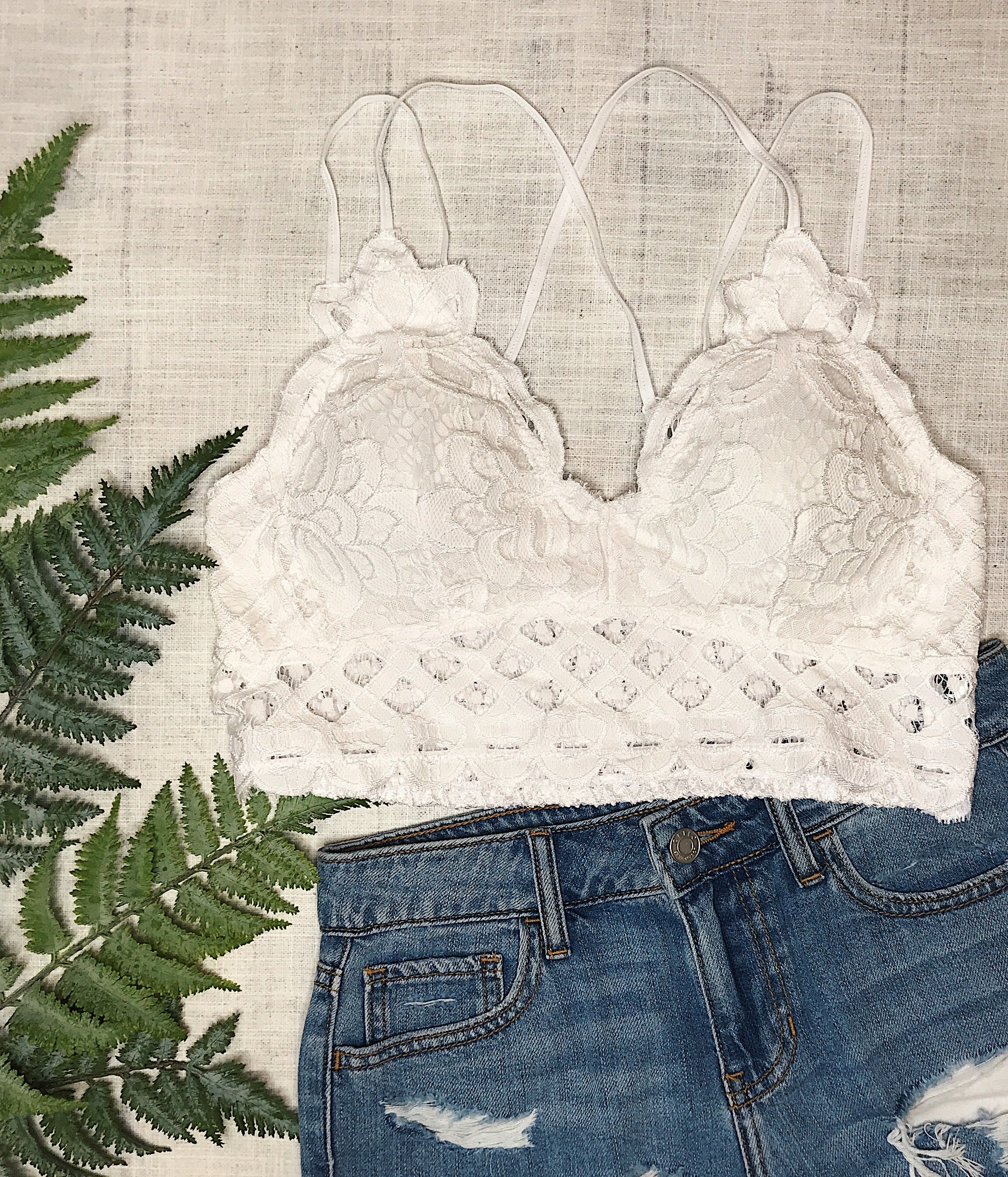 Scalloped floral lace padded bralette with adjustable, double, x-back strap + removable pads. 90% nylon 10% spandex