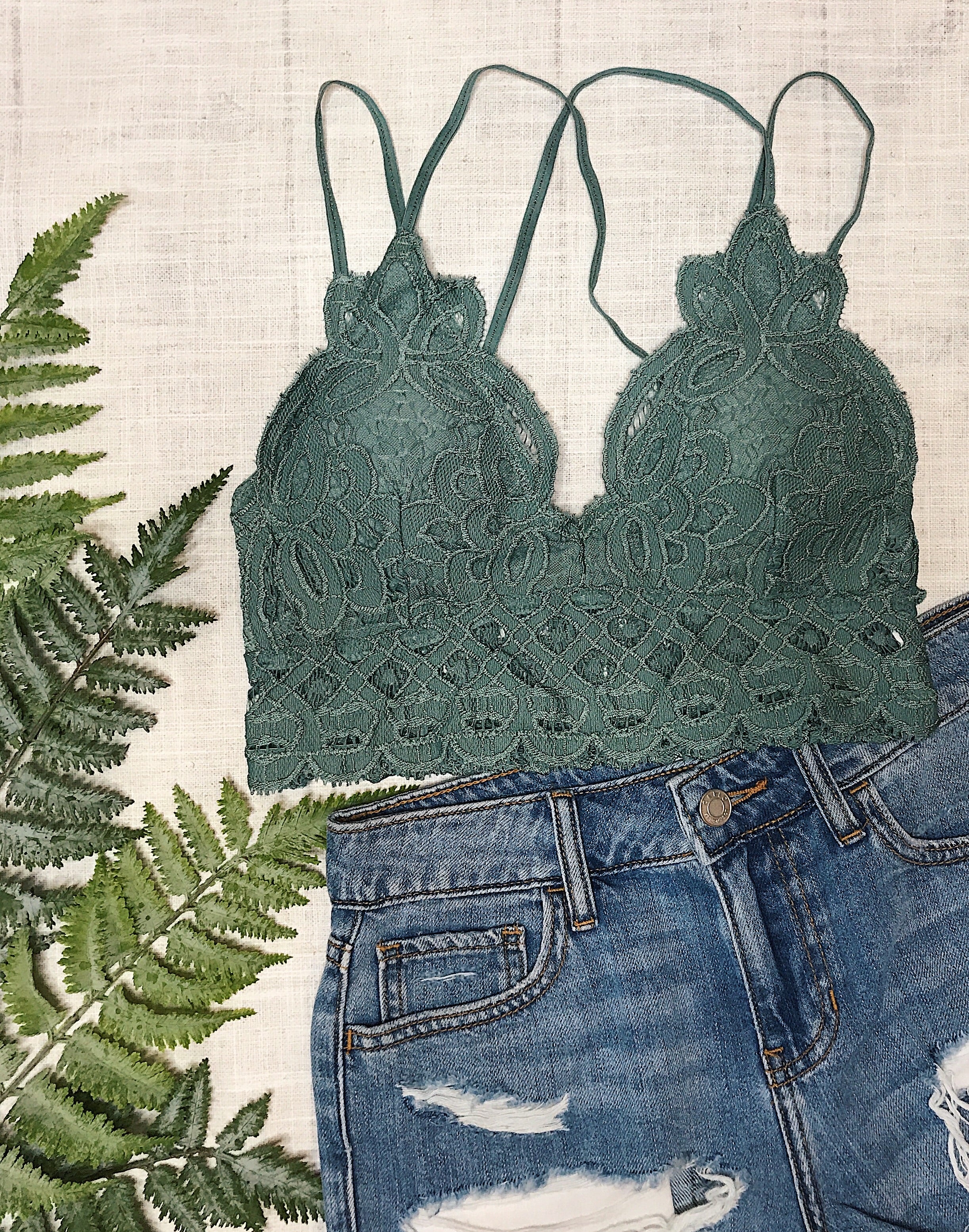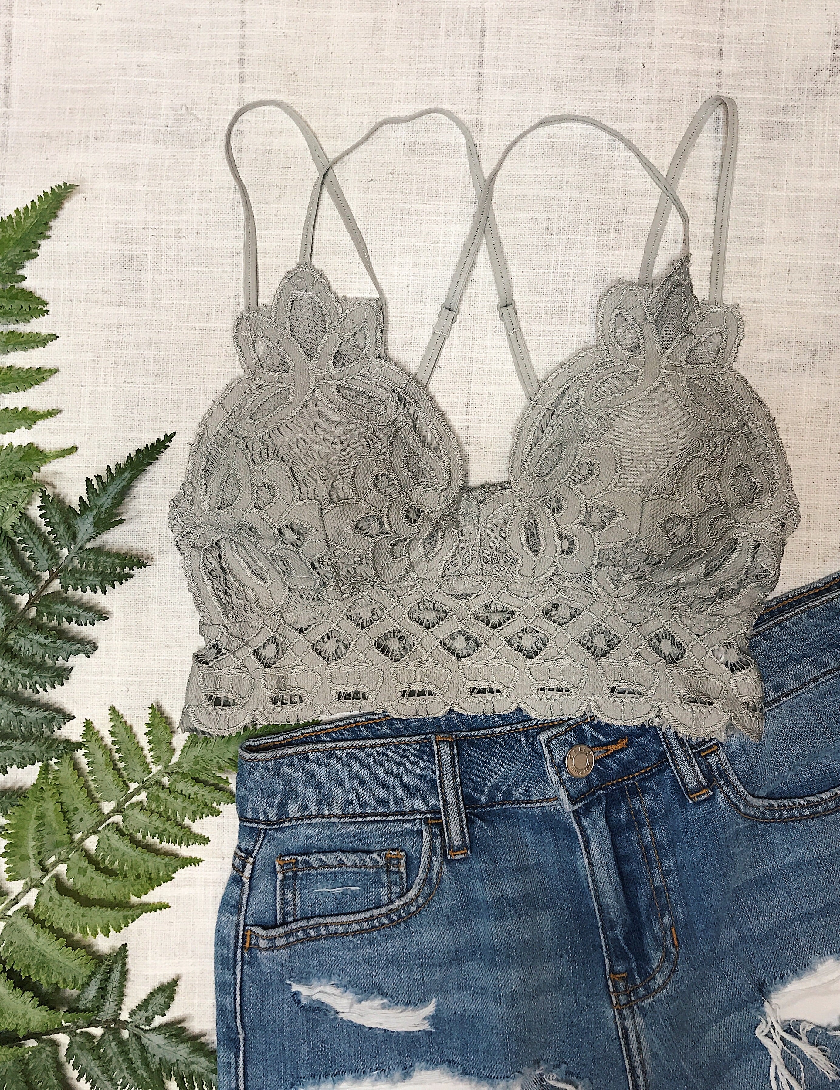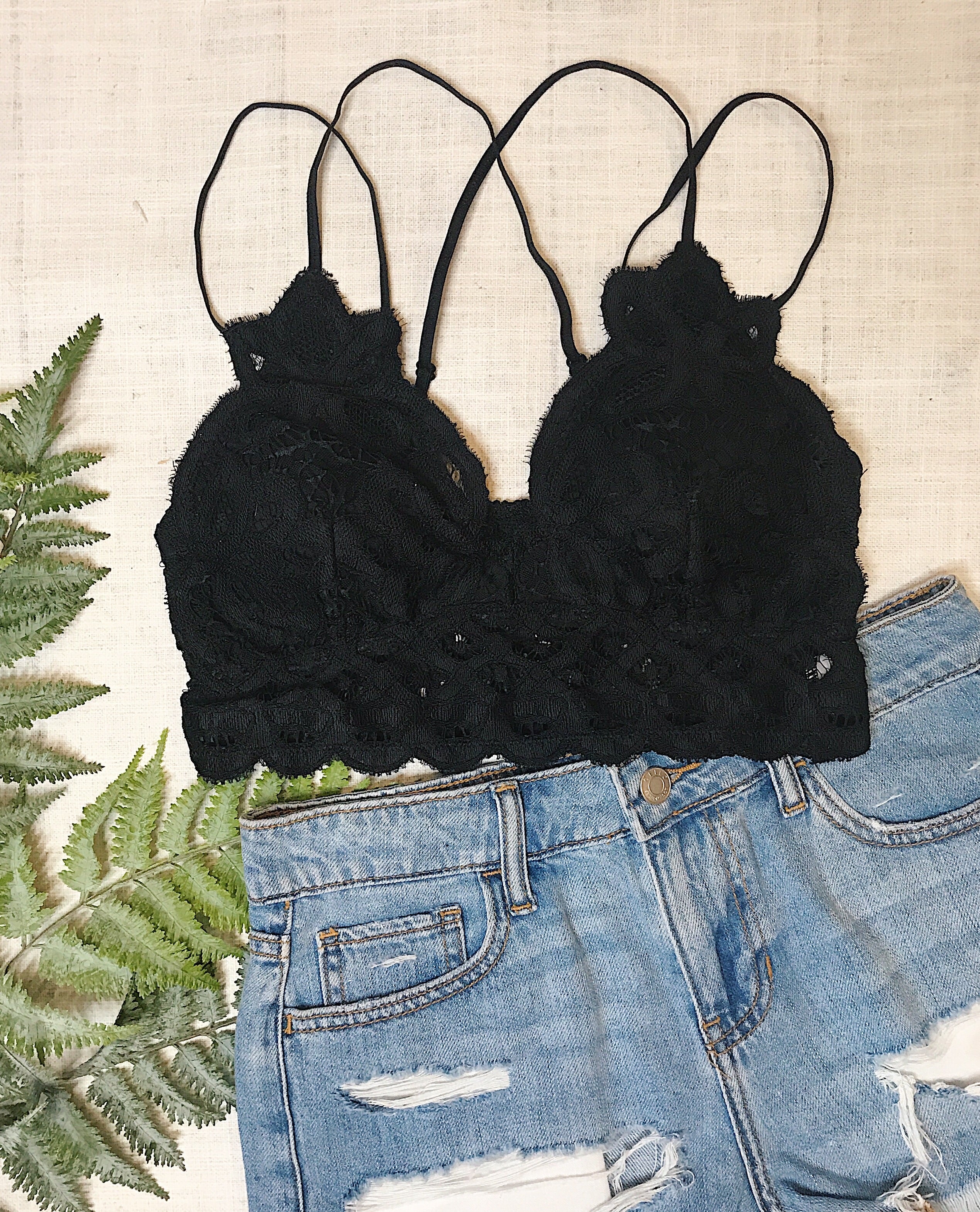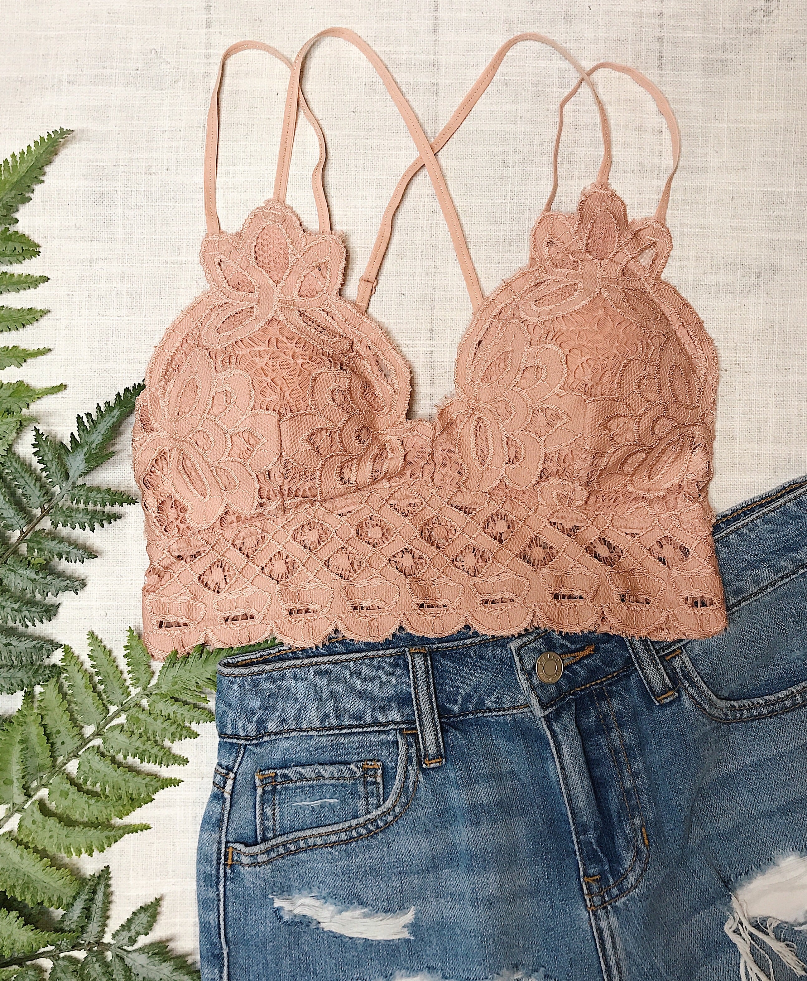 Scalloped floral lace padded bralette with adjustable, double, x-back strap + removable pads. 90% nylon 10% spandex