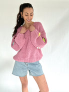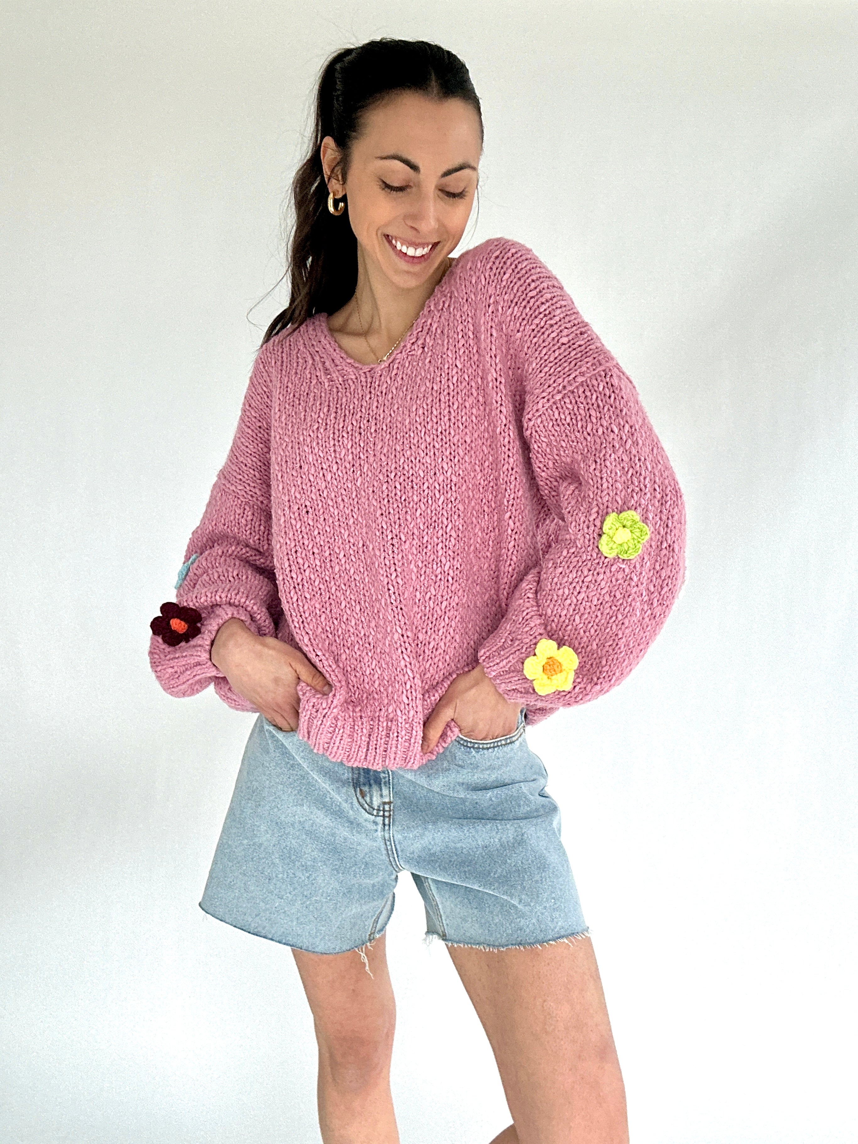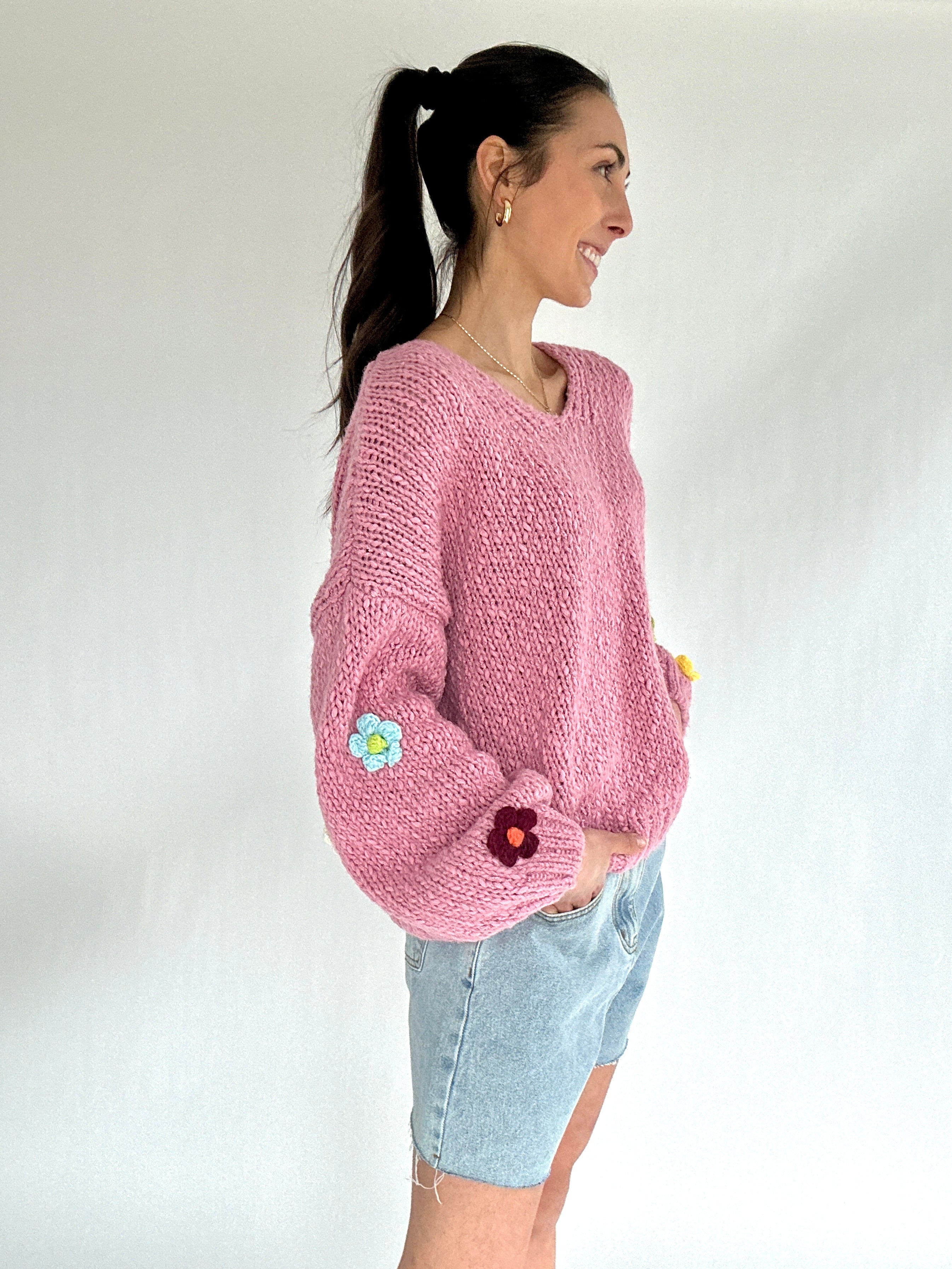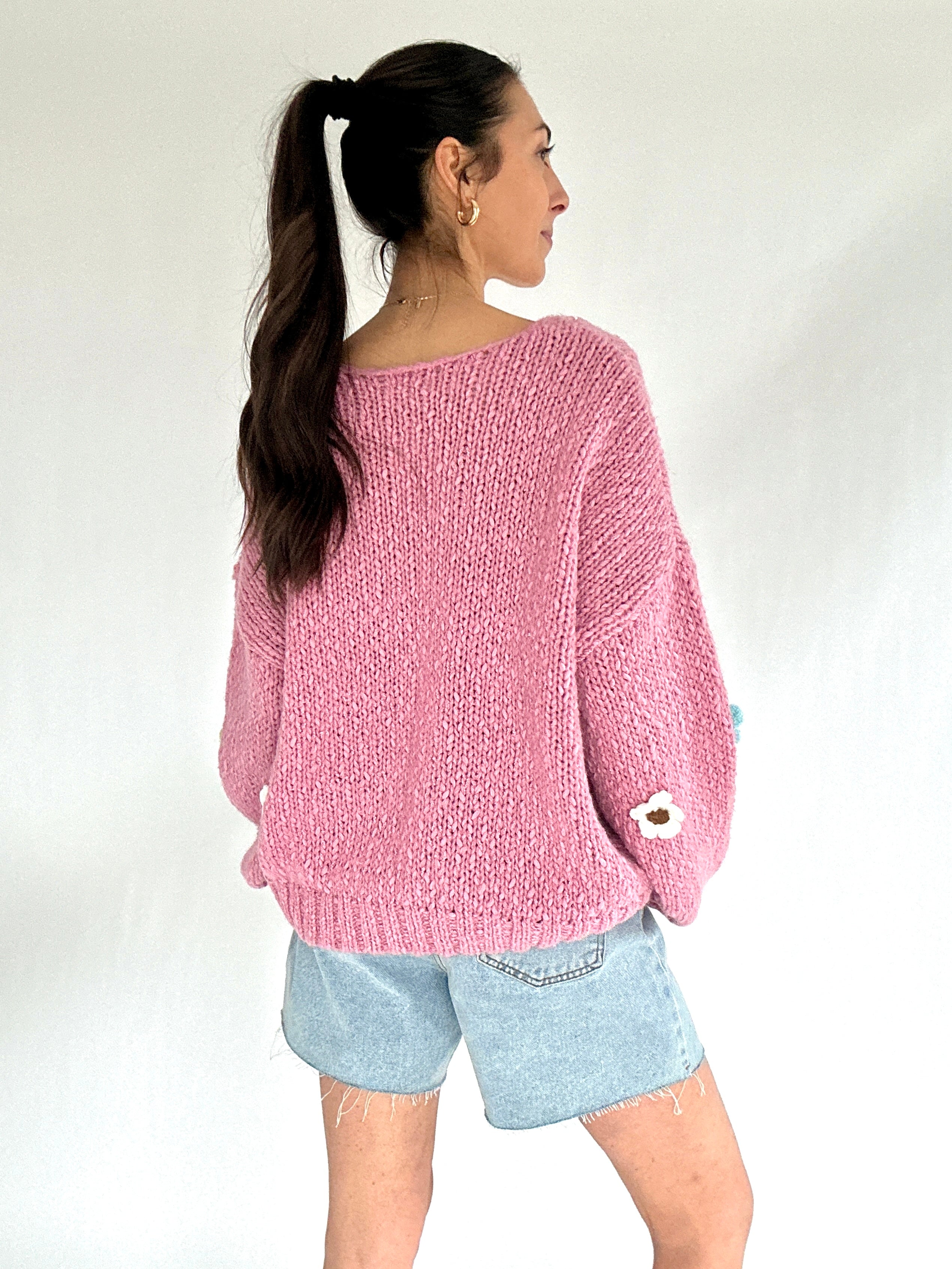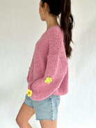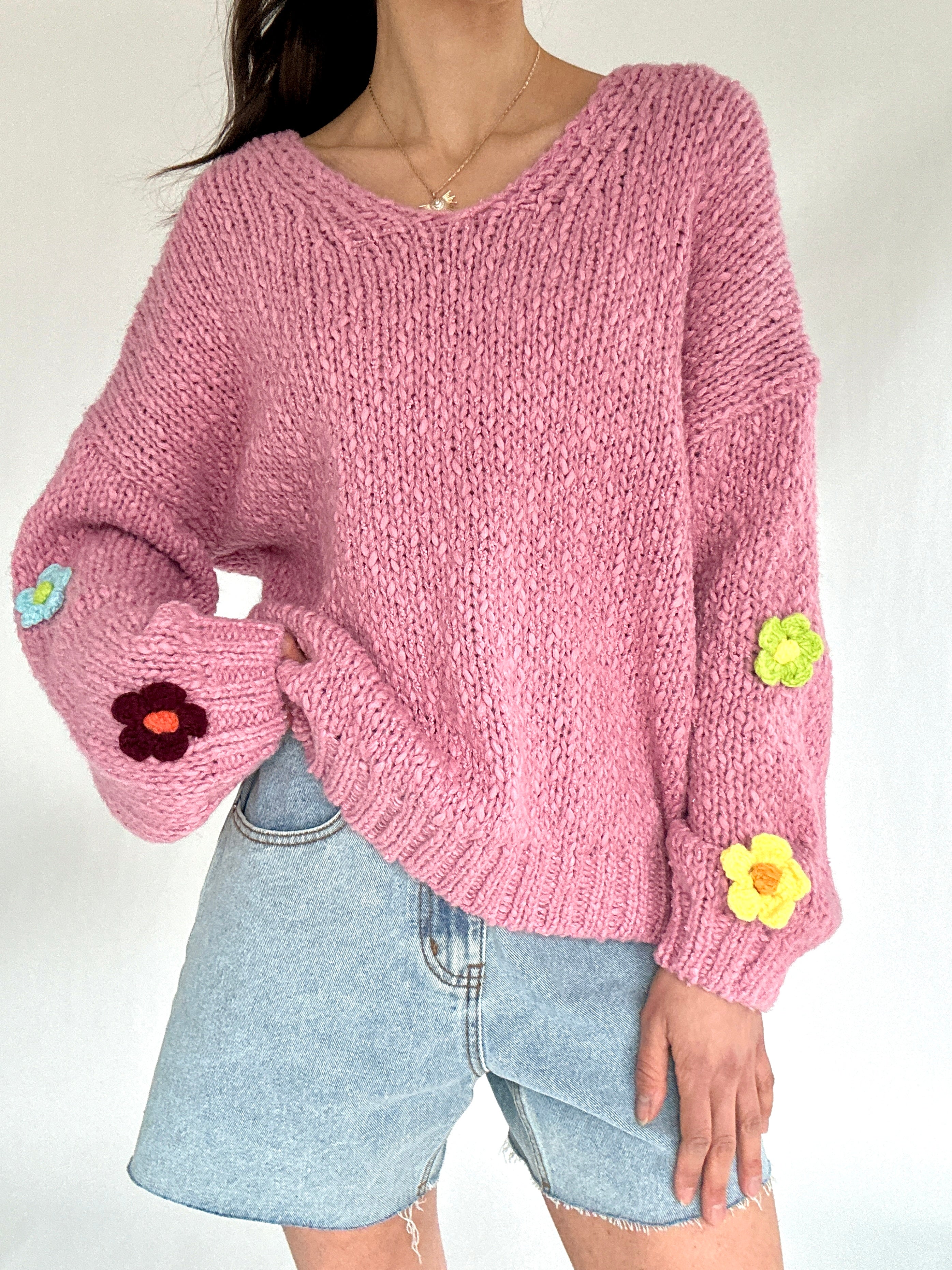 Brighten up your day in the Valley Sweater—soft rose pink knit meets playful embroidered flowers on the bubble sleeves for a look that feels fun and effortless. The rounded v-neckline and dropped shoulders keep it relaxed, while the oversized fit makes it cozy enough to live in all day.